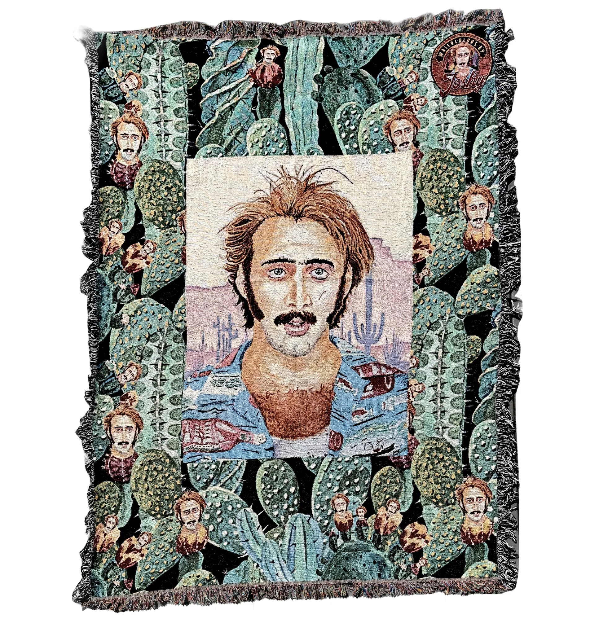 Joshy’s classic Nicolas Cage Raising Arizona “Cactus Acid Trip” design returns in its original full-color, desert-surrealist glory. This is the definitive version of the artwork: bold cactus blooms sprouting Nicolas Cage heads across the all-over print, with his full Raising Arizona–era portrait on the back against a pink-and-dusty-purple Arizona sky.