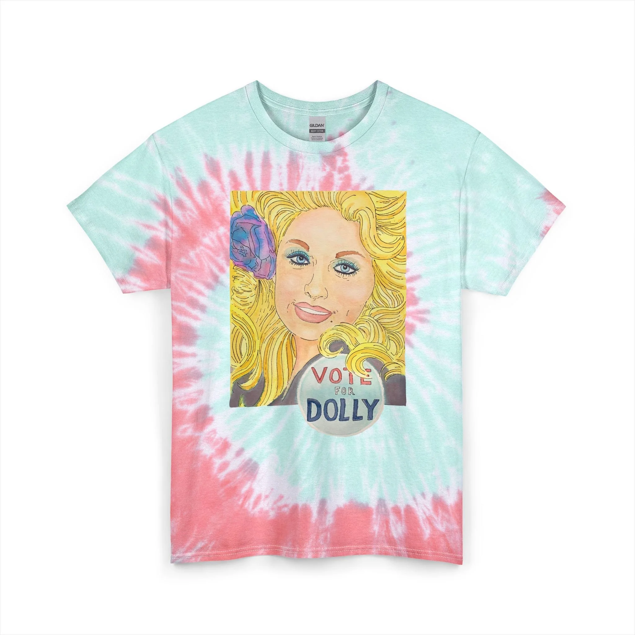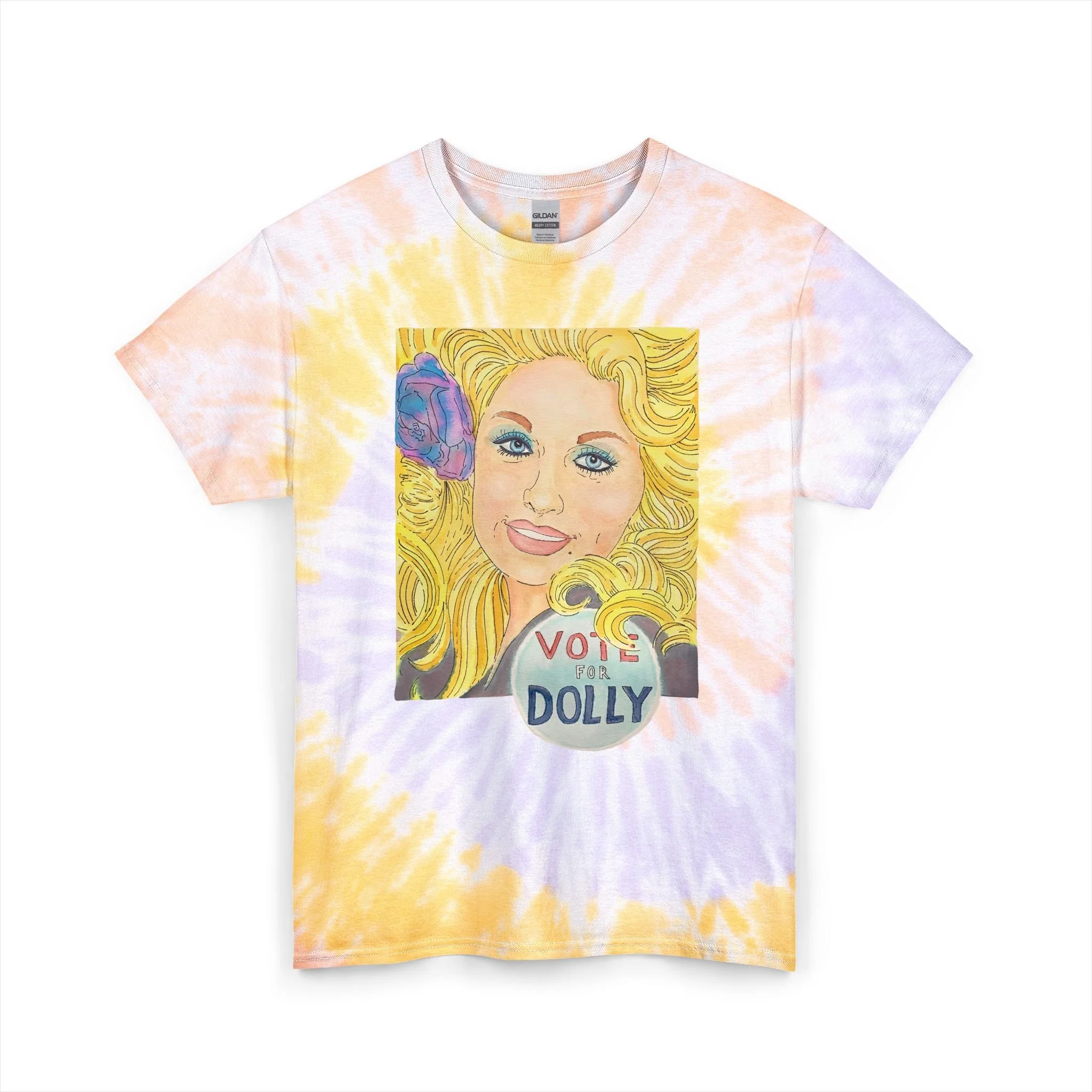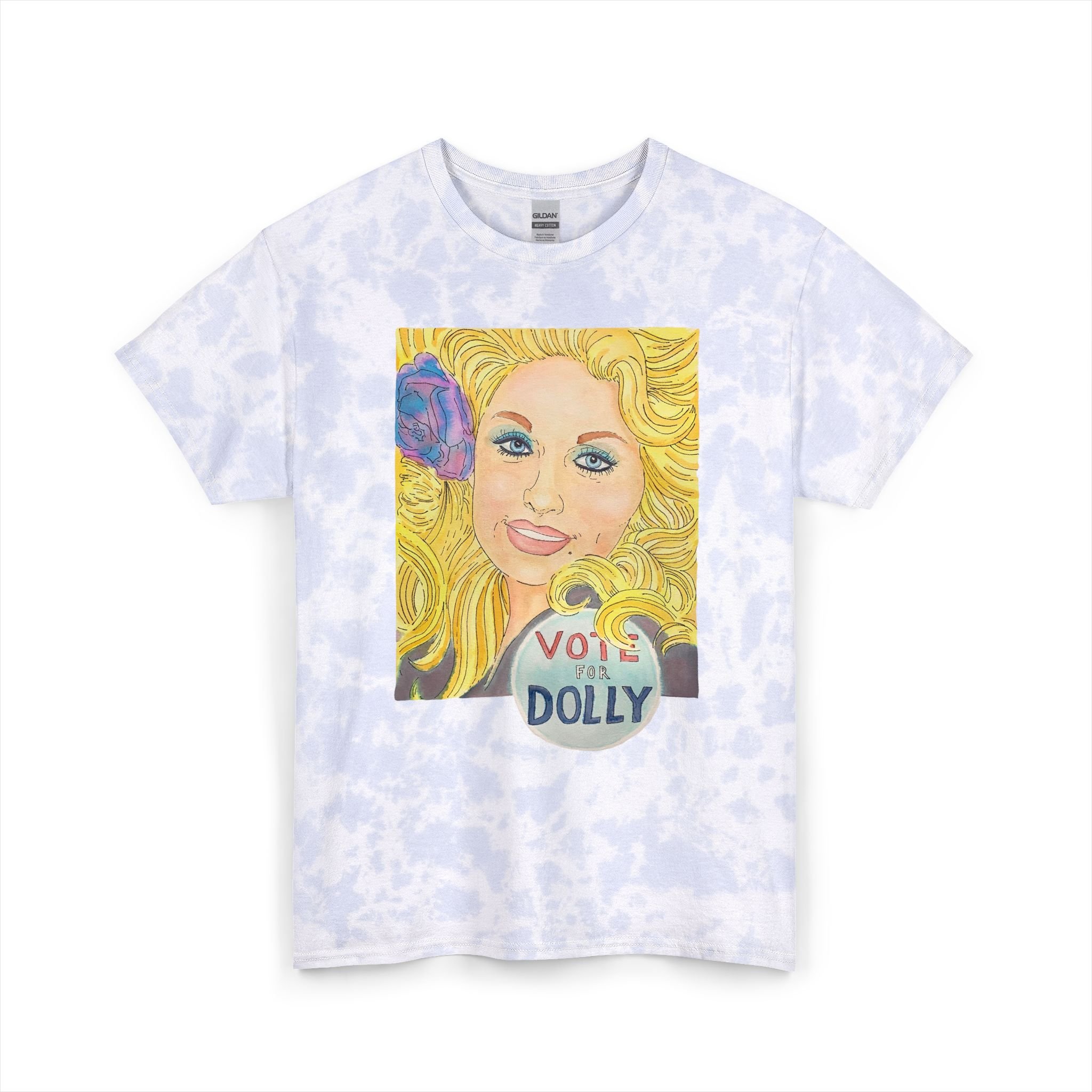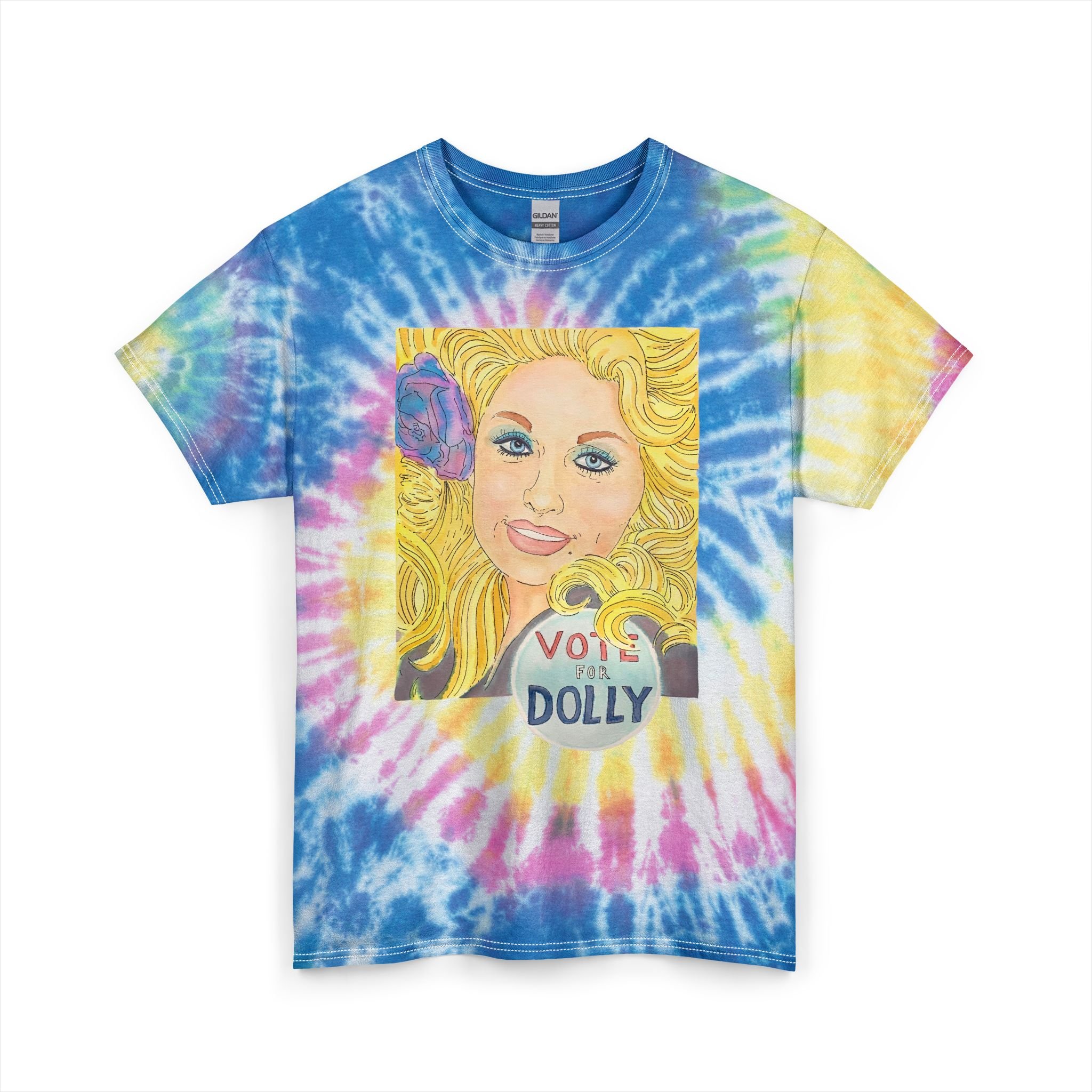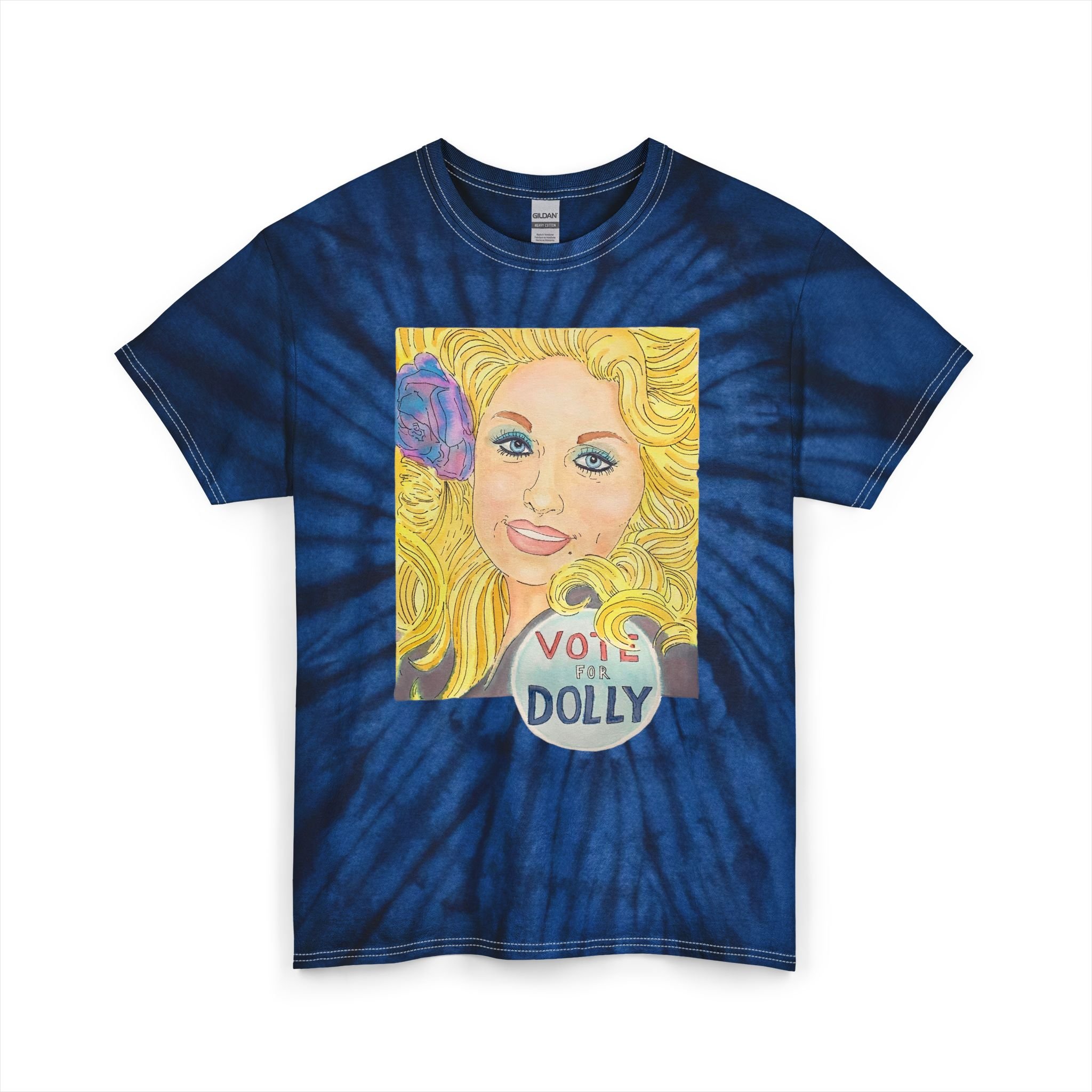 Add a burst of color and a whole lot of heart to your wardrobe with this unisex tie-dye tee featuring Joshy’s original Vote for Dolly watercolor painting. The artwork spotlights Dolly Parton with her iconic big hair, a soft purple flower tucked in, and a hand-painted blue circle at the base with “Vote for Dolly” lettered inside—an homage to a vintage Vermont shop pin that sparked the inspiration. Printed front-and-center on cotton that feels as rad as it looks, this tee brings together bold art, retro tie-dye, and everyday comfort.