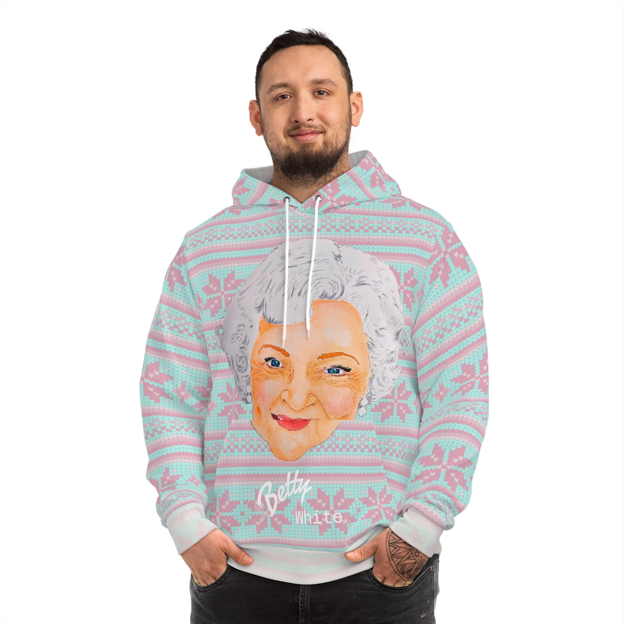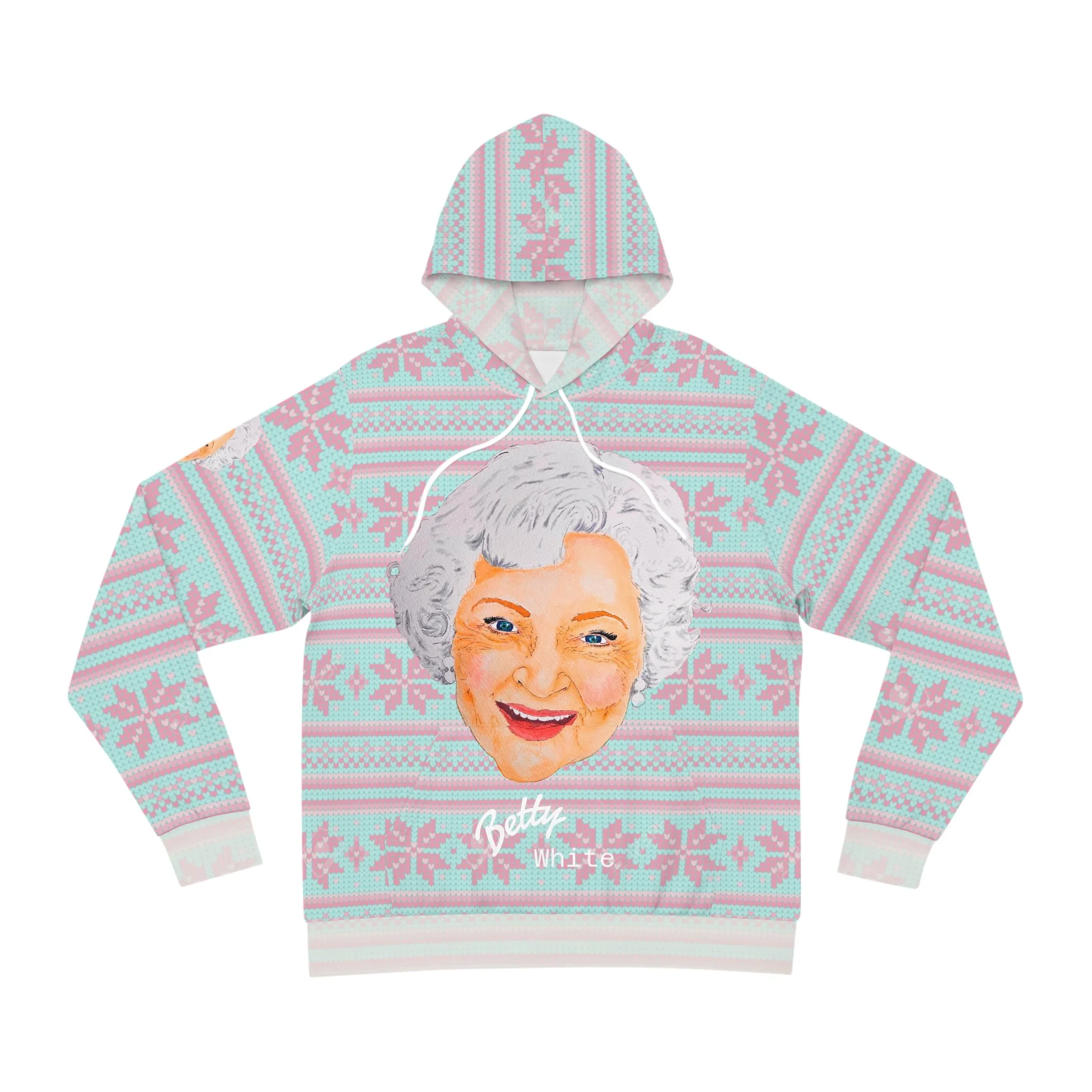 Celebrate the season with Joshy’s original watercolor portrait of America’s favorite Golden Girl — Betty White. This festive all-over print hoodie features Joshy’s hand-painted Betty front and center, surrounded by a soft, faded snowflake Christmas sweater–style pattern that brings cozy holiday charm.