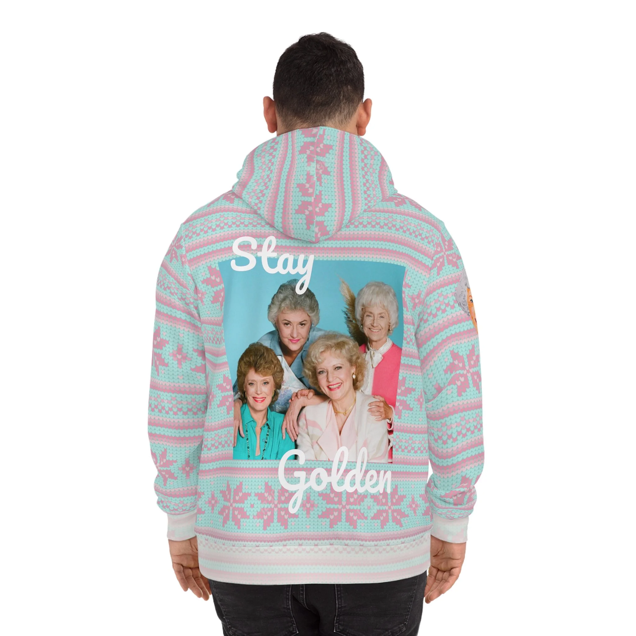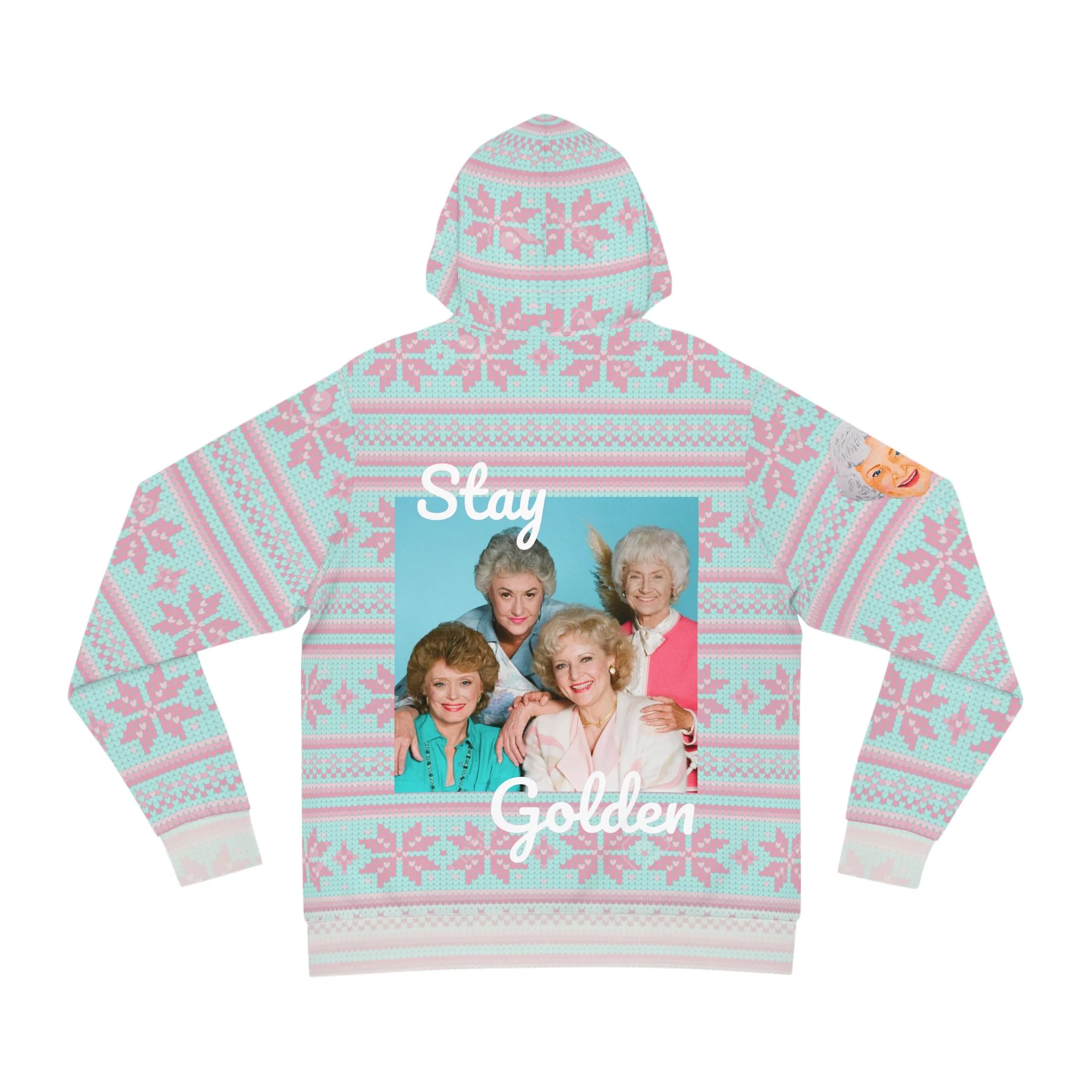 The back reads “Stay Golden” surrounding a retro photo of The Golden Girls posing together. The inner hood, cuffs, and waistband carry the same snowflake pattern in an extra-faded wash for a soft contrast pop — subtle and nostalgic.