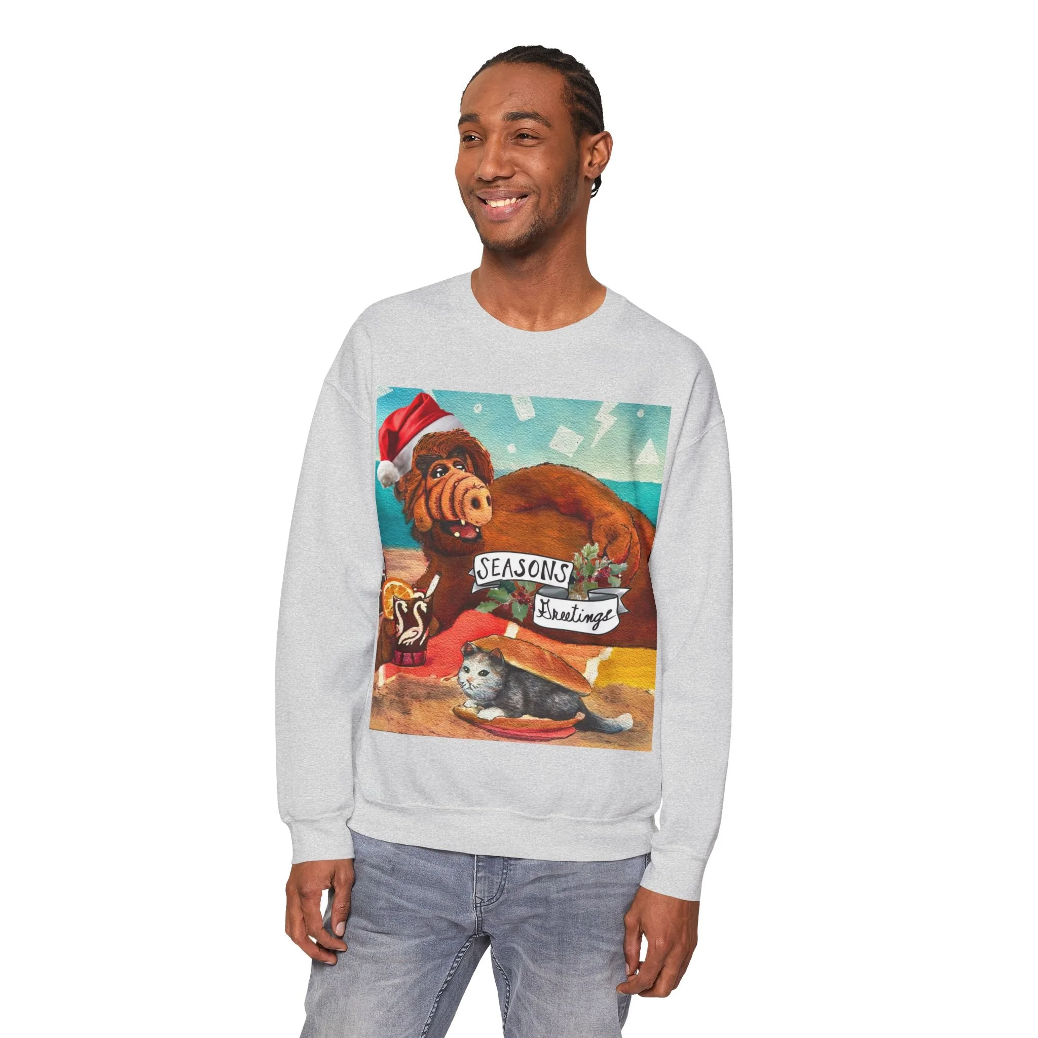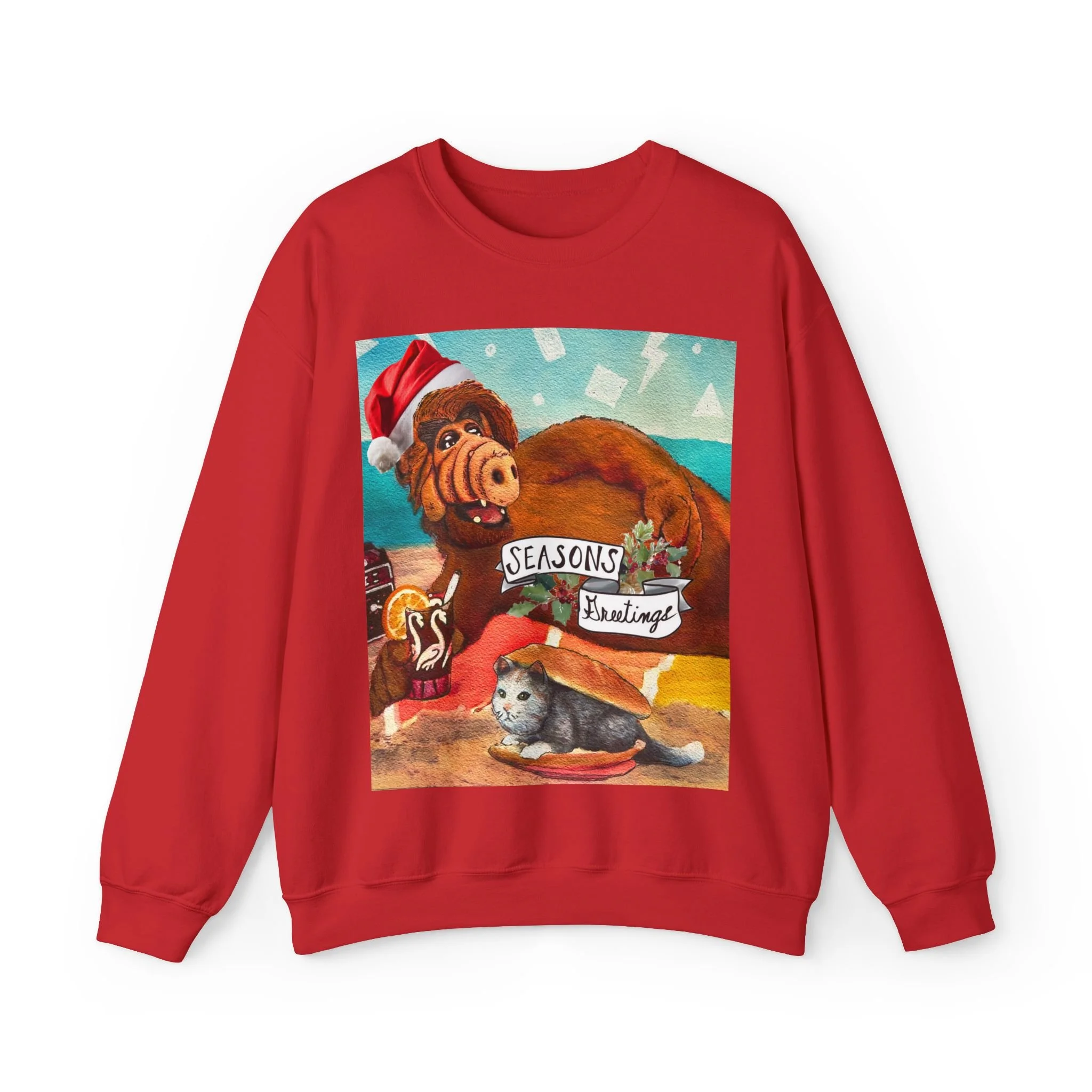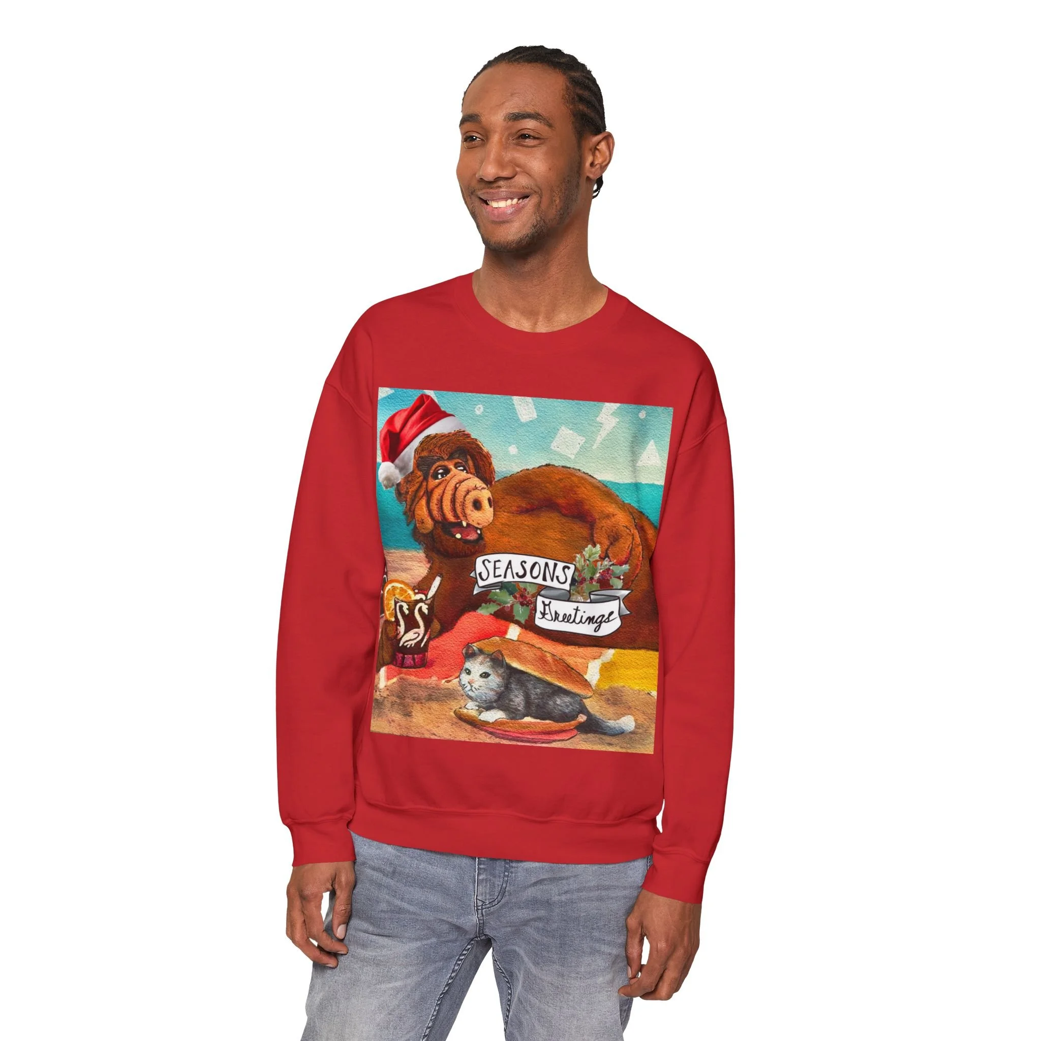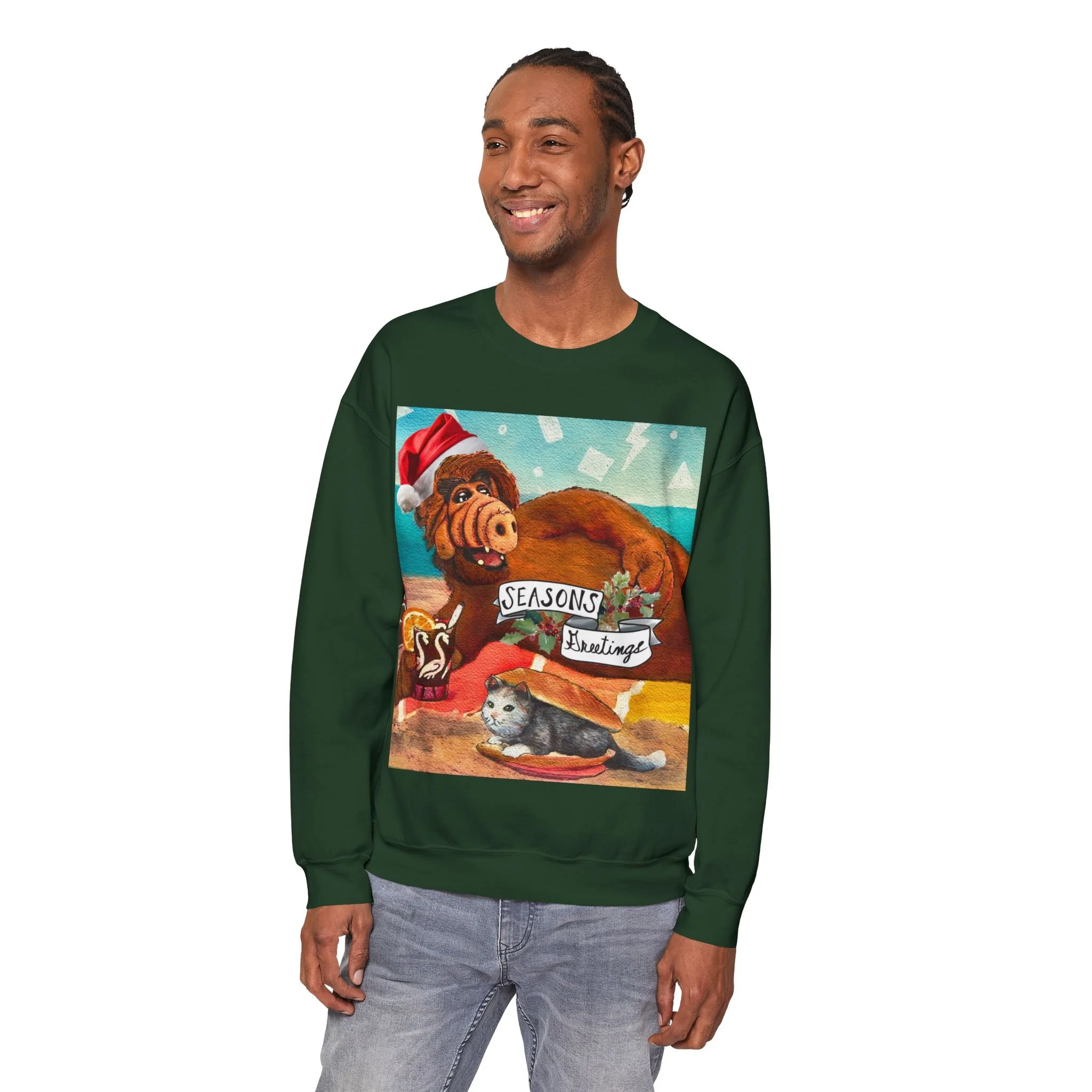 ALF with Cat Sandwich Christmas Sweatshirt - 80s TV Alien Holiday Pullover