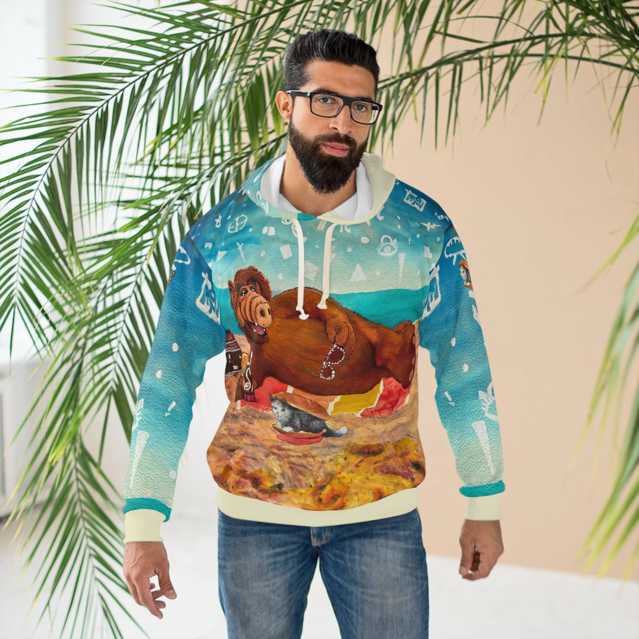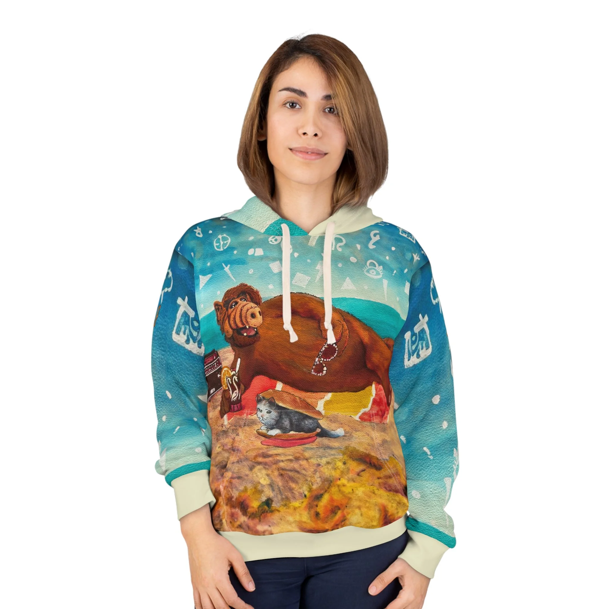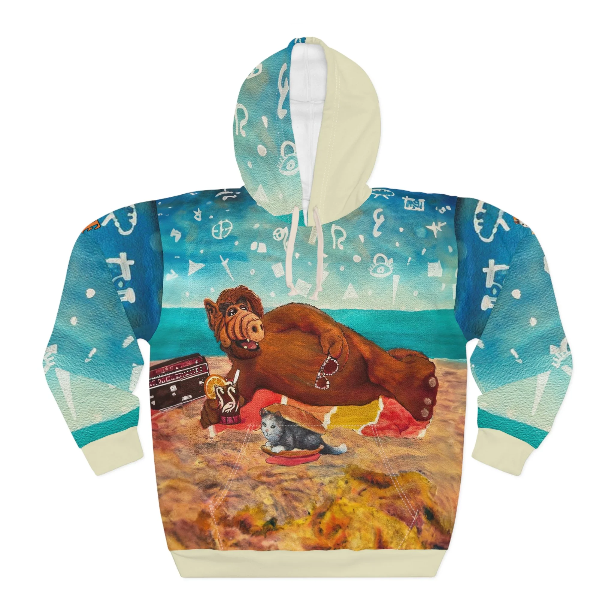 This Pullover Hoodie is made for warmth and comfort. Made to be easily customizable without white lines at the seams, this all-over print pullover hoodie is waiting for you to add a great design and it instantly becomes fashionable. It features a large front pocket, a hood with a drawstring, and is custom cut and sewn.