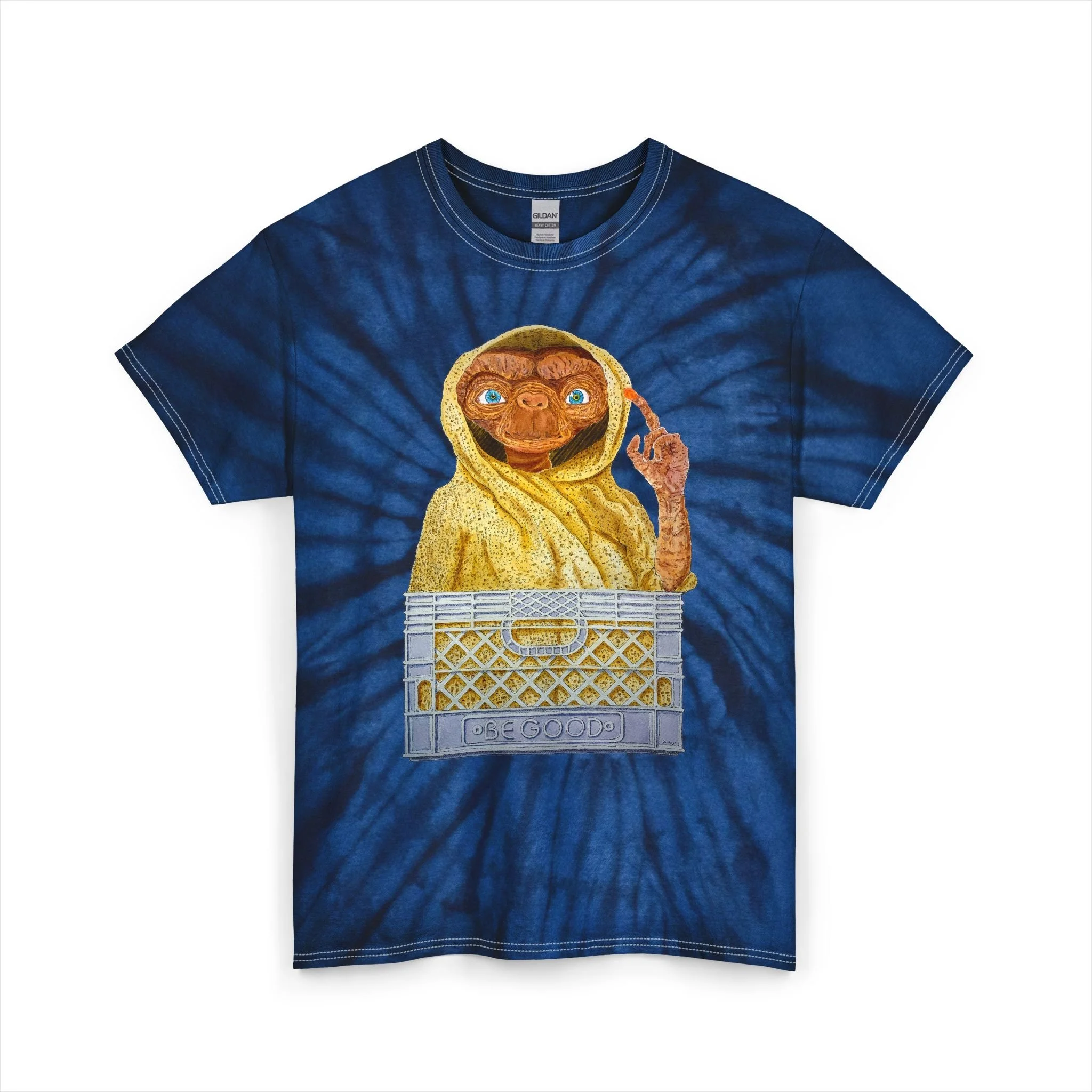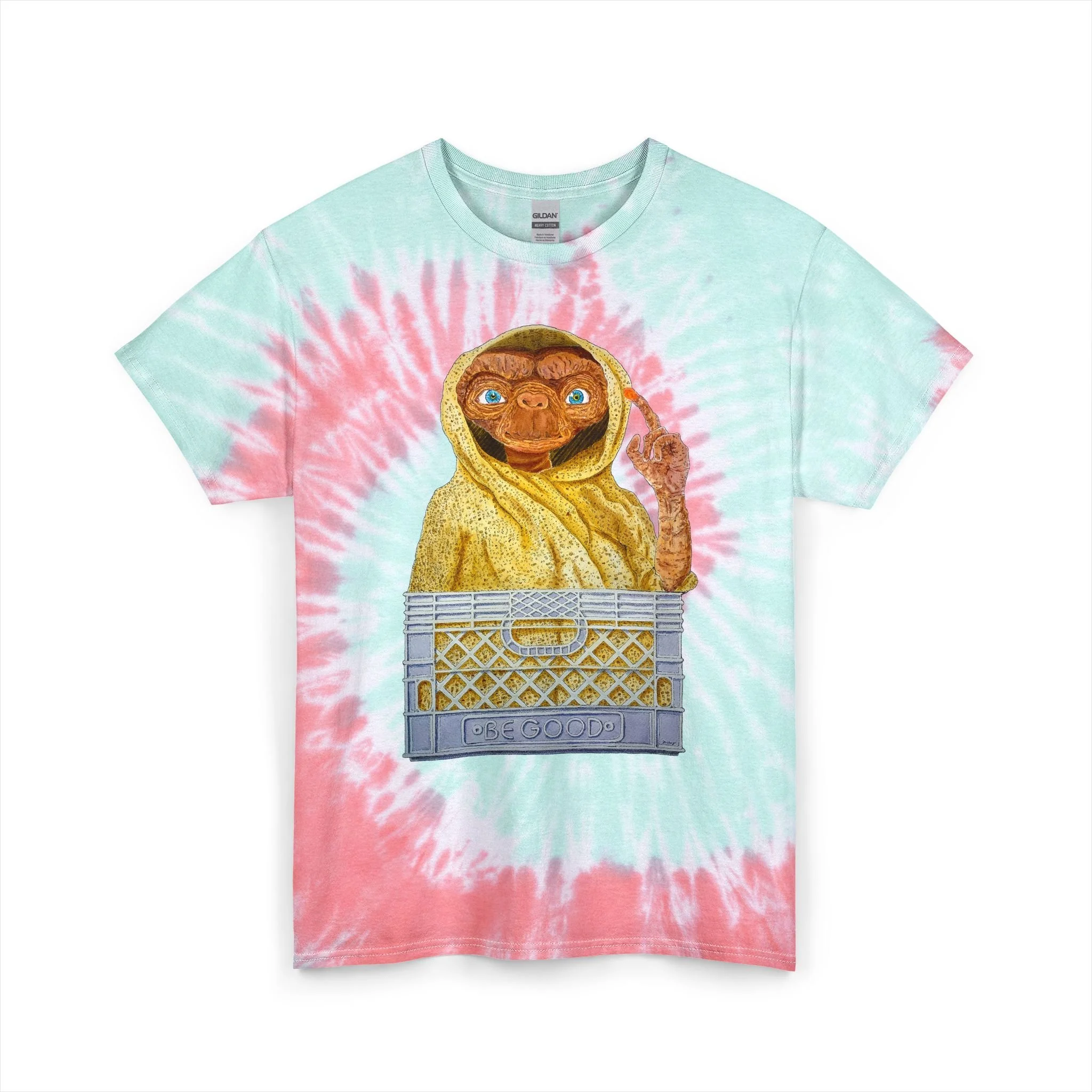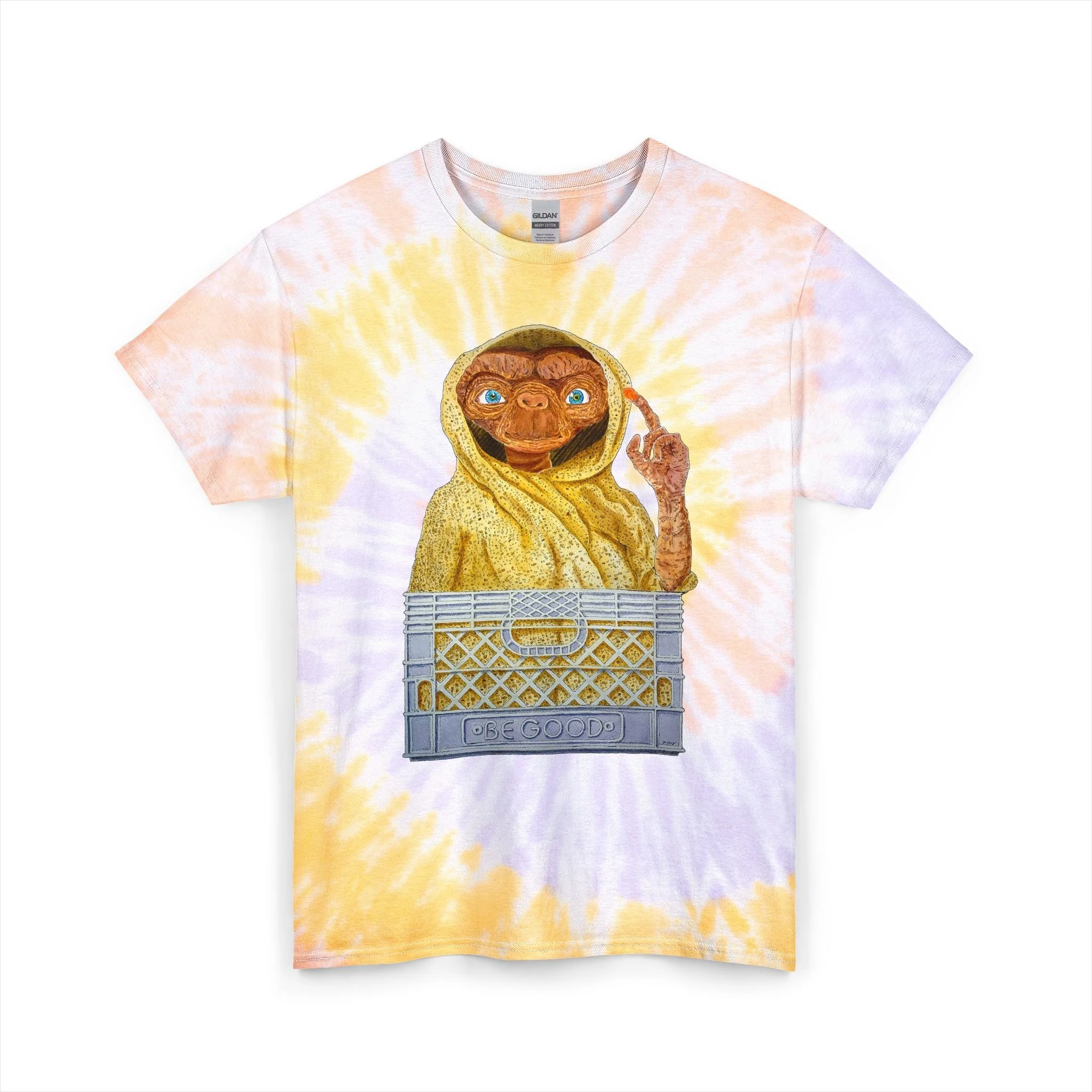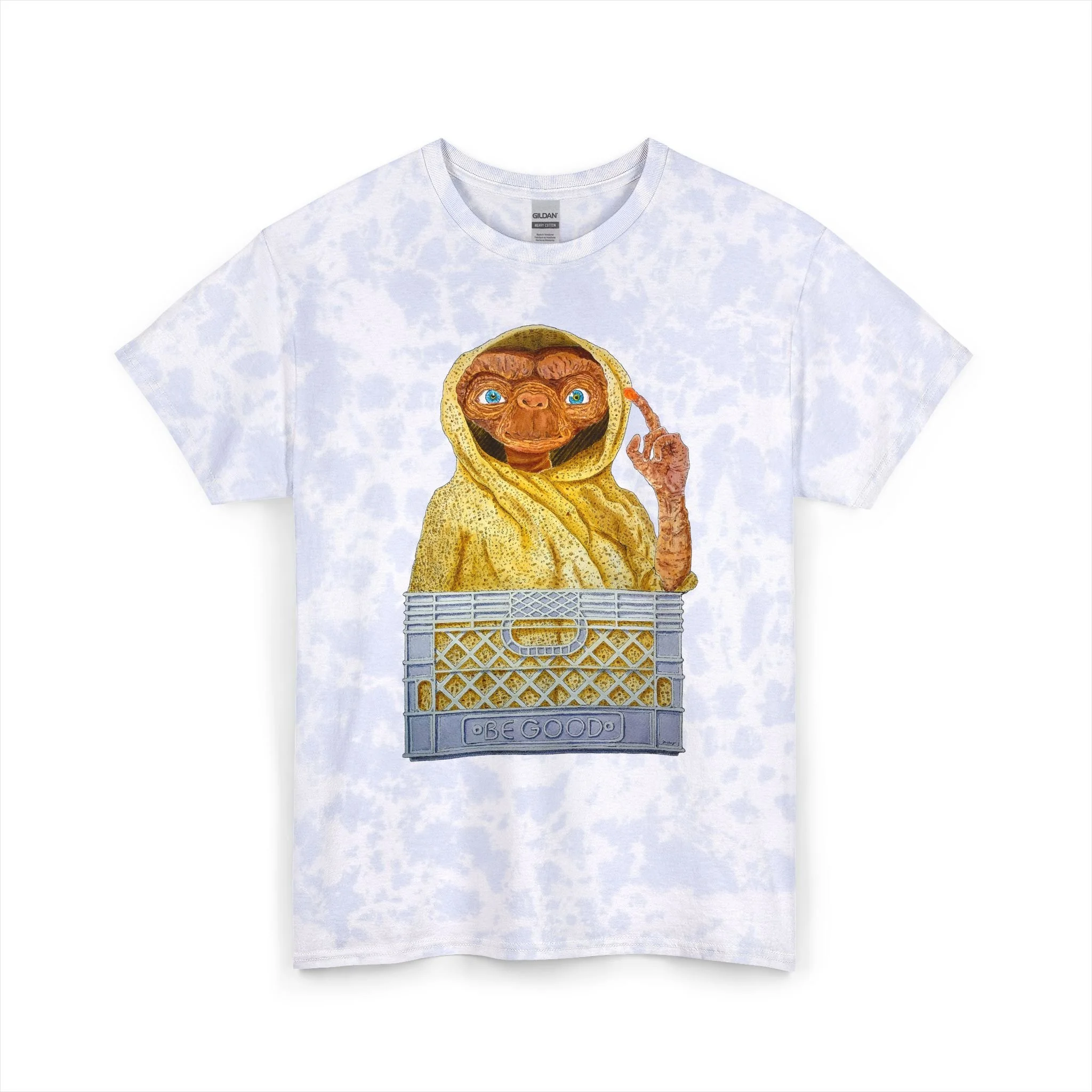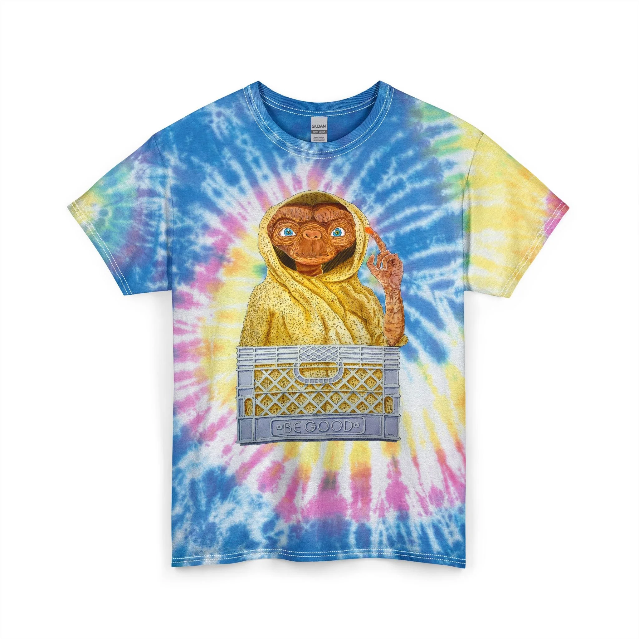 Bring a burst of retro sci-fi charm to your lineup with this unisex tie-dye tee featuring Joshy’s original watercolor painting of E.T. riding in Elliot’s bicycle milk crate. The artwork showcases E.T. nestled in the crate with “Be Good” hand-painted across the lower panel—an homage to the most iconic moment of the film, reimagined in Joshy’s signature wearable watercolor style. Printed front-and-center on a unique tie-dyed base, every shirt has its own one-of-a-kind pattern, making each piece naturally distinct.