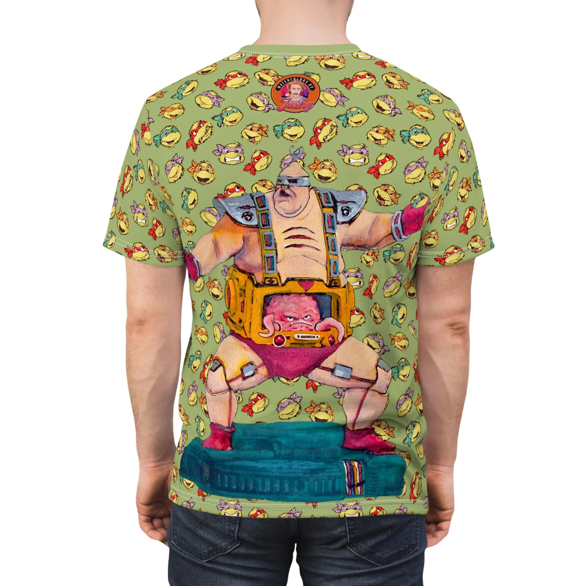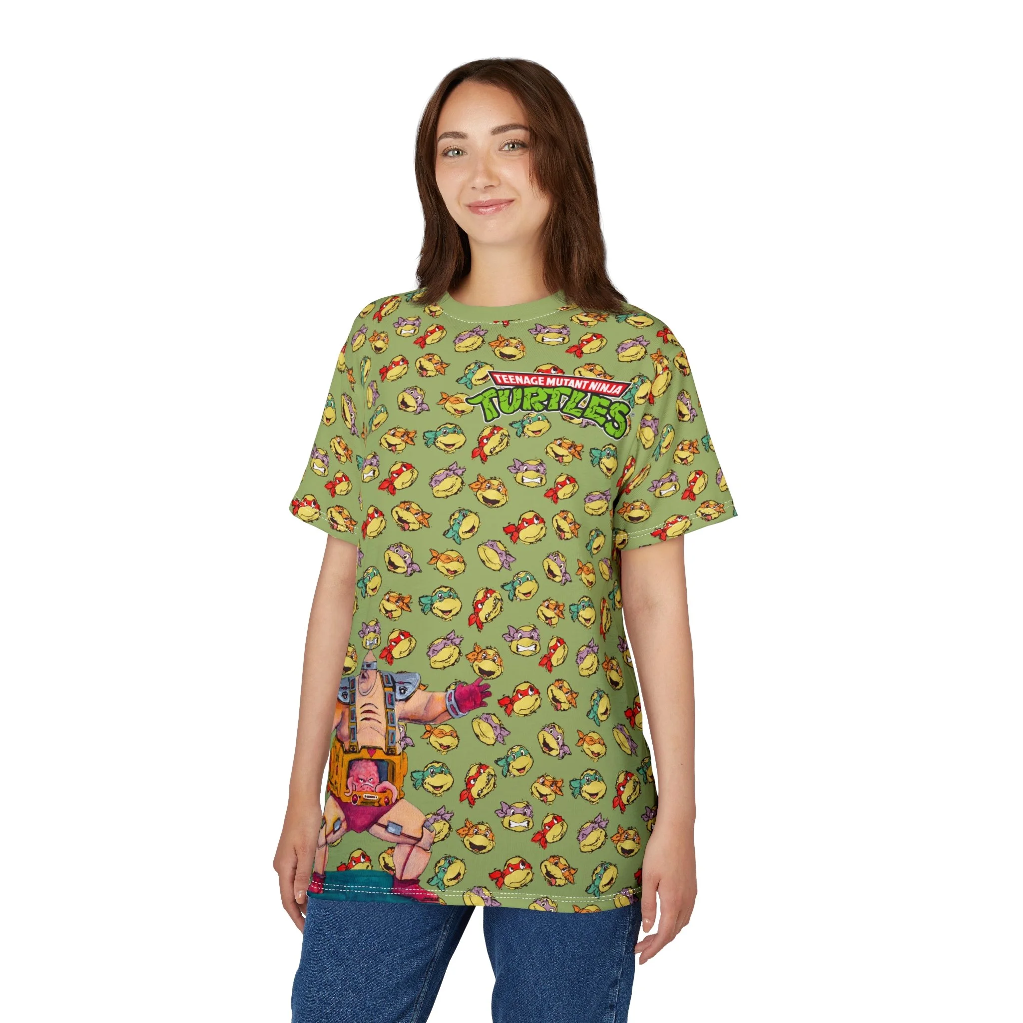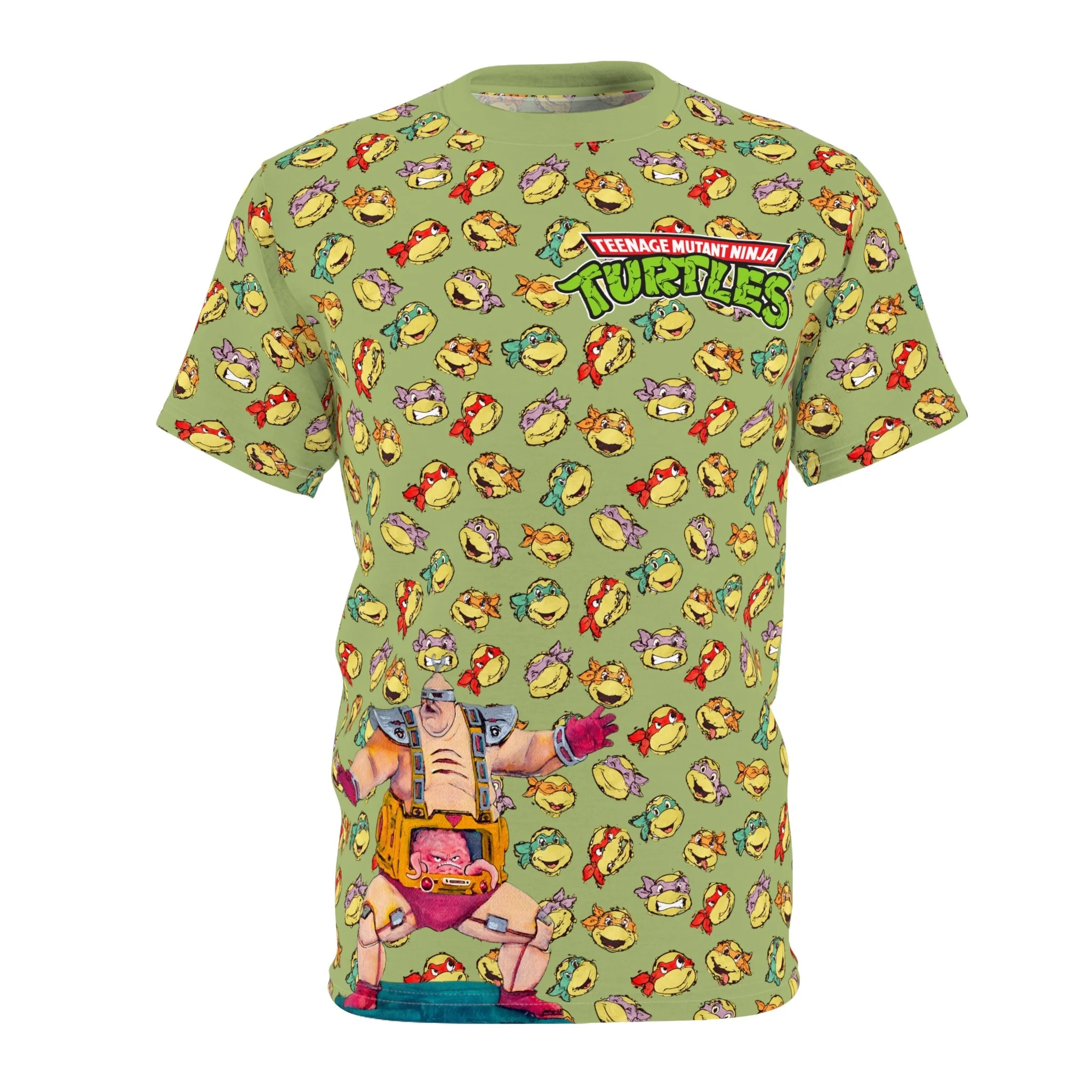 This tee brings the retro villain Krang to life with bold, eye-catching artwork. The left chest features the classic Teenage Mutant Ninja Turtles logo, while Krang makes an appearance at the bottom right front. On the back, Krang dominates the design in a giant print, set against a vibrant backdrop of the Turtles’ faces in an all-over pattern.