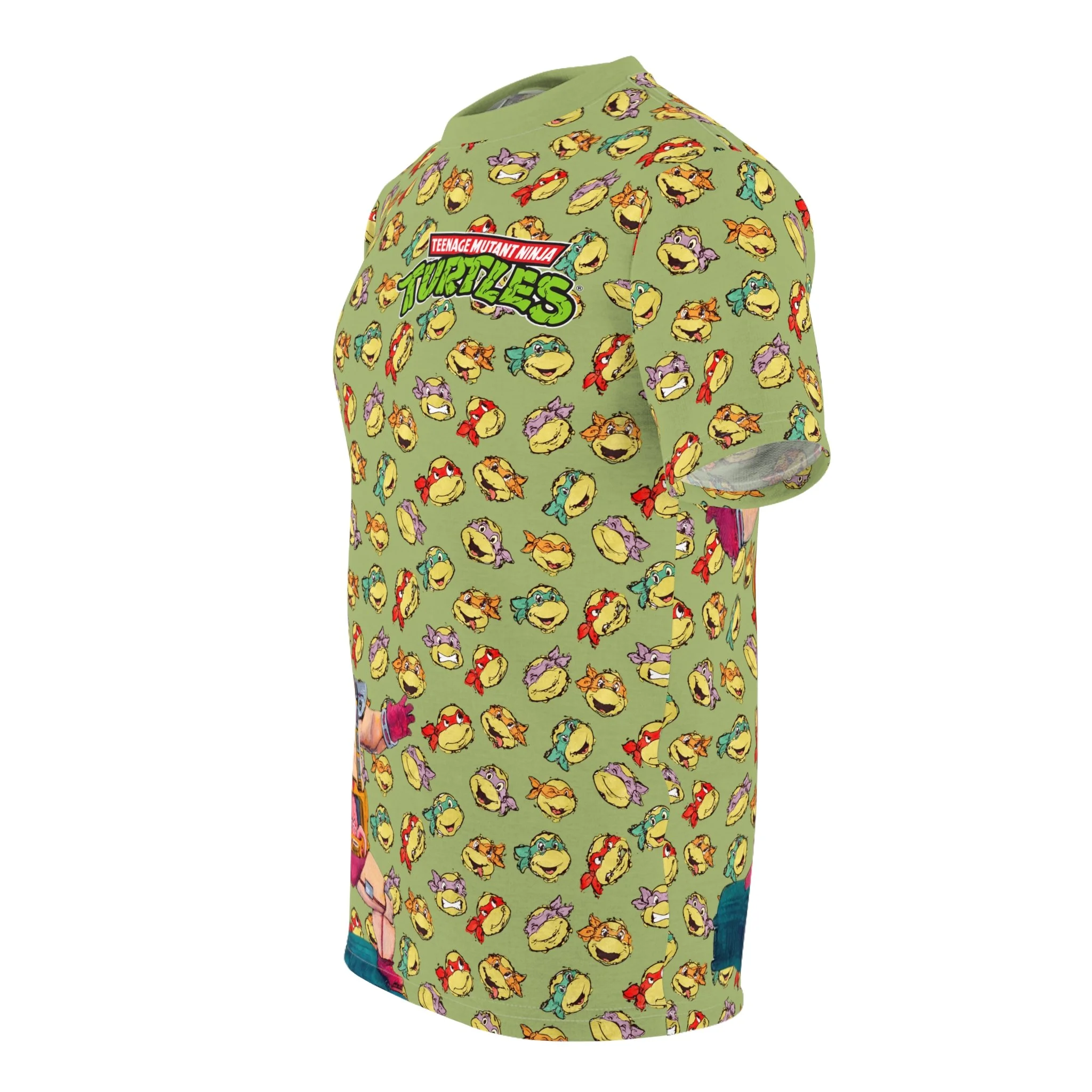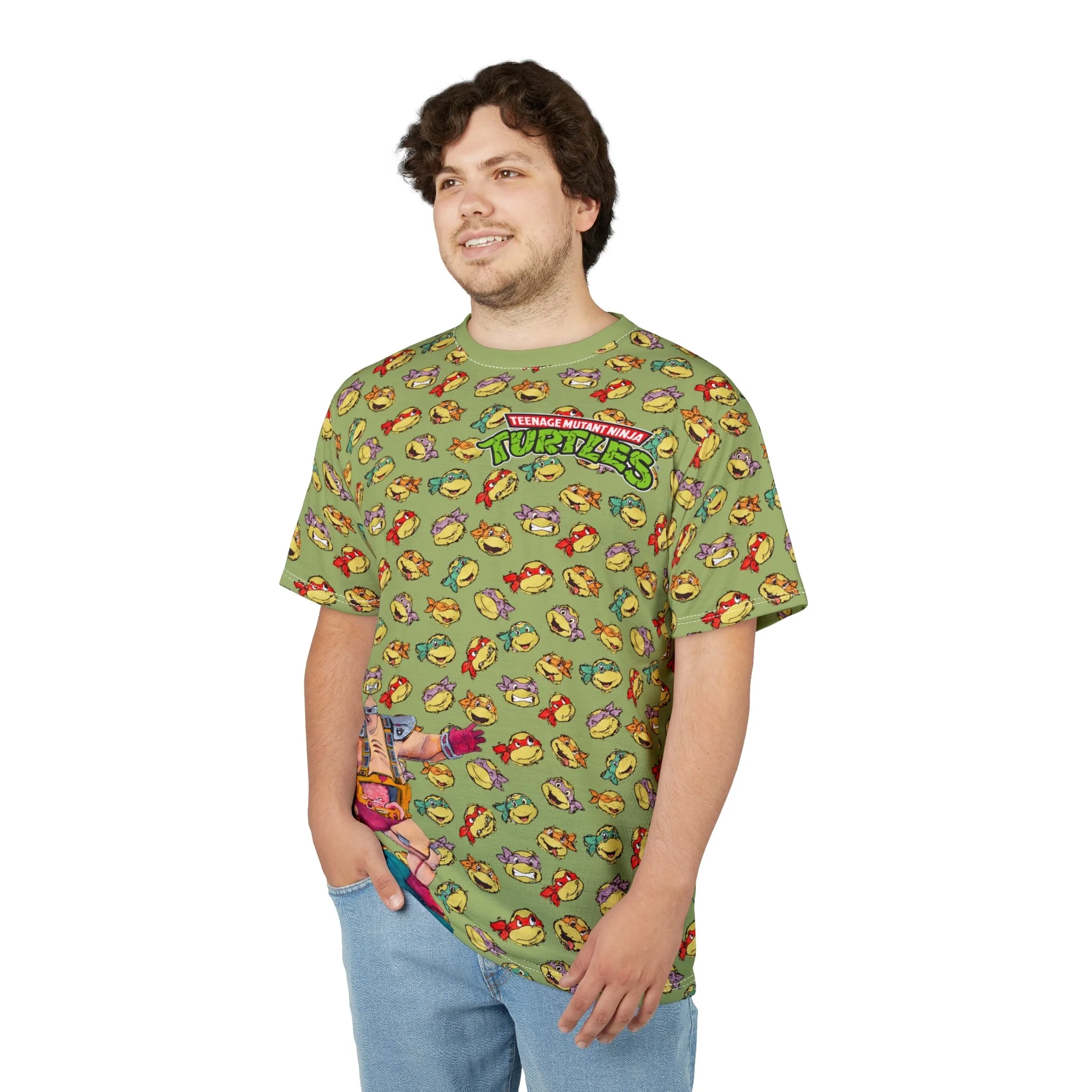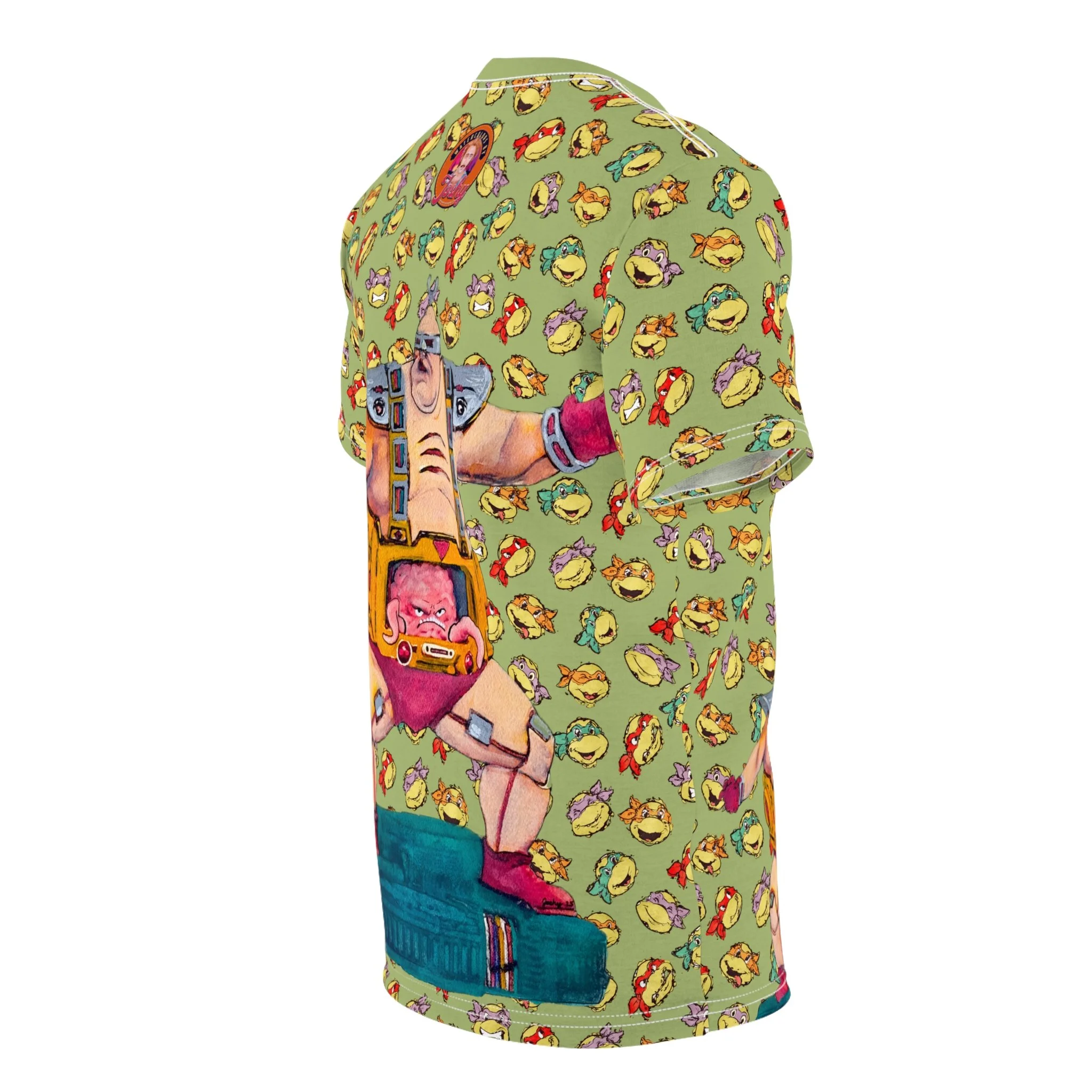 This tee brings the retro villain Krang to life with bold, eye-catching artwork. The left chest features the classic Teenage Mutant Ninja Turtles logo, while Krang makes an appearance at the bottom right front. On the back, Krang dominates the design in a giant print, set against a vibrant backdrop of the Turtles’ faces in an all-over pattern.