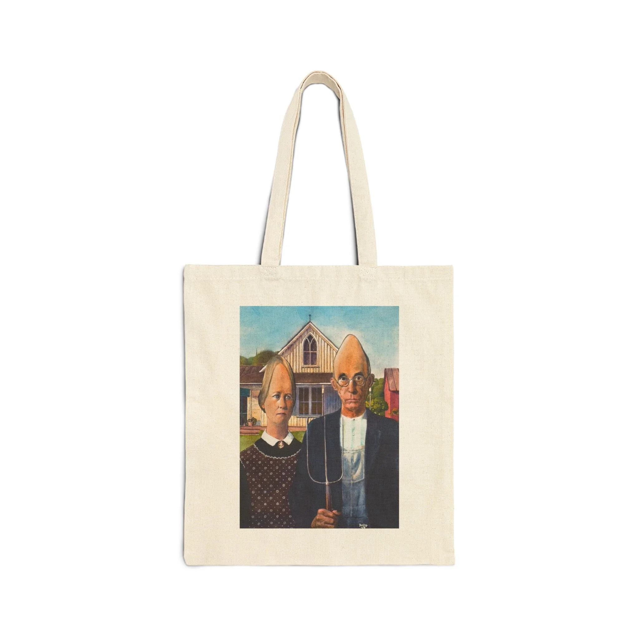 American Gothic Coneheads Cotton Canvas Tote - 90s Alien Americana Parody Art Bags