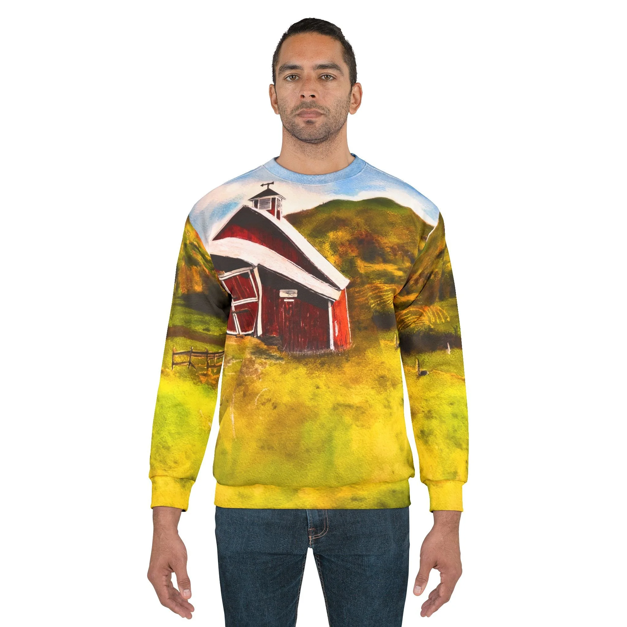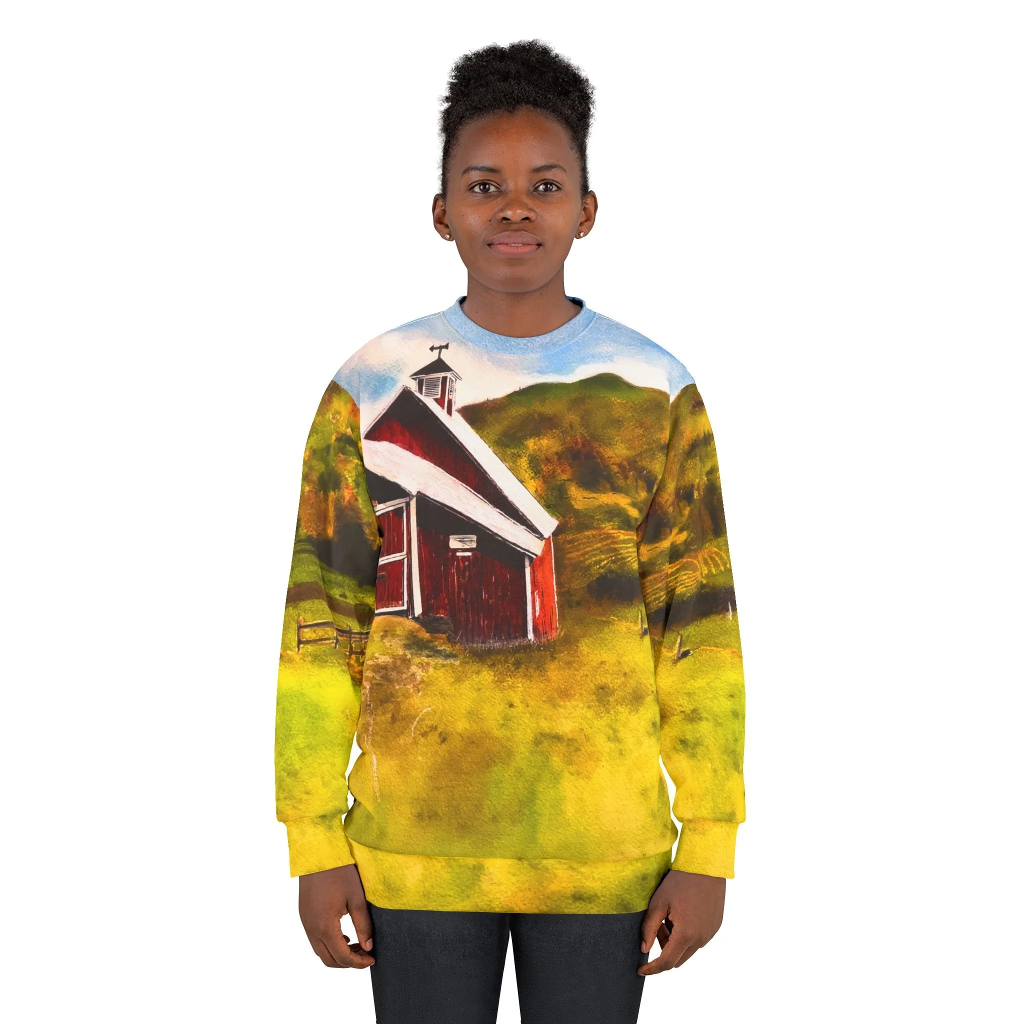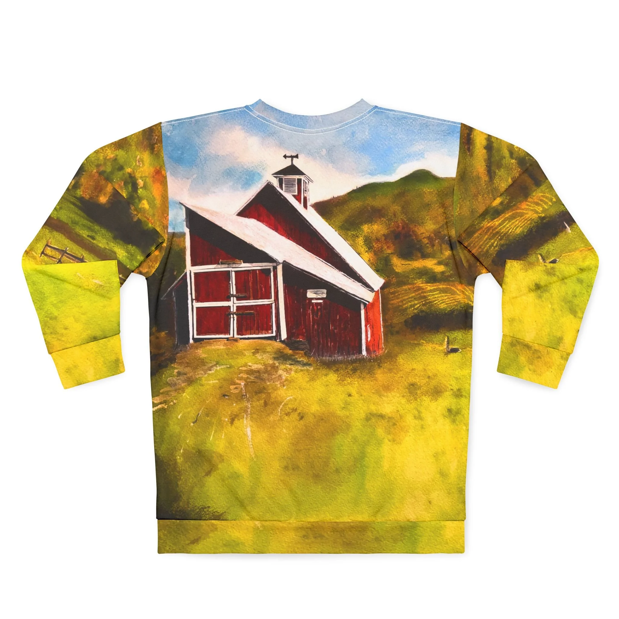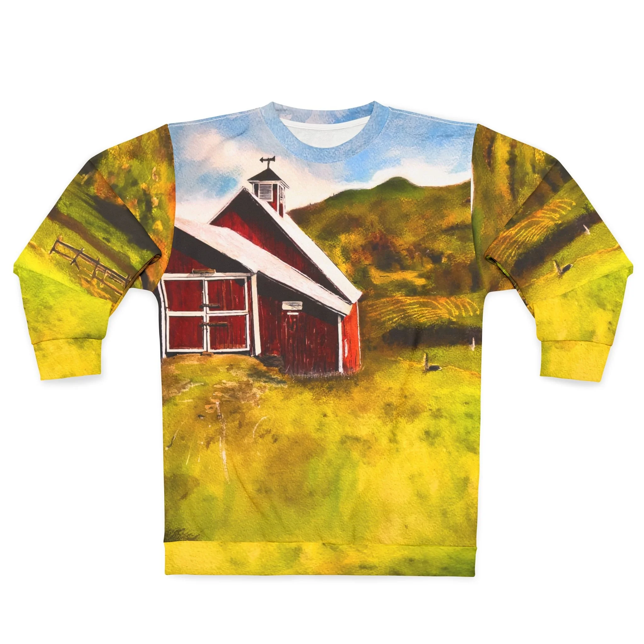 Wrap yourself in cozy Vermont charm with this all-over print crewneck sweatshirt featuring Joshy’s watercolor painting of the iconic Grand View Farm Red Barn in Stowe, Vermont. Preserved by the Stowe Land Trust, this historic red barn is printed boldly on both the front and back, while lush green pastures and mountain views stretch across the sleeves and body, bringing the full beauty of the landscape to life.