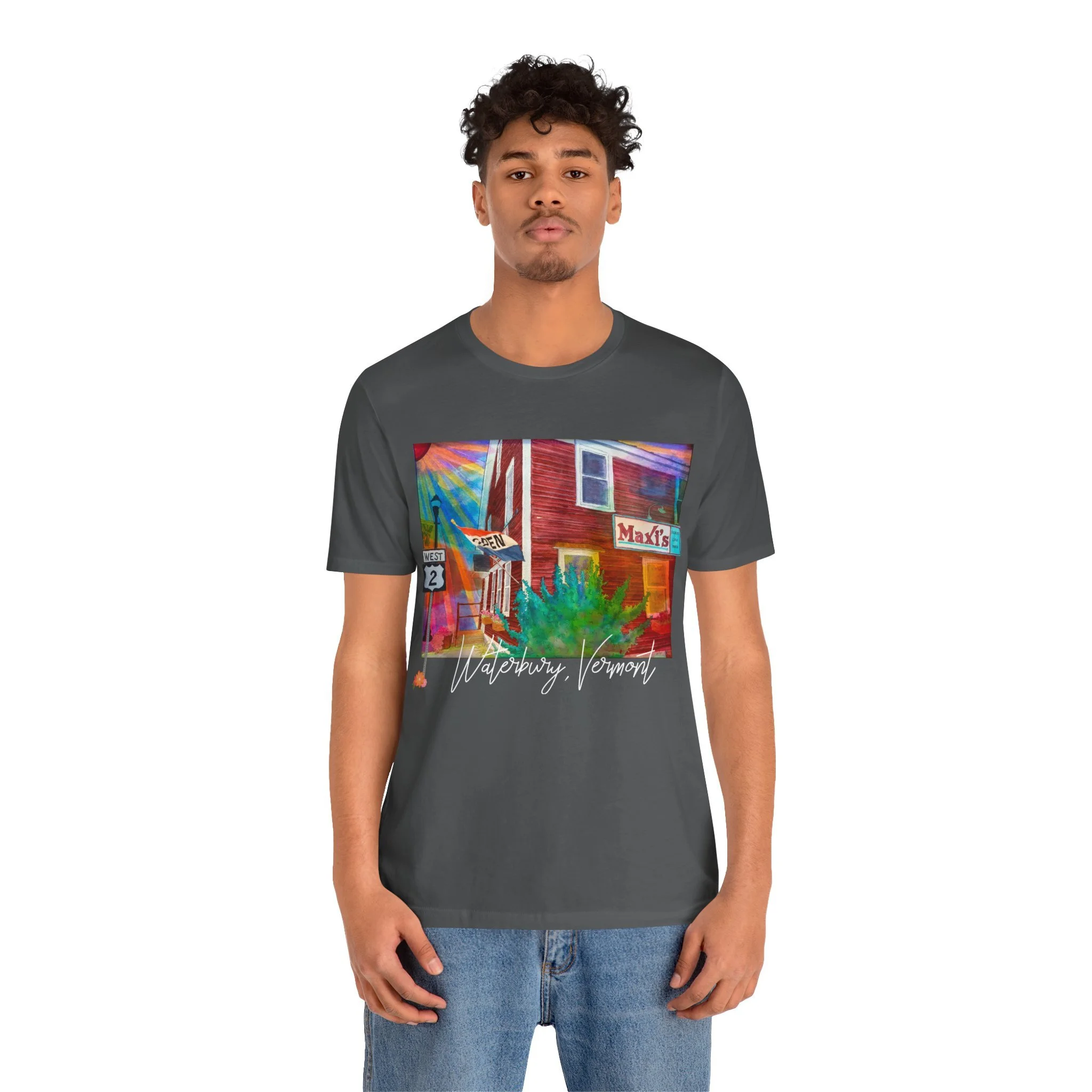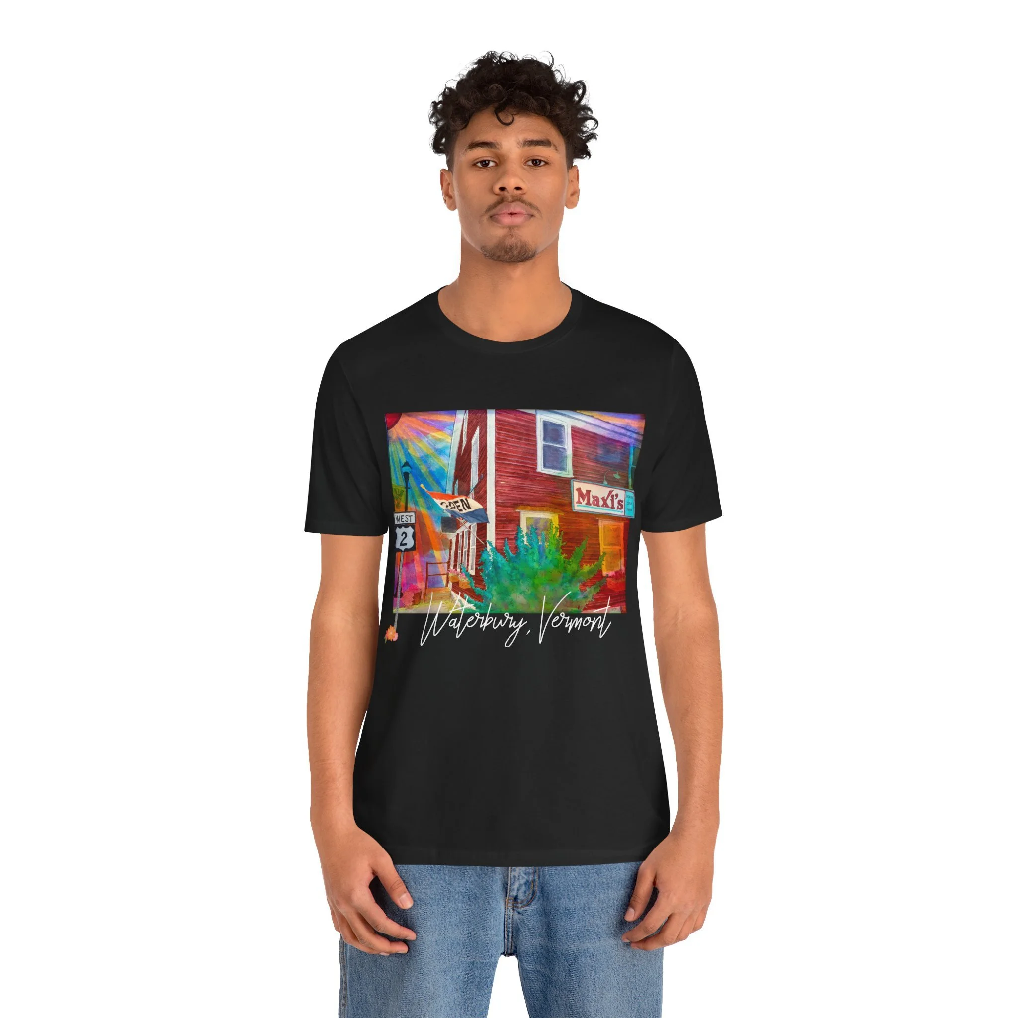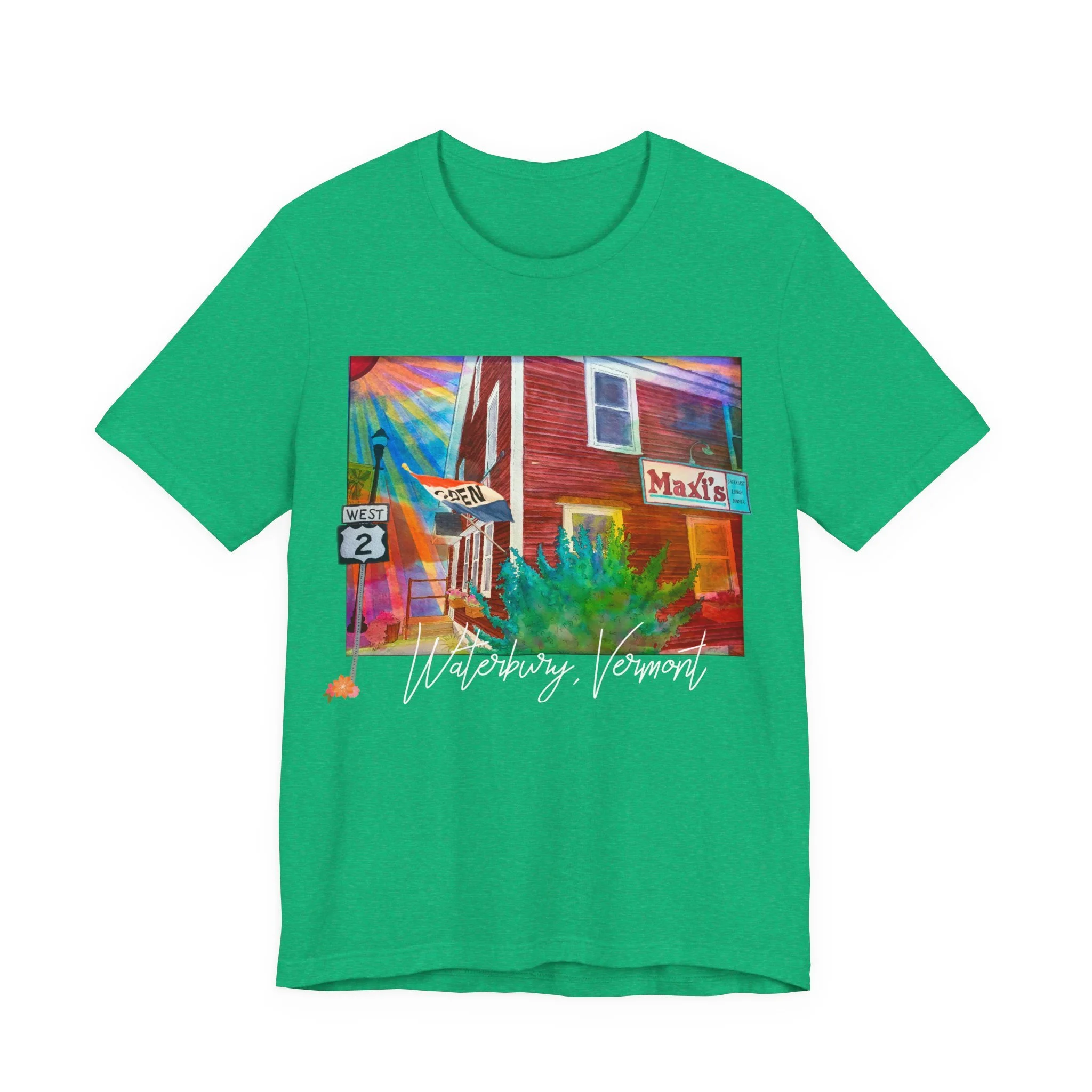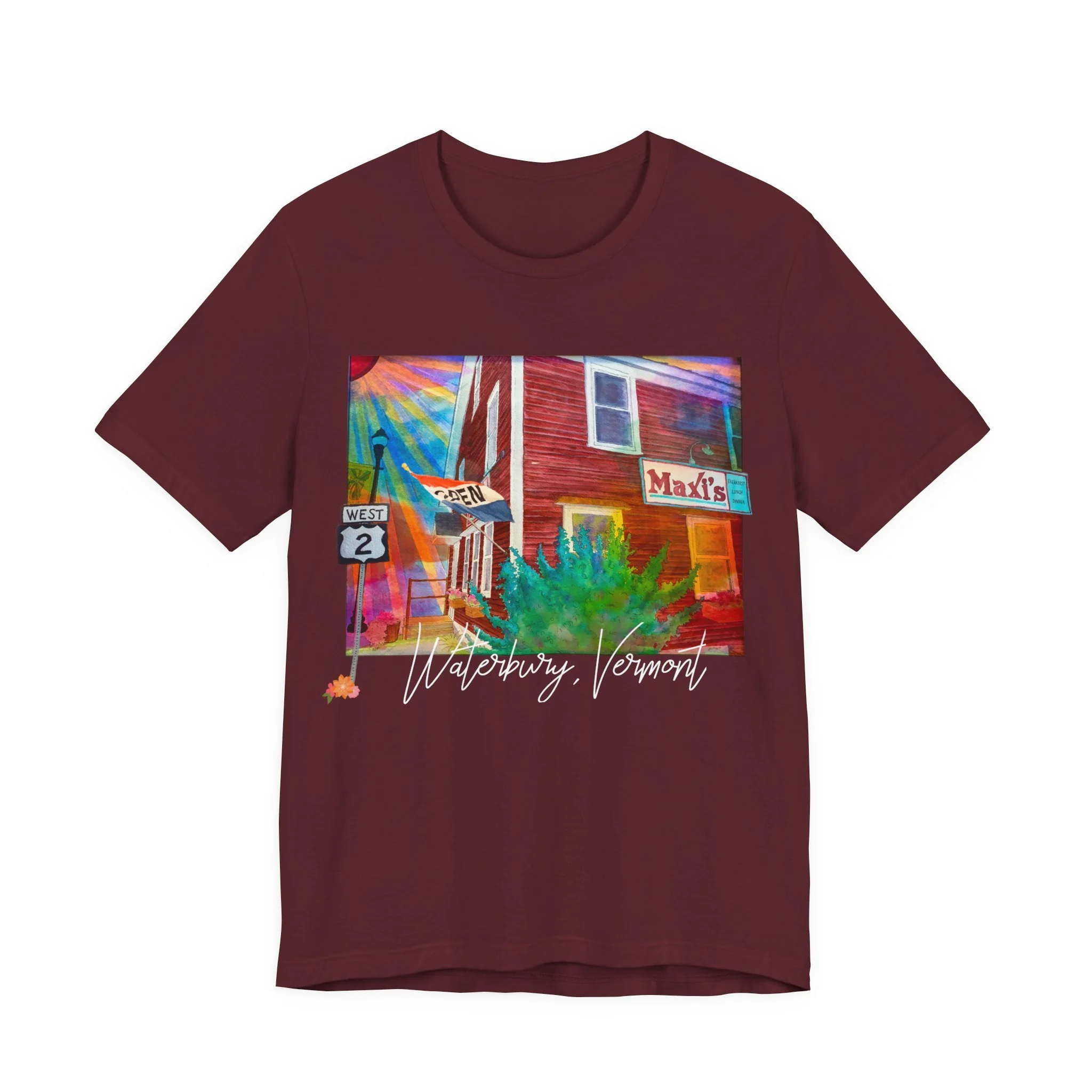 Celebrate a beloved piece of Vermont nostalgia with this unisex jersey tee featuring Joshy’s early watercolor painting of Maxi’s Restaurant—the cozy, hometown diner with a loyal local following. The artwork highlights the warm, familiar scene with the Route 2 sign standing out on the left and the Maxi’s marquee popping on the right, capturing the charm that made the restaurant a community favorite.
