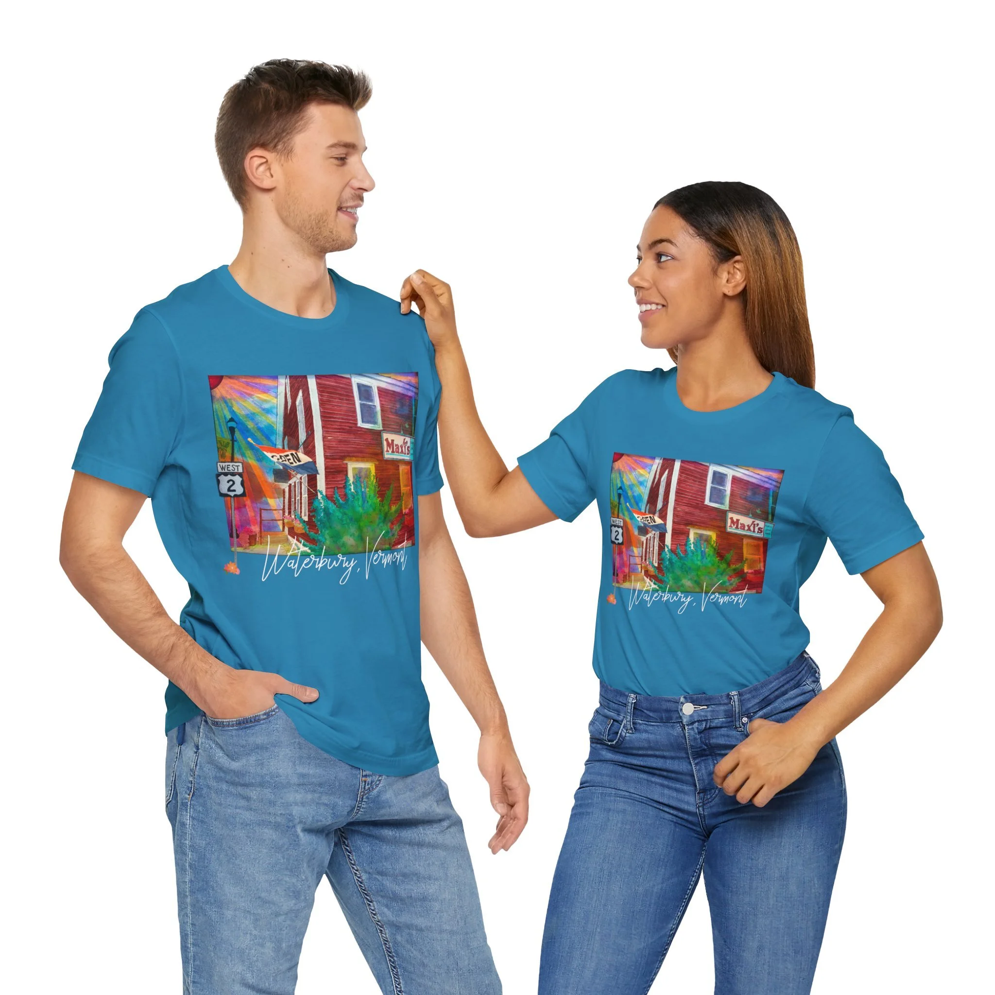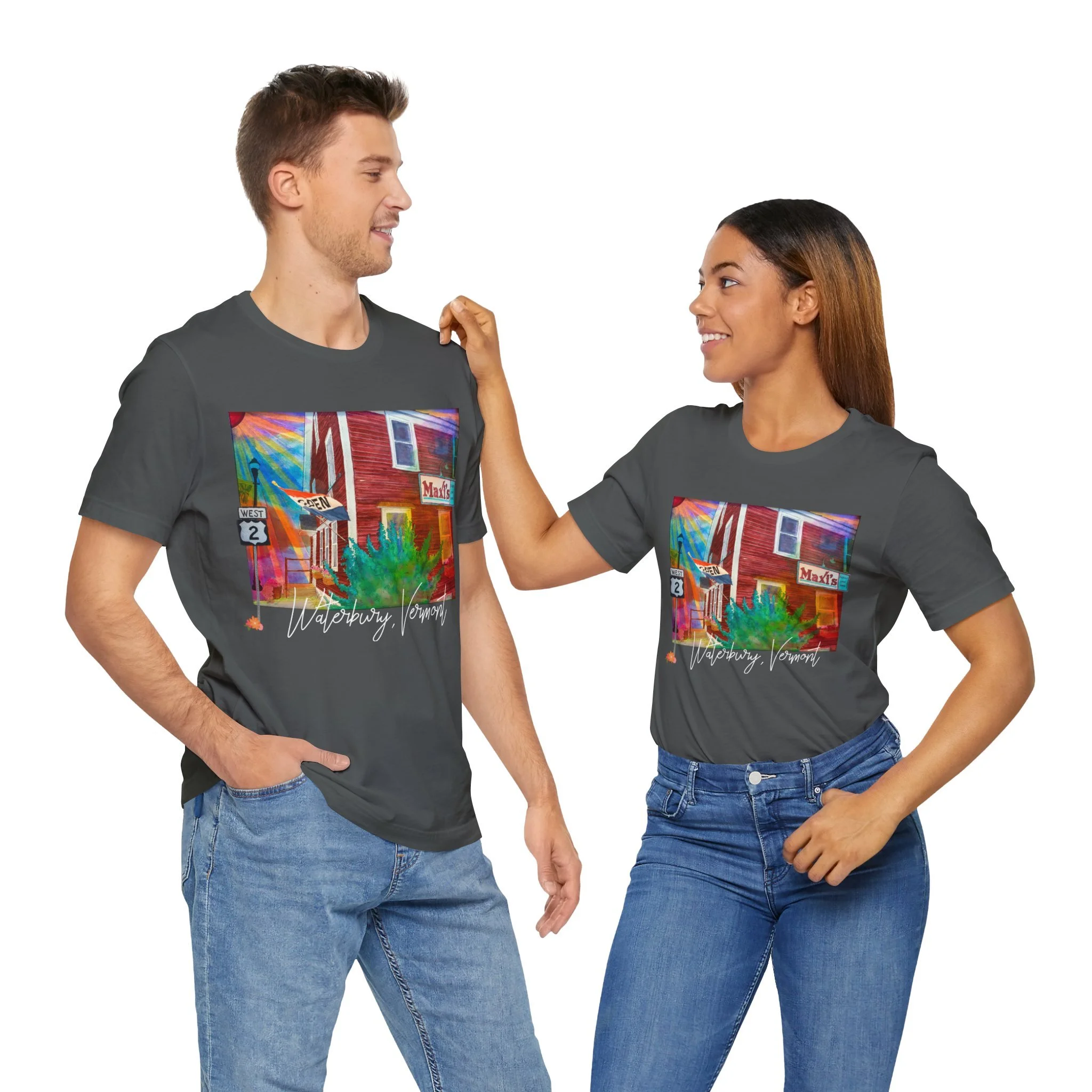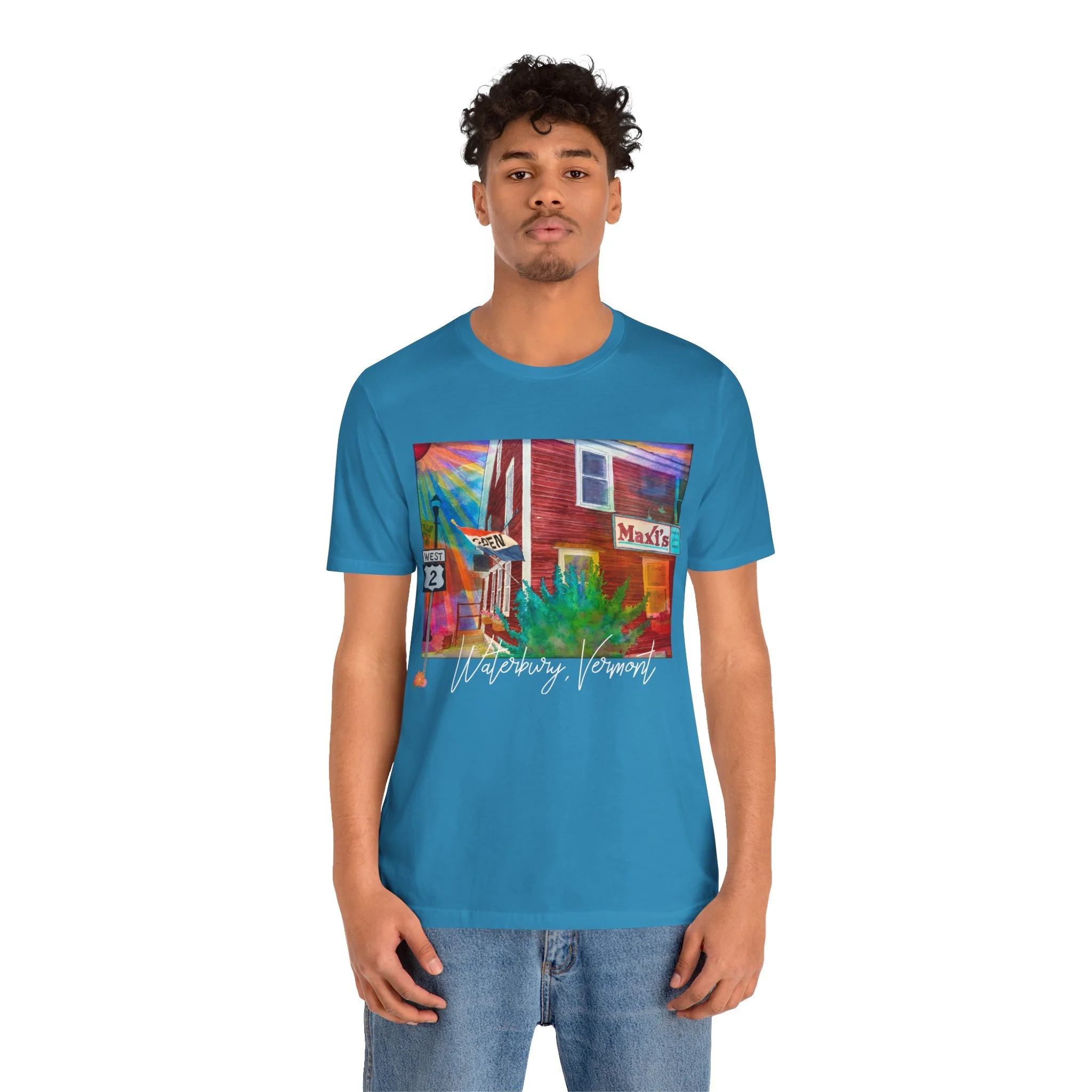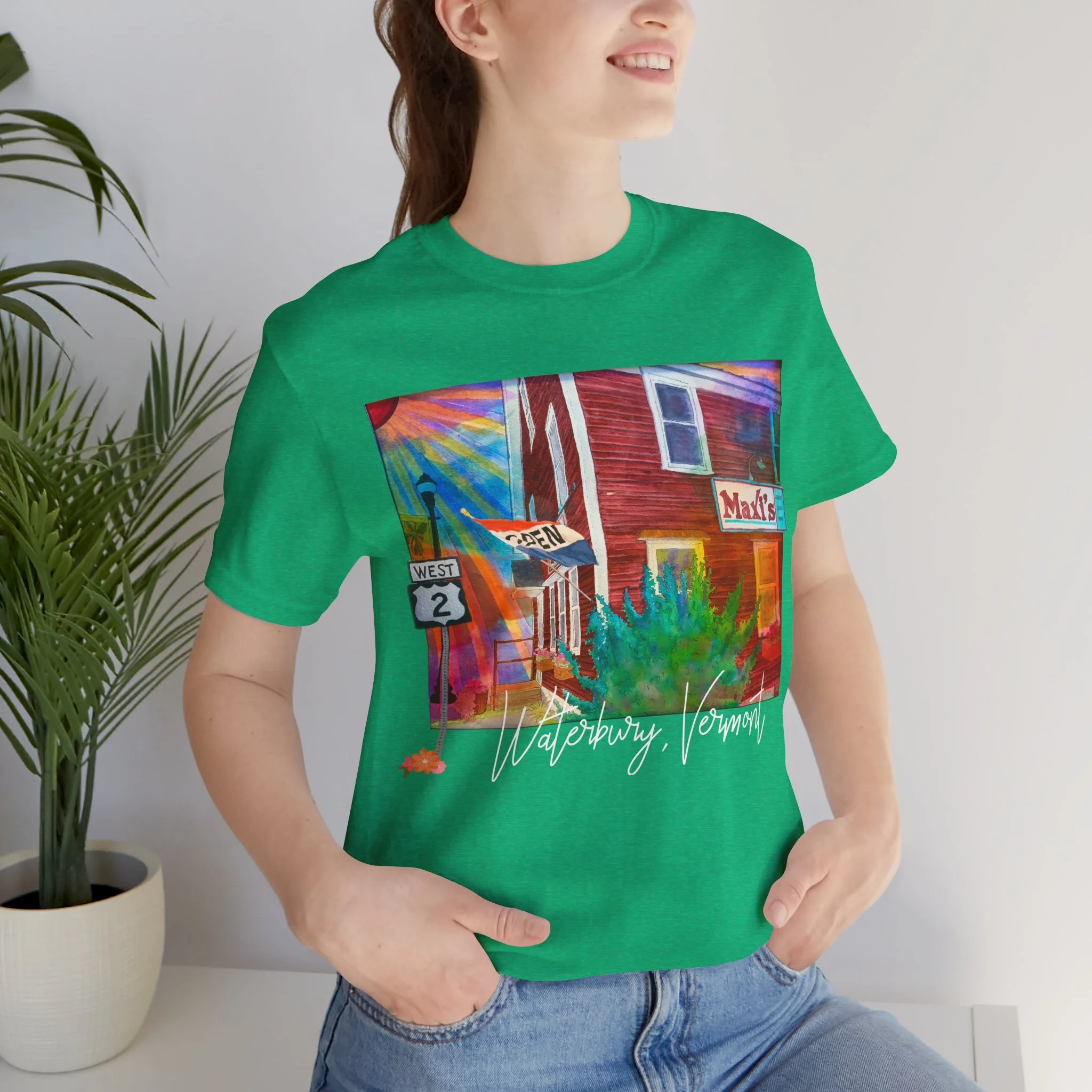 Celebrate a beloved piece of Vermont nostalgia with this unisex jersey tee featuring Joshy’s early watercolor painting of Maxi’s Restaurant—the cozy, hometown diner with a loyal local following. The artwork highlights the warm, familiar scene with the Route 2 sign standing out on the left and the Maxi’s marquee popping on the right, capturing the charm that made the restaurant a community favorite.