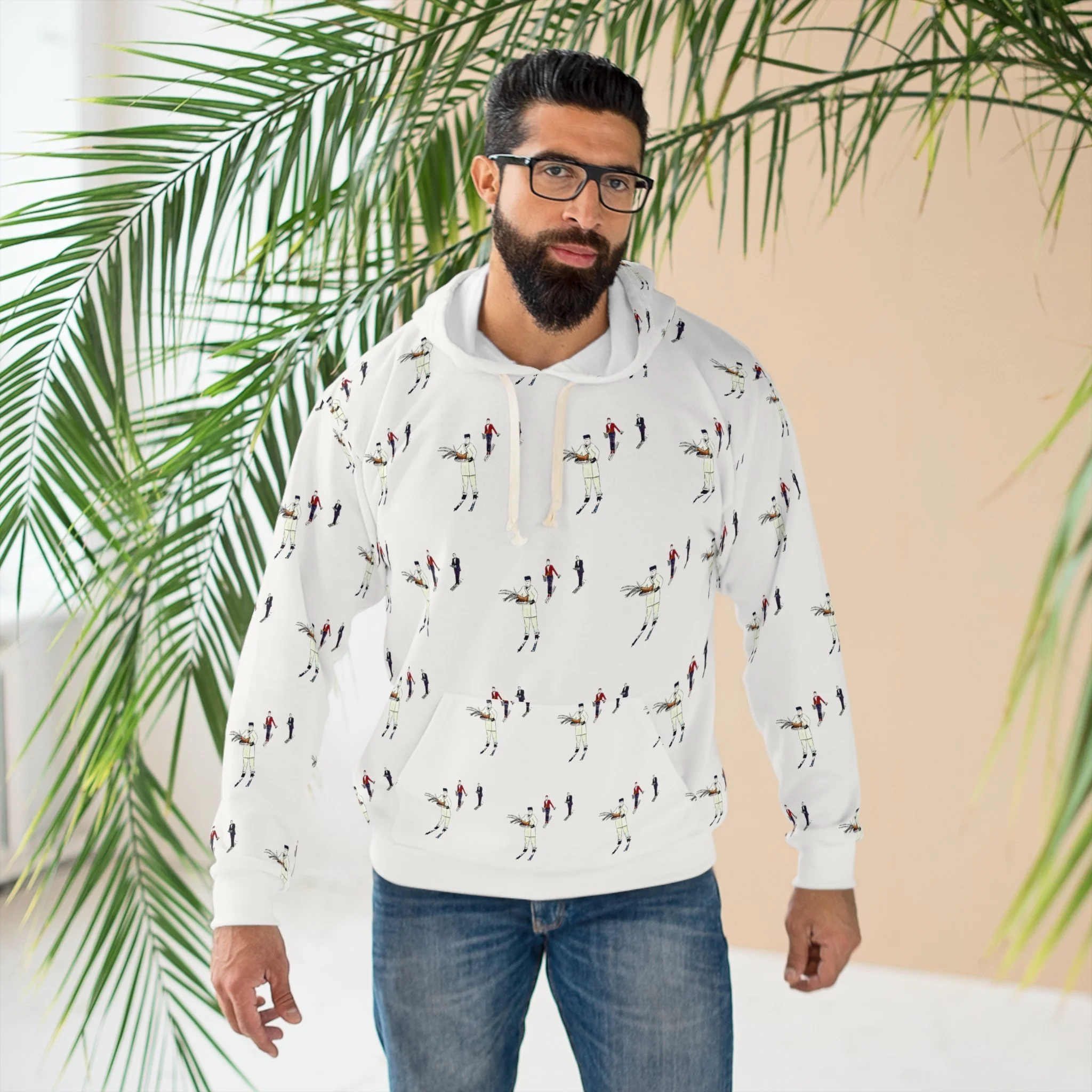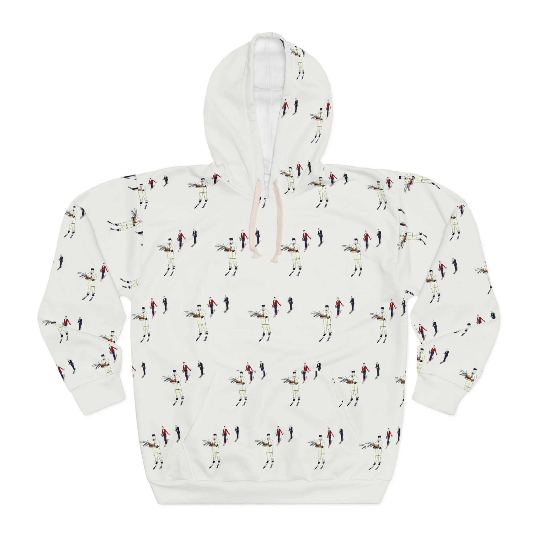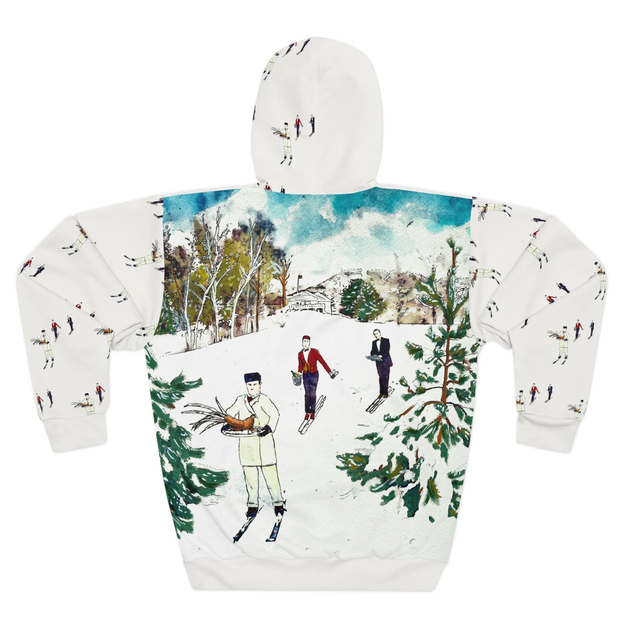 This Skiing Waiters Watercolor Pullover Hoodie is made for warmth and comfort. It features a large front pocket, a hood with a drawstring, and is custom cut and sewn.