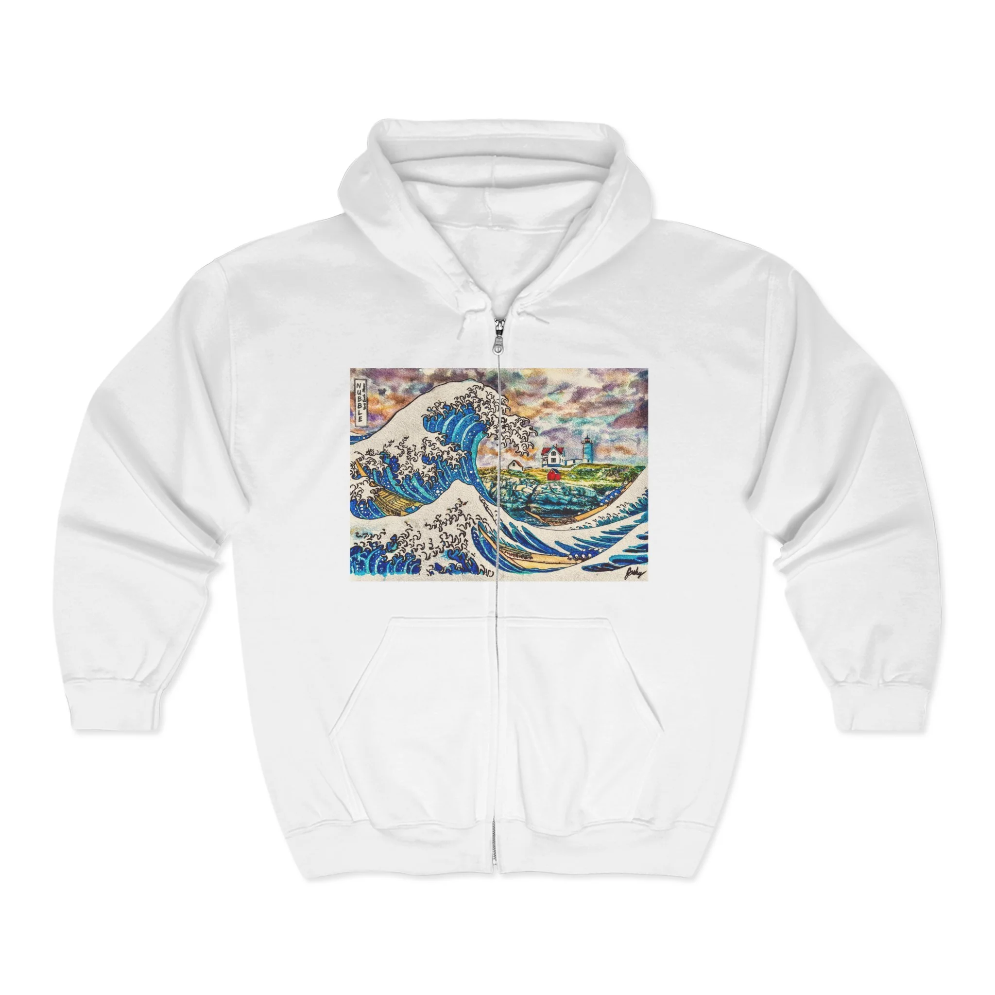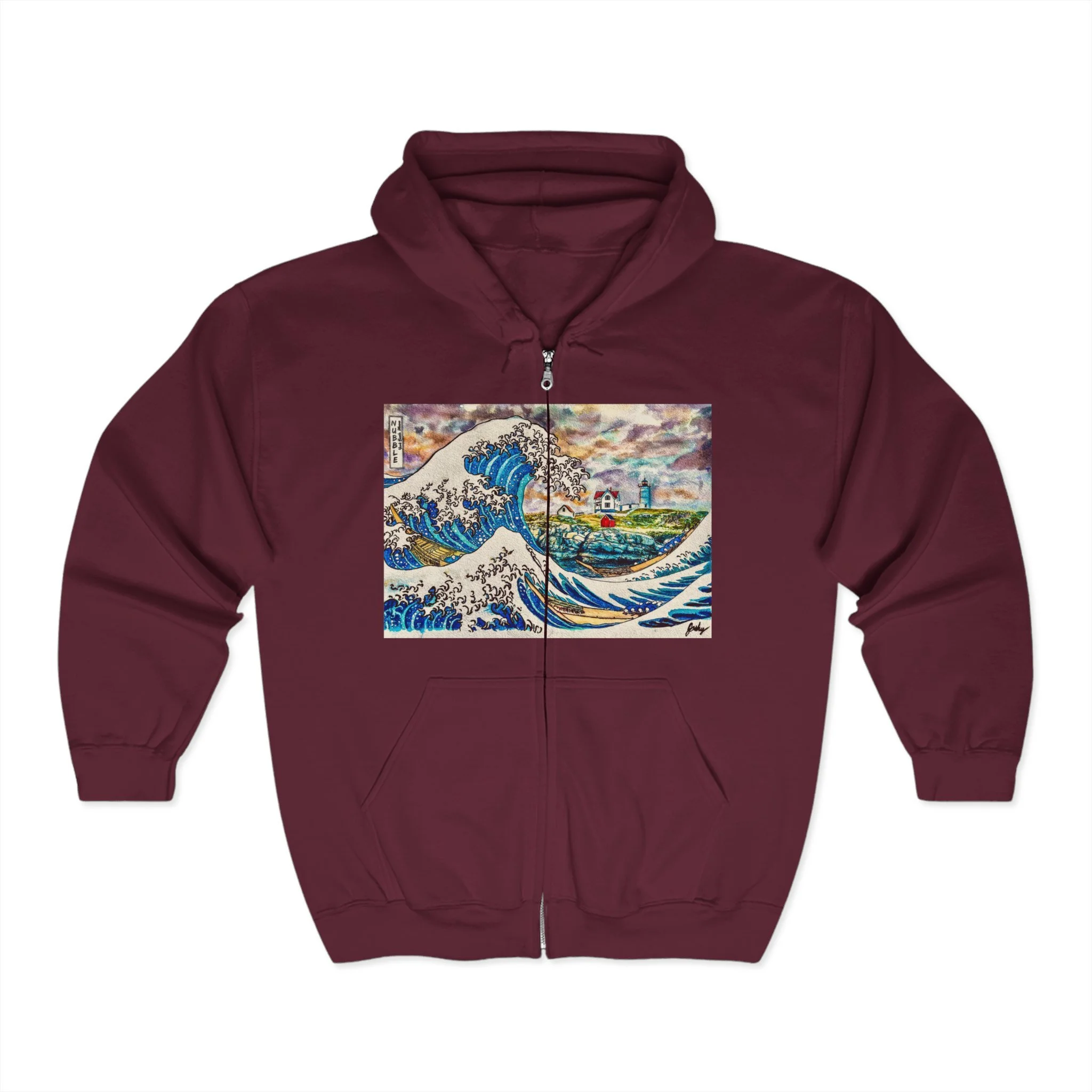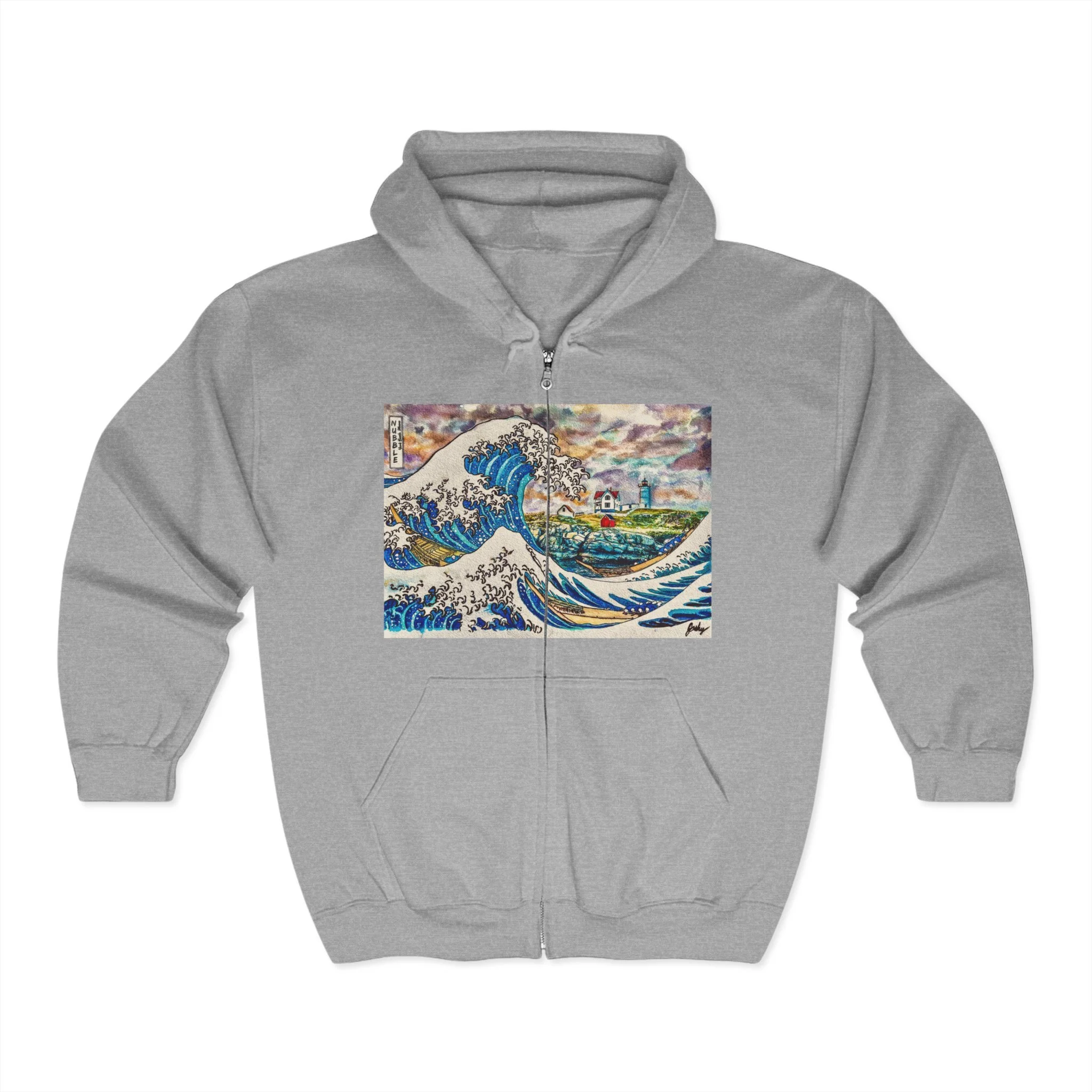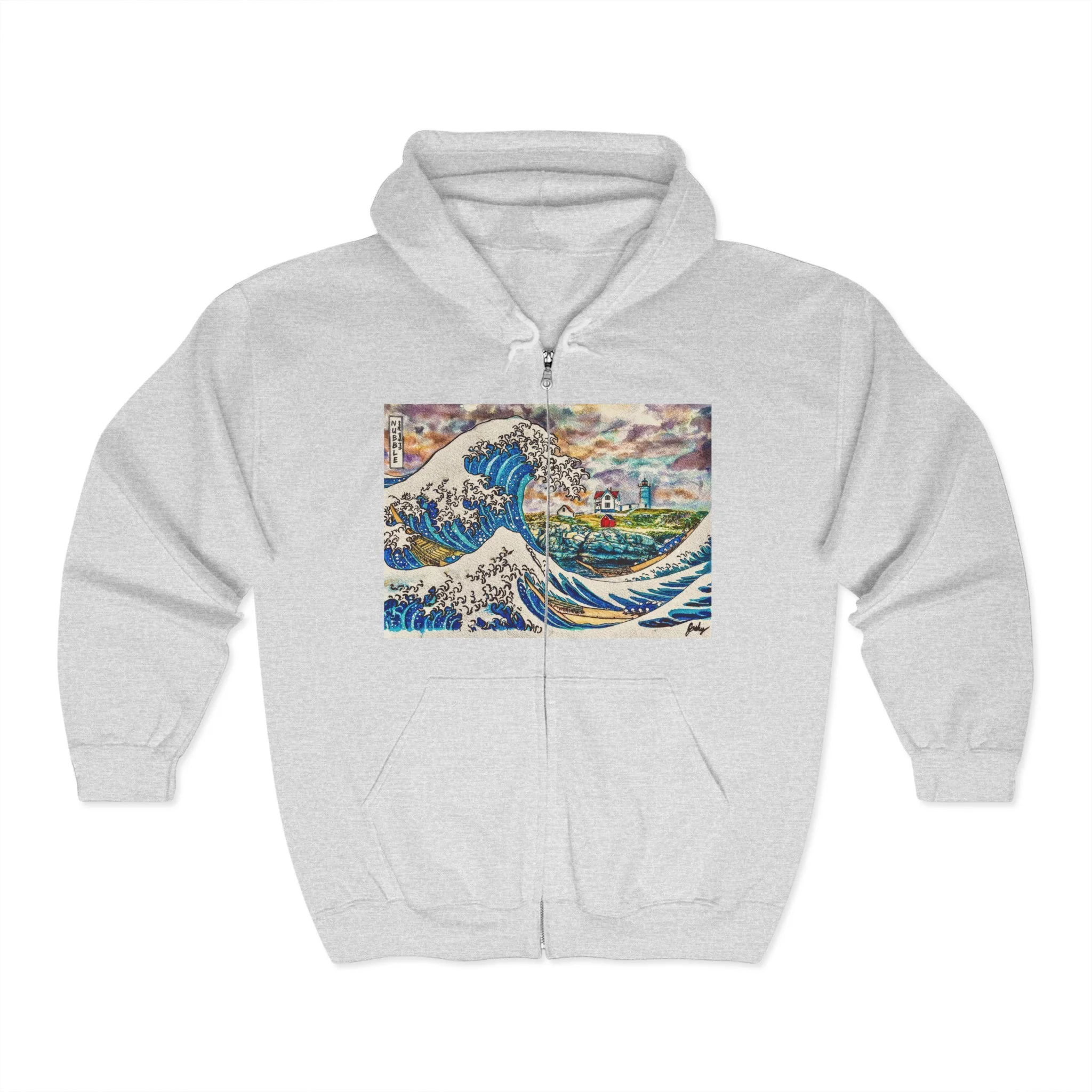 A bold remix of two coastal icons—Joshy’s watercolor mashup of The Great Wave off Kanagawa and Maine’s beloved Nubble Lighthouse comes to life on this ultra-comfy unisex zip hoodie. The print spans seamlessly across the front zipper, making this wearable art piece as striking zipped up as it is layered open.