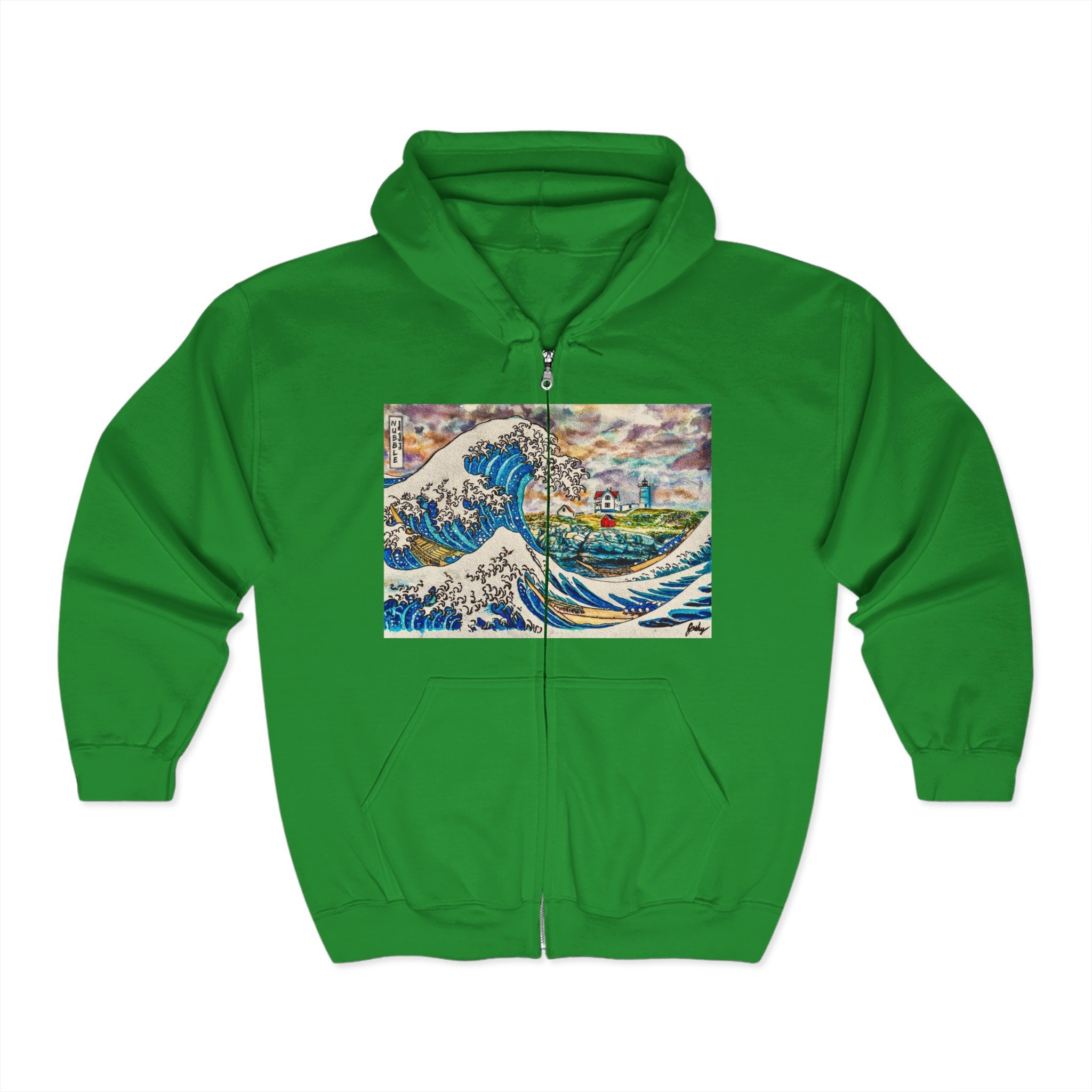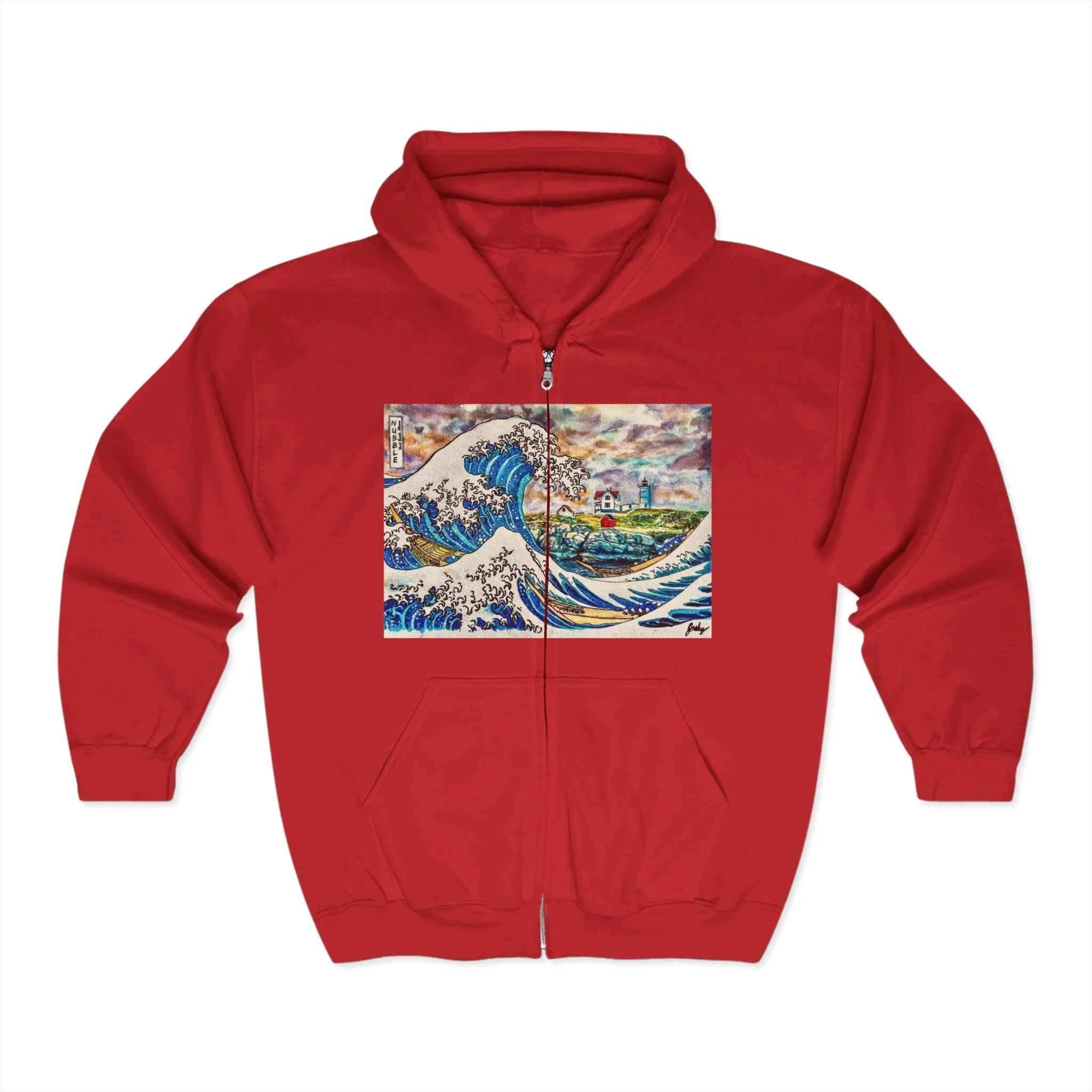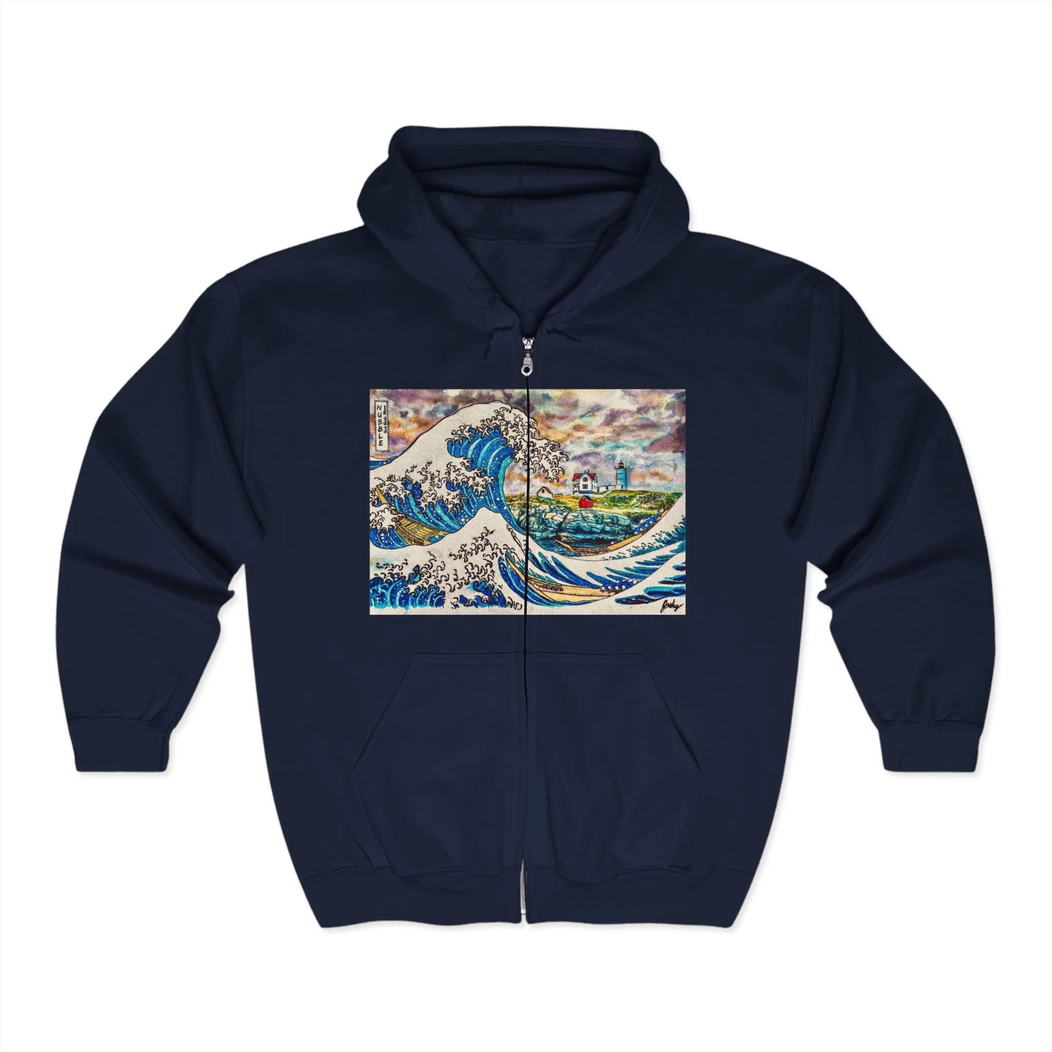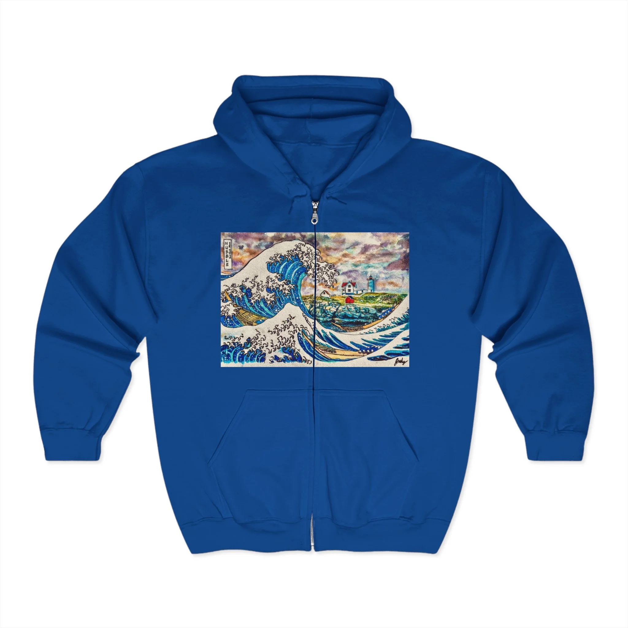 A bold remix of two coastal icons—Joshy’s watercolor mashup of The Great Wave off Kanagawa and Maine’s beloved Nubble Lighthouse comes to life on this ultra-comfy unisex zip hoodie. The print spans seamlessly across the front zipper, making this wearable art piece as striking zipped up as it is layered open.
