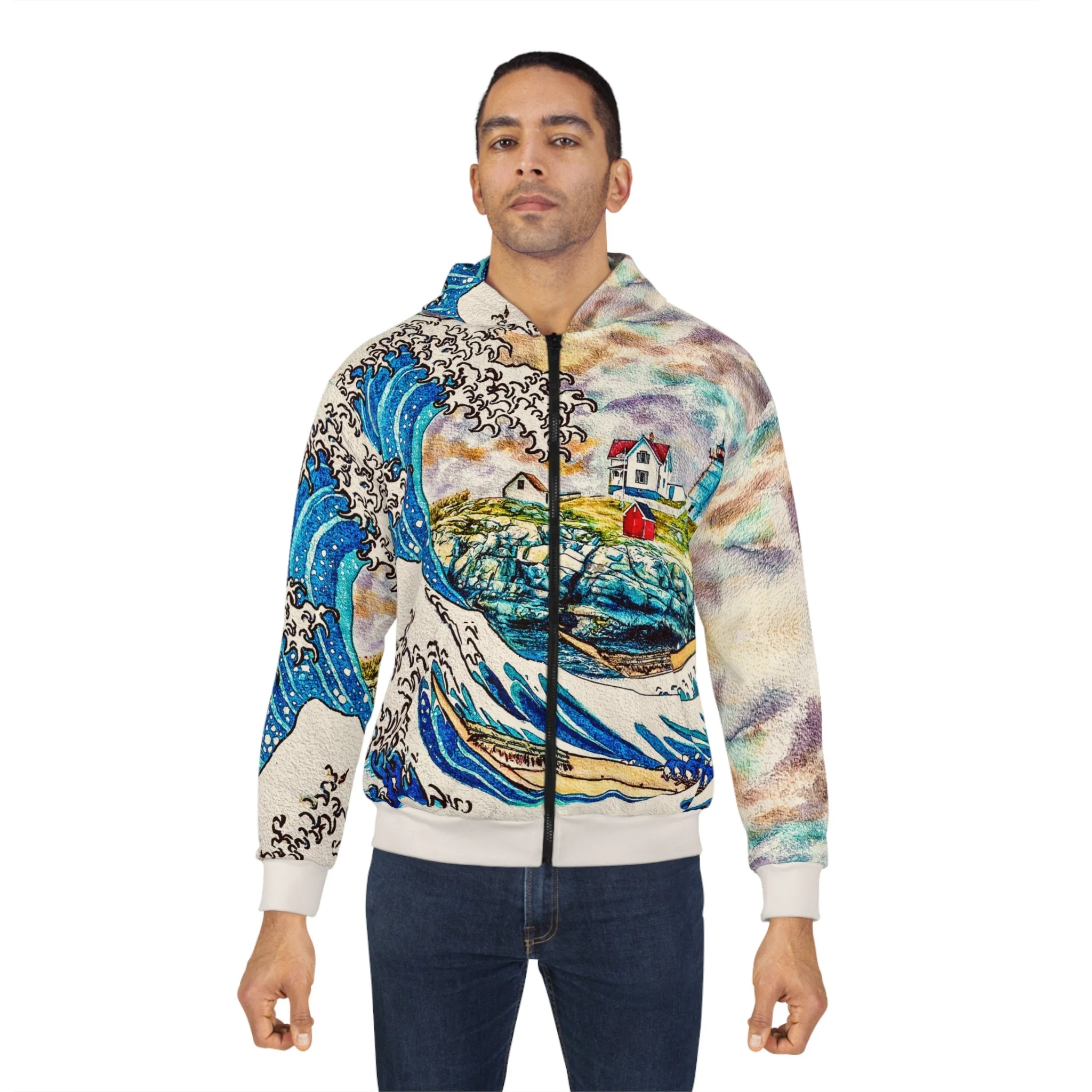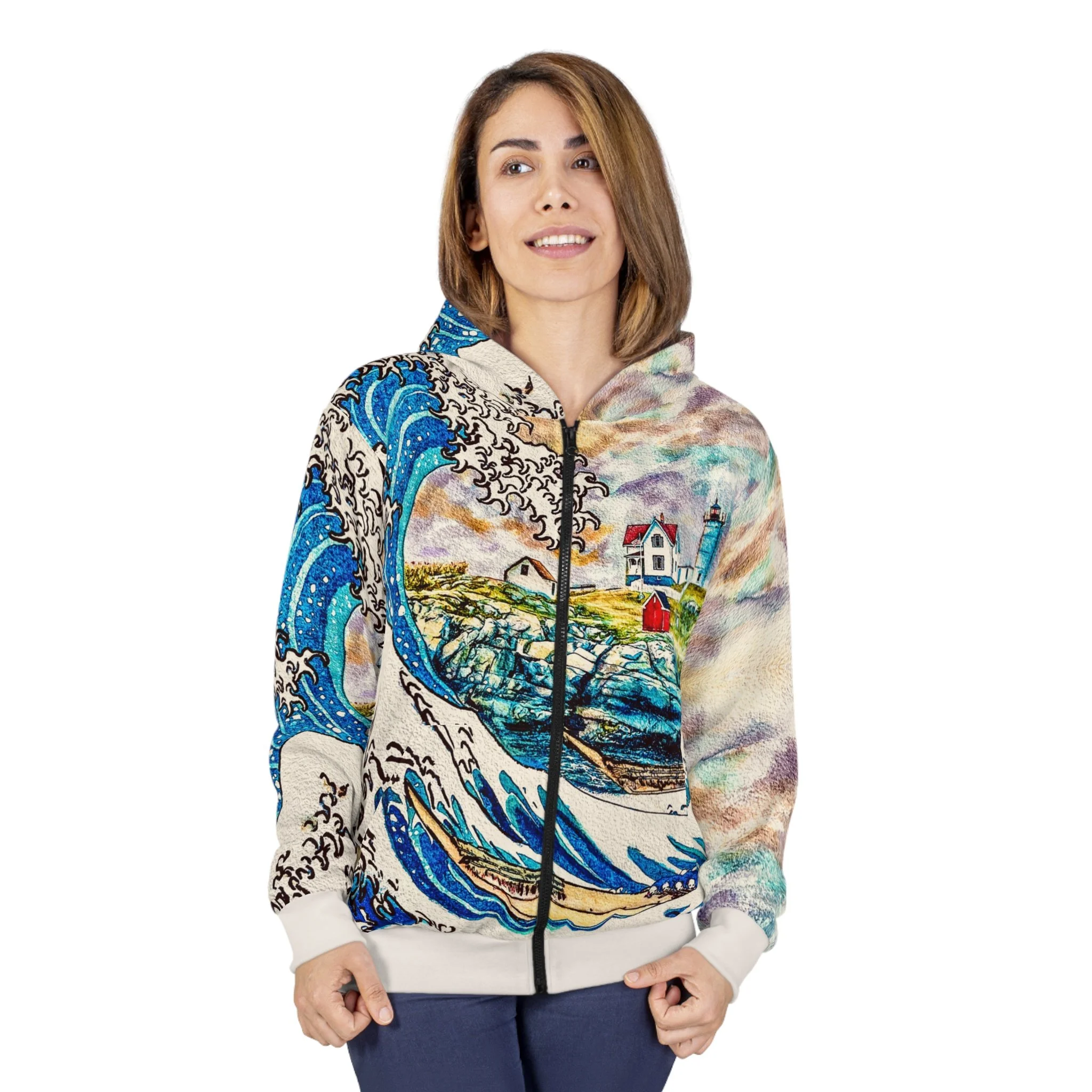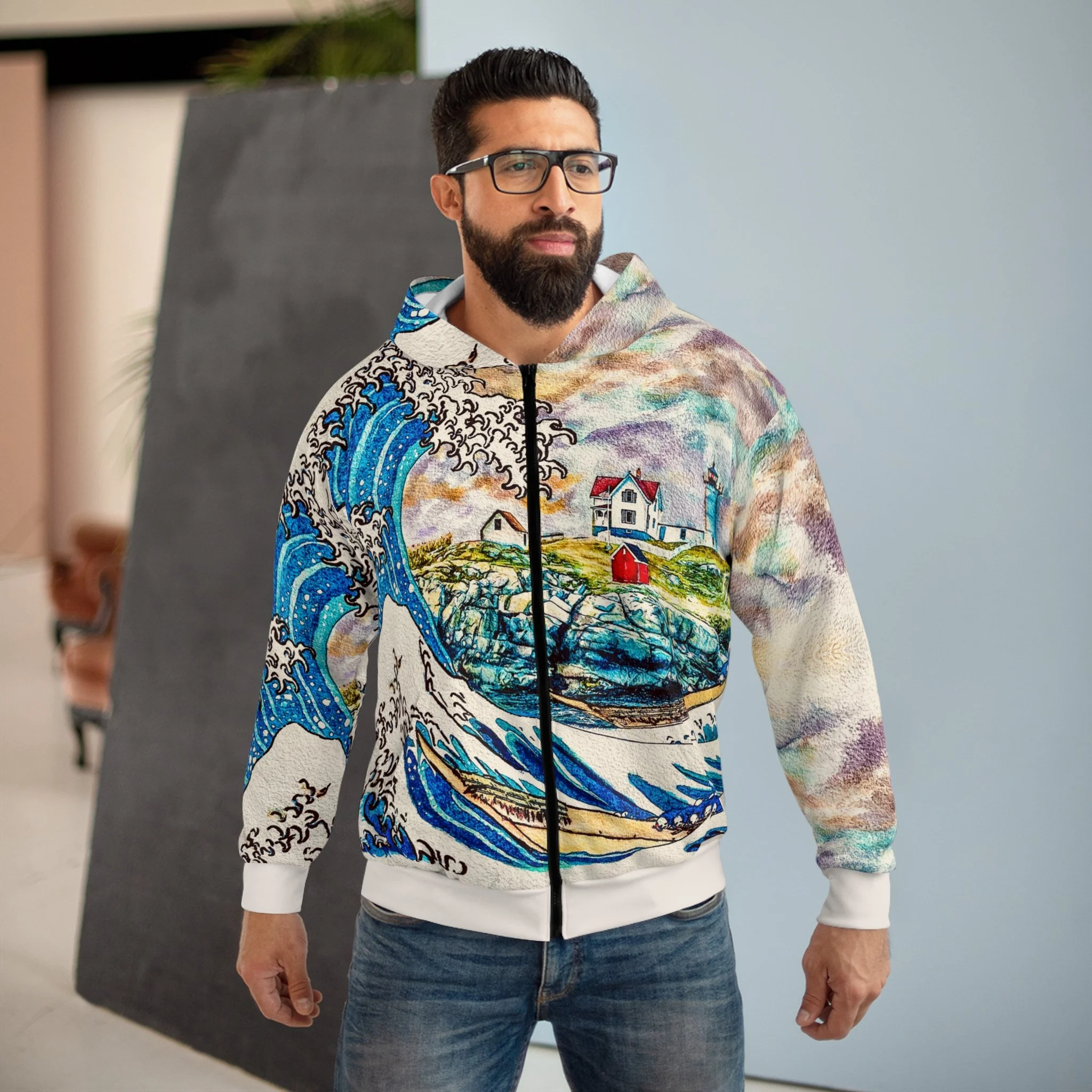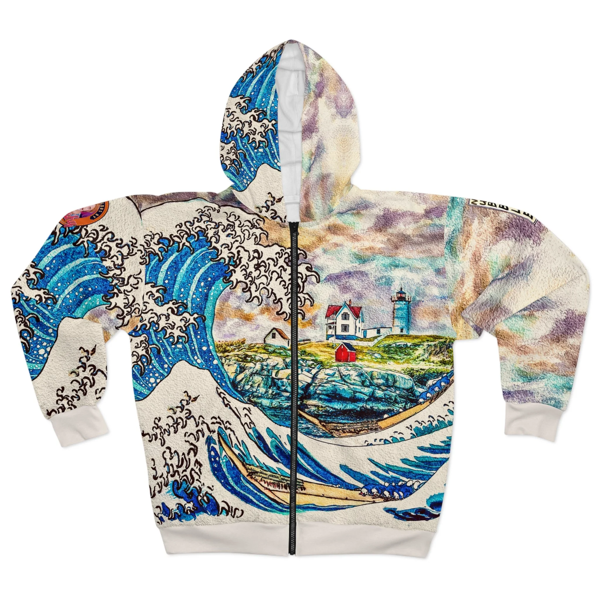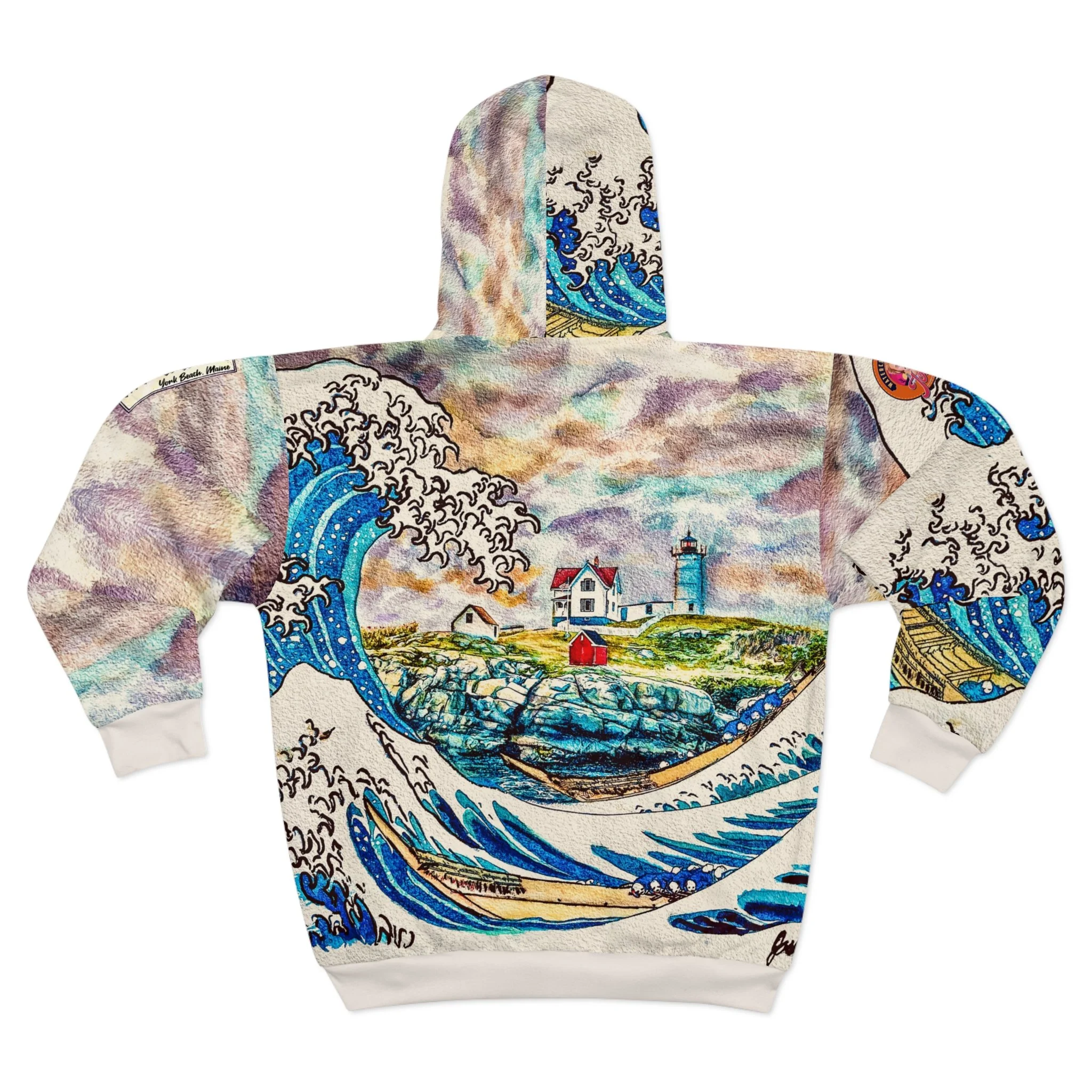 This cozy zip-up hoodie features Joshy’s vibrant watercolor mashup of Hokusai’s iconic The Great Wave and the beloved Nubble Lighthouse of York Beach, Maine. Crashing waves rendered in a bold, stylized rhythm swirl around the detailed Cape Neddick Light, paying homage to both Japanese printmaking and the rugged charm of New England’s coastline.