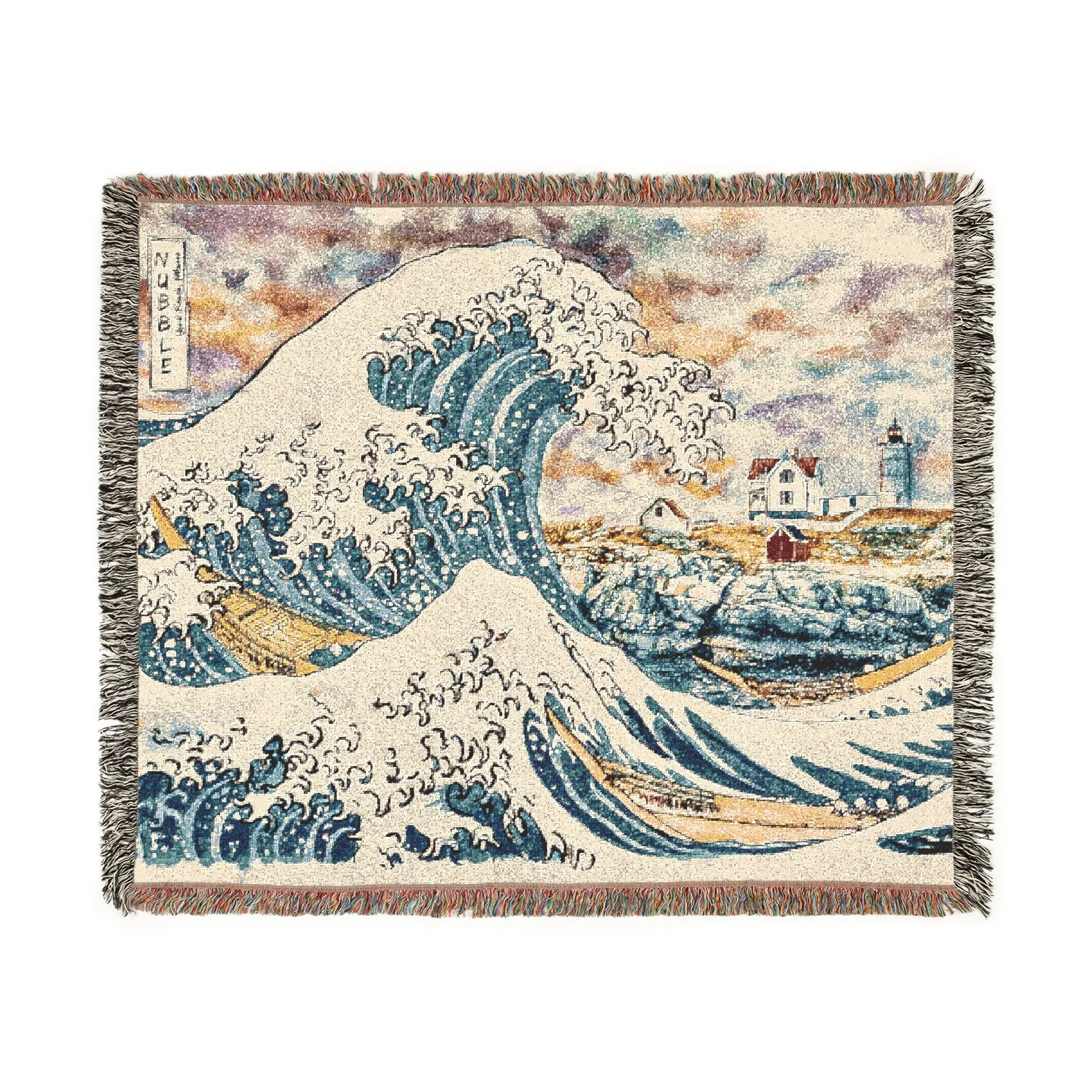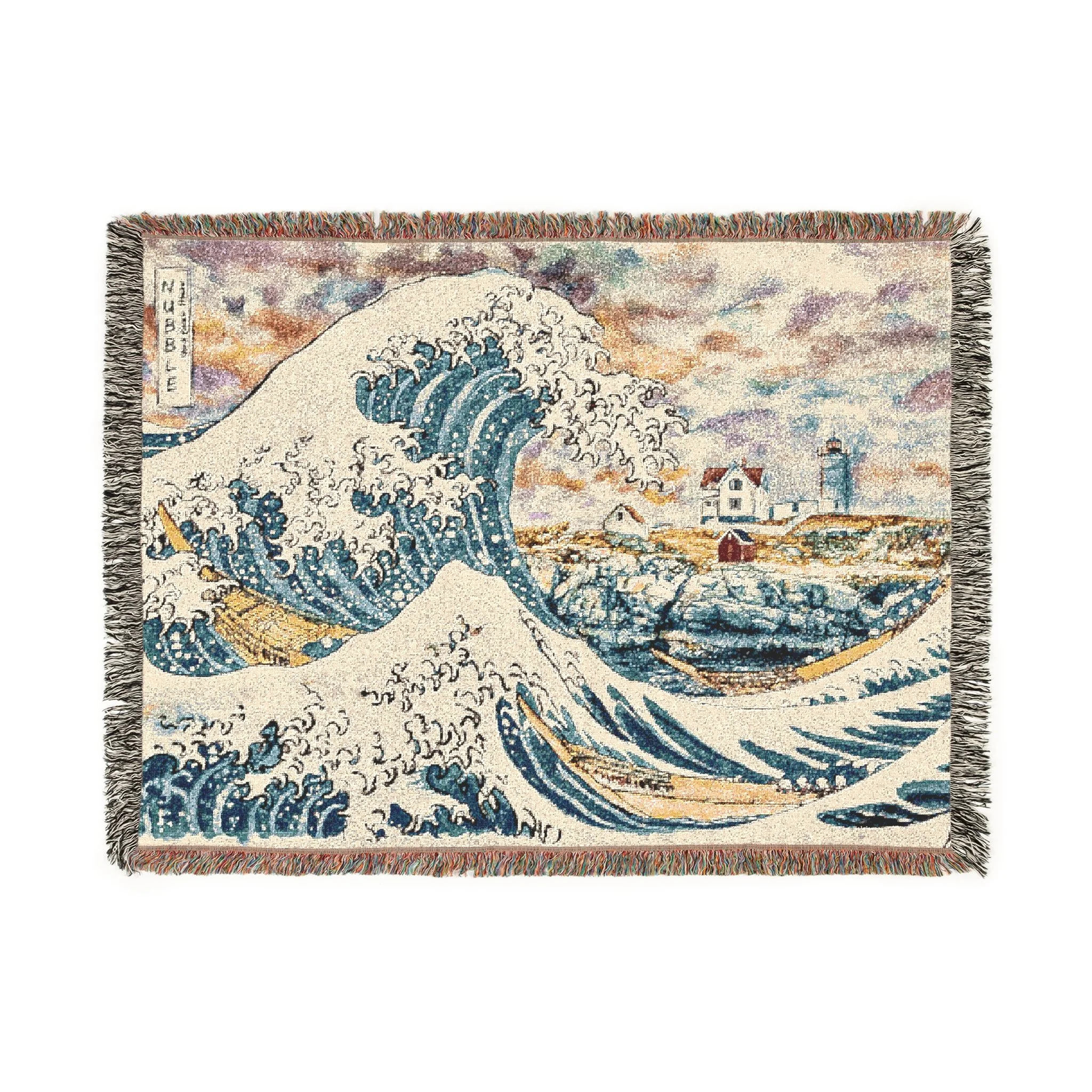 A cozy clash of iconic coasts and classic art—this woven throw brings together the spirit of The Great Wave off Kanagawa with the unmistakable charm of Maine’s Nubble Lighthouse. Originally painted by Vermont artist Joshy, this mashup merges timeless woodblock-style energy with the serene Americana of New England’s rocky shores.