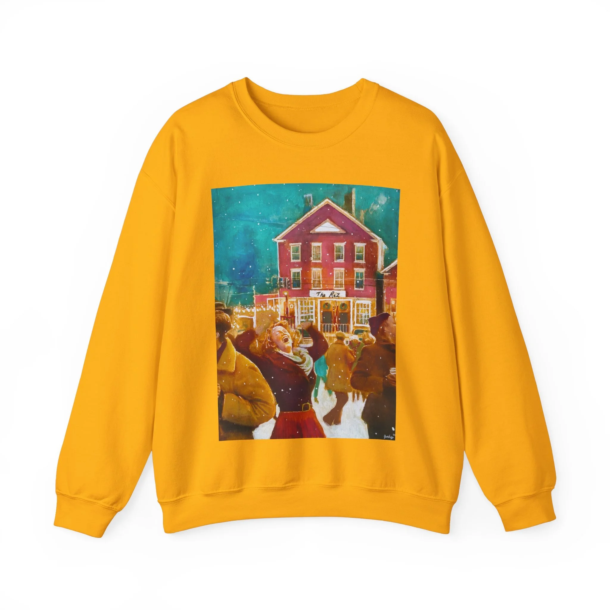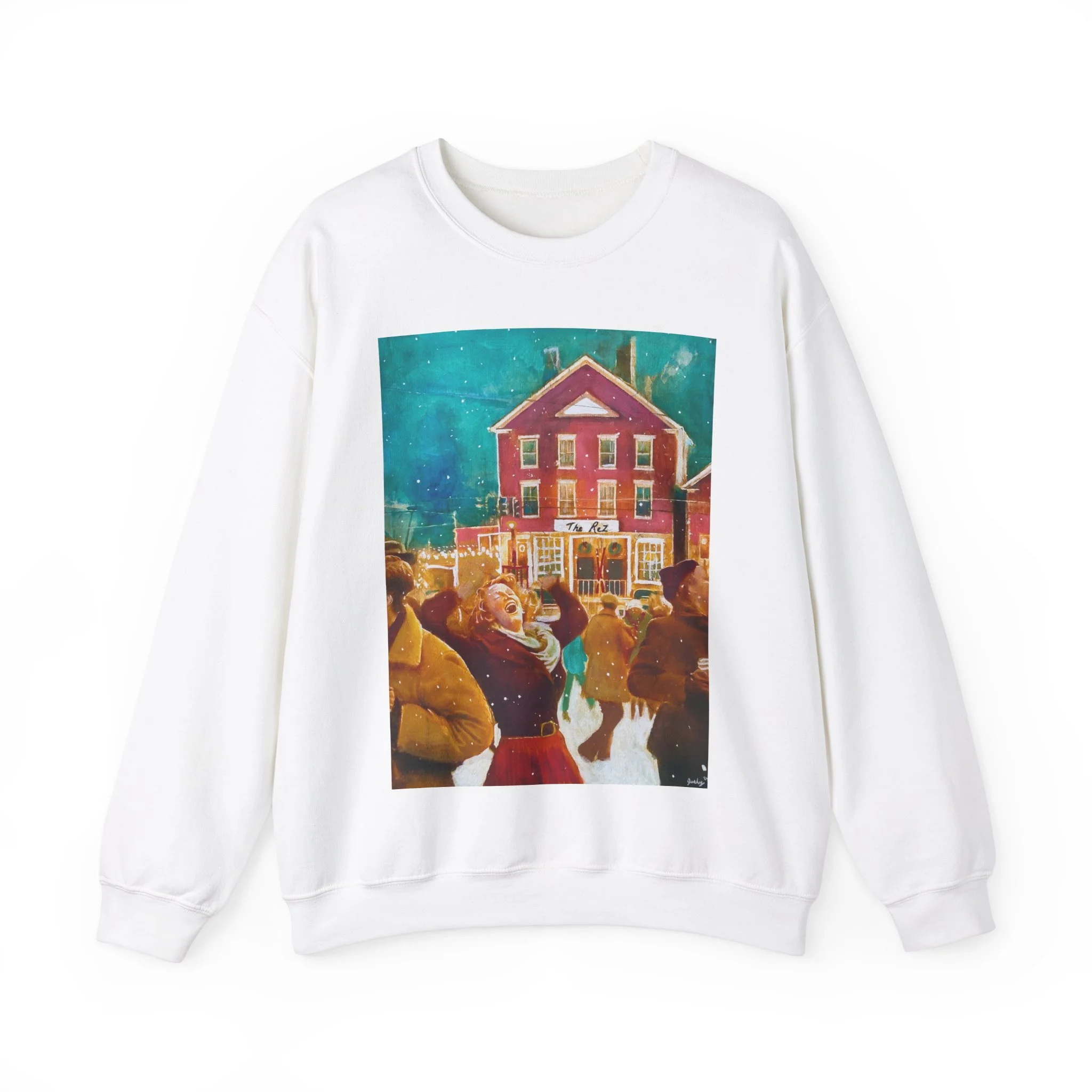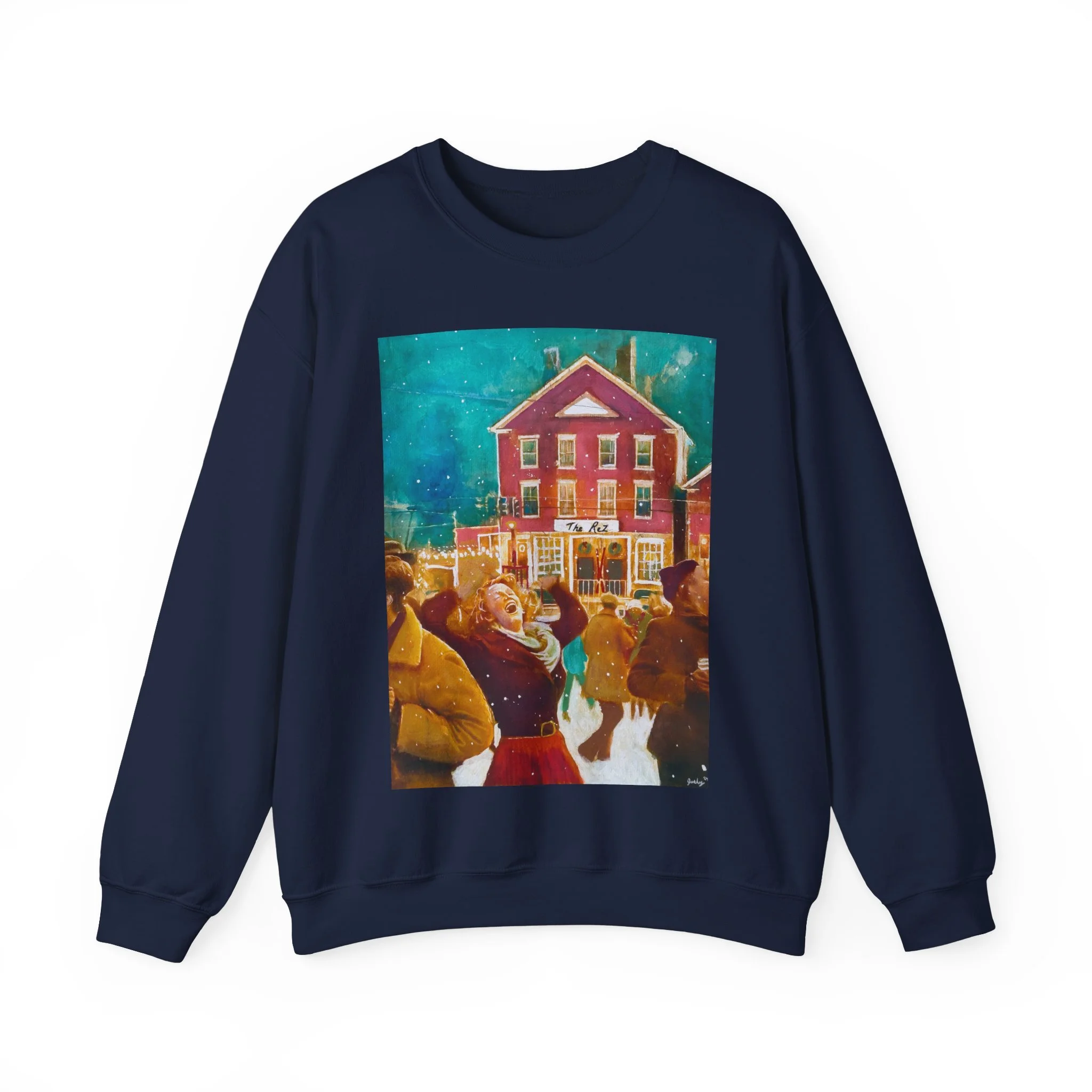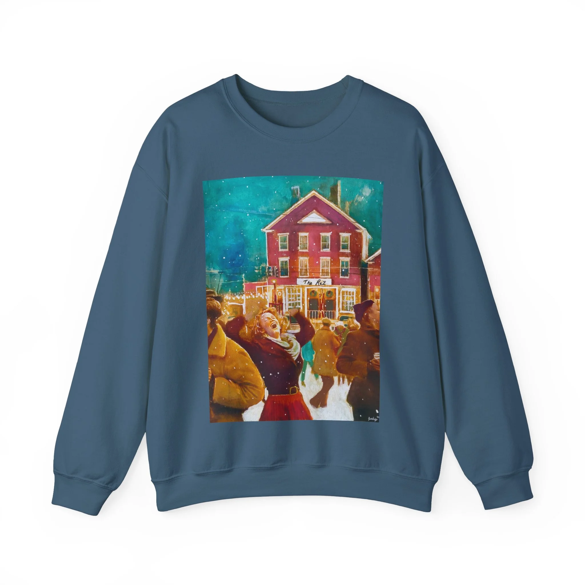 The Rez Festive Winter Scene Crewneck Sweatshirt - The Reservoir Waterbury Vermont Art Pullover