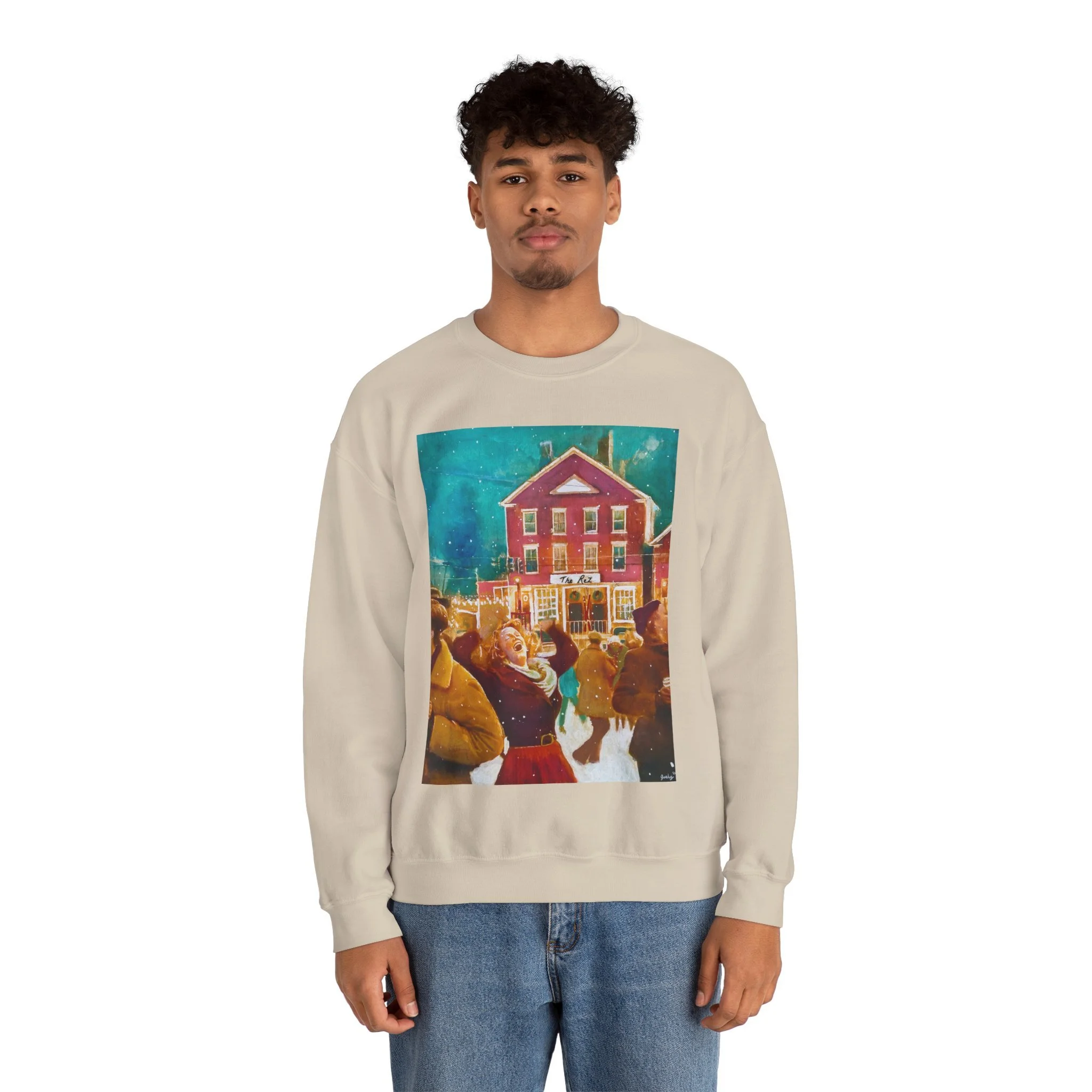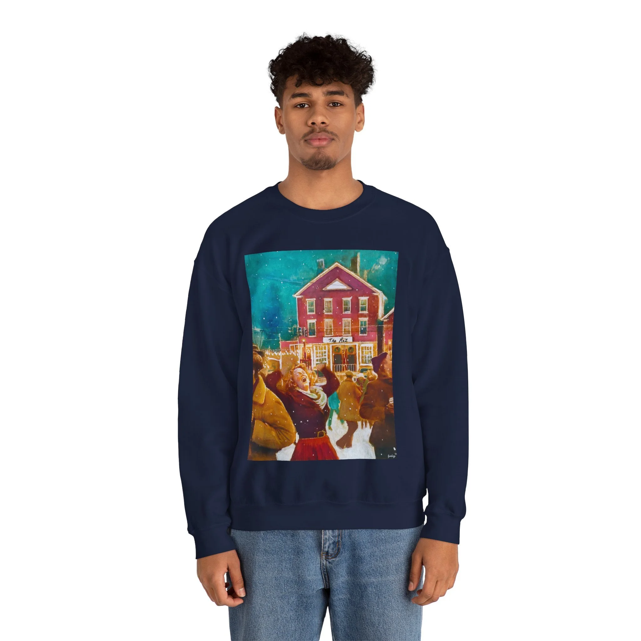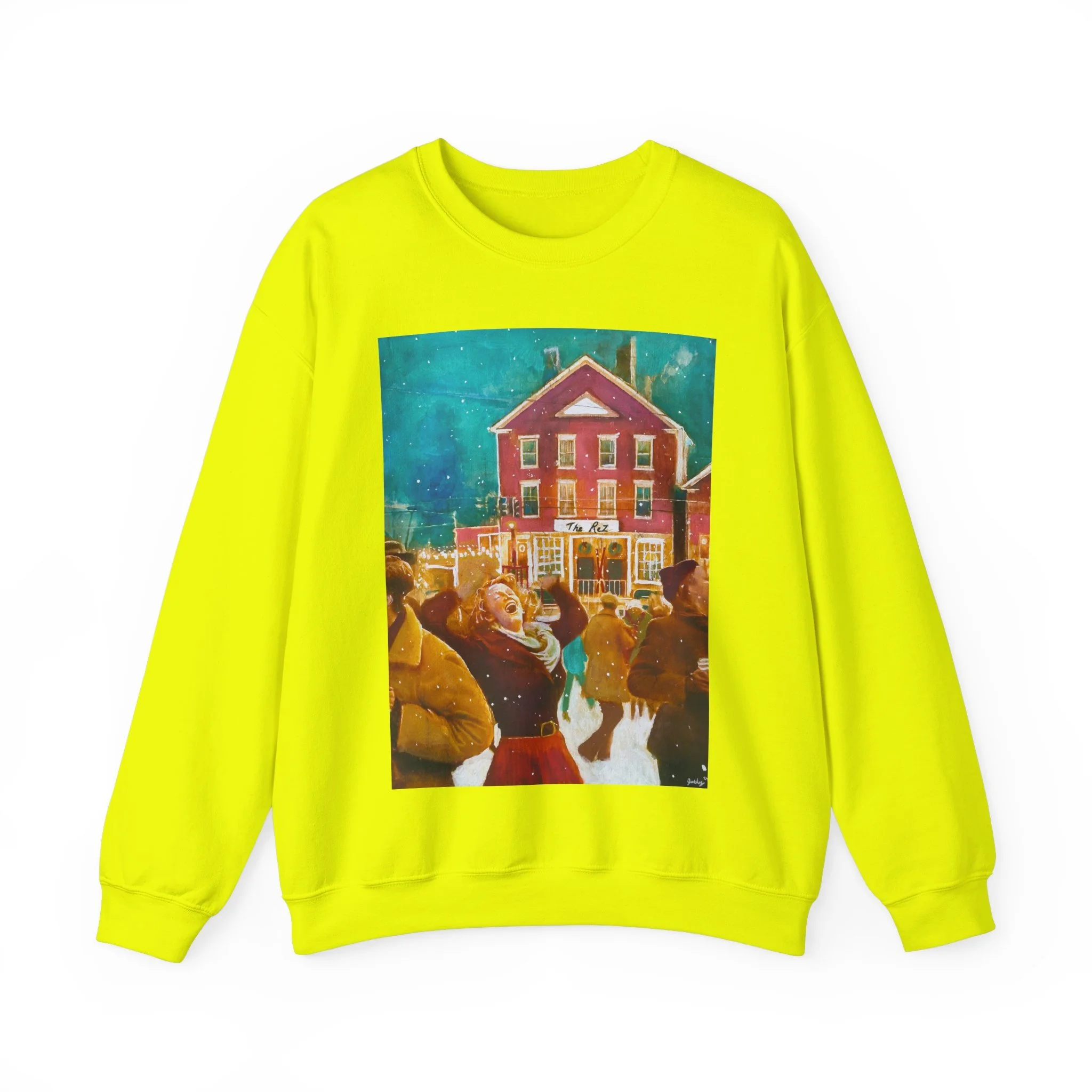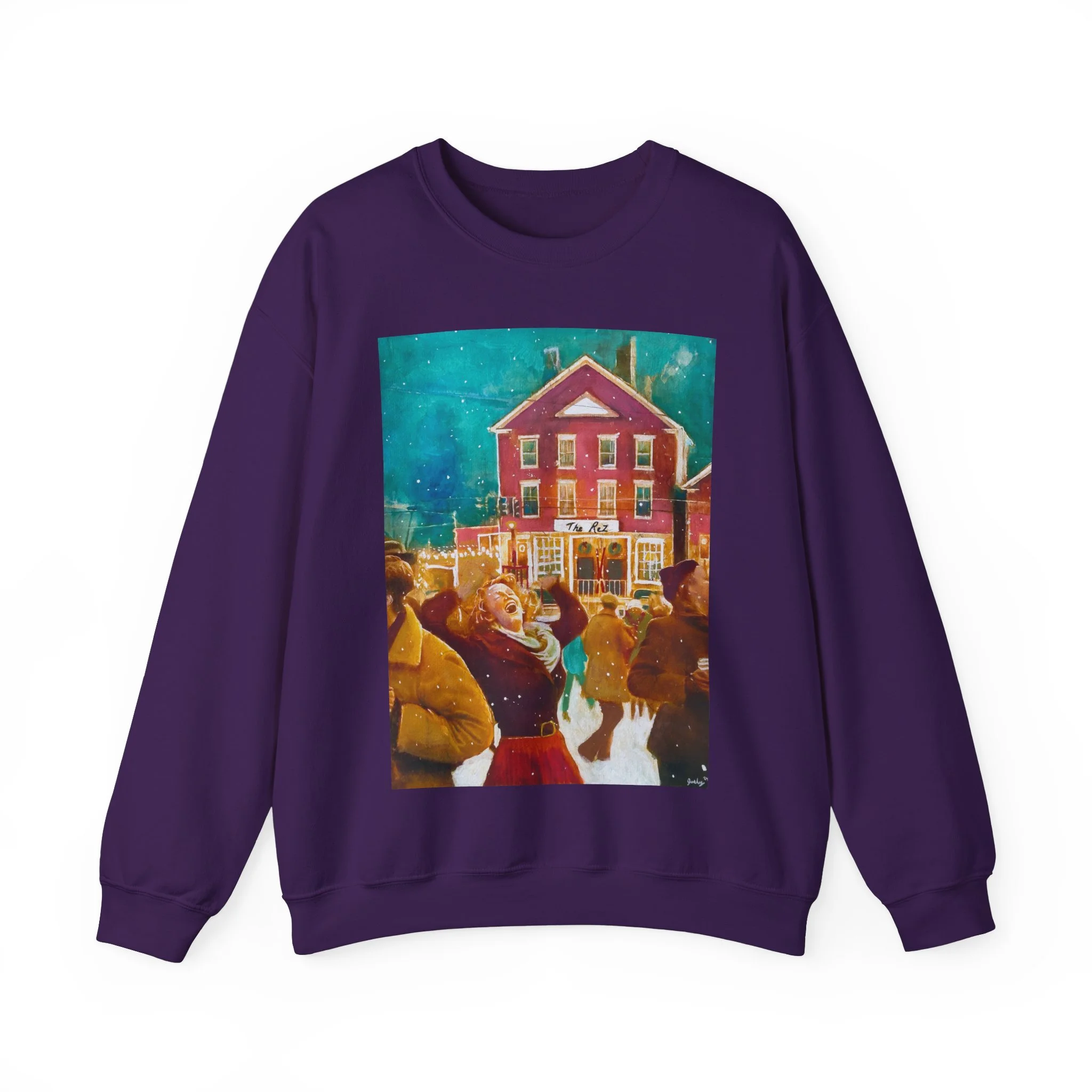 The Rez Festive Winter Scene Crewneck Sweatshirt - The Reservoir Waterbury Vermont Art Pullover