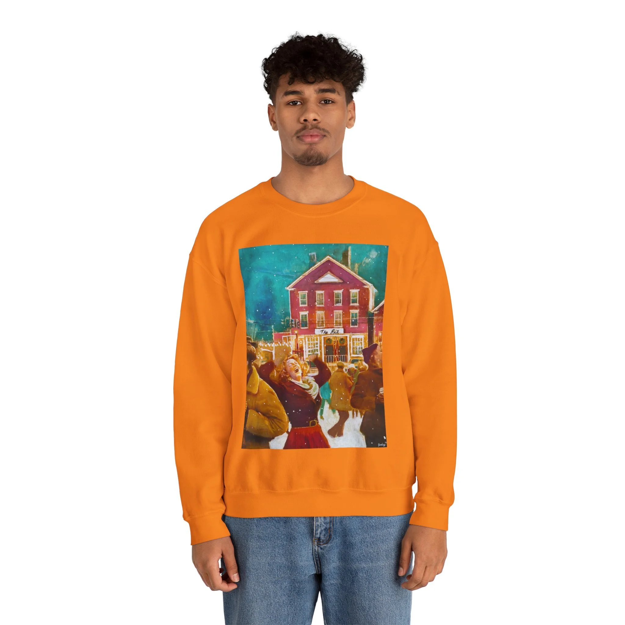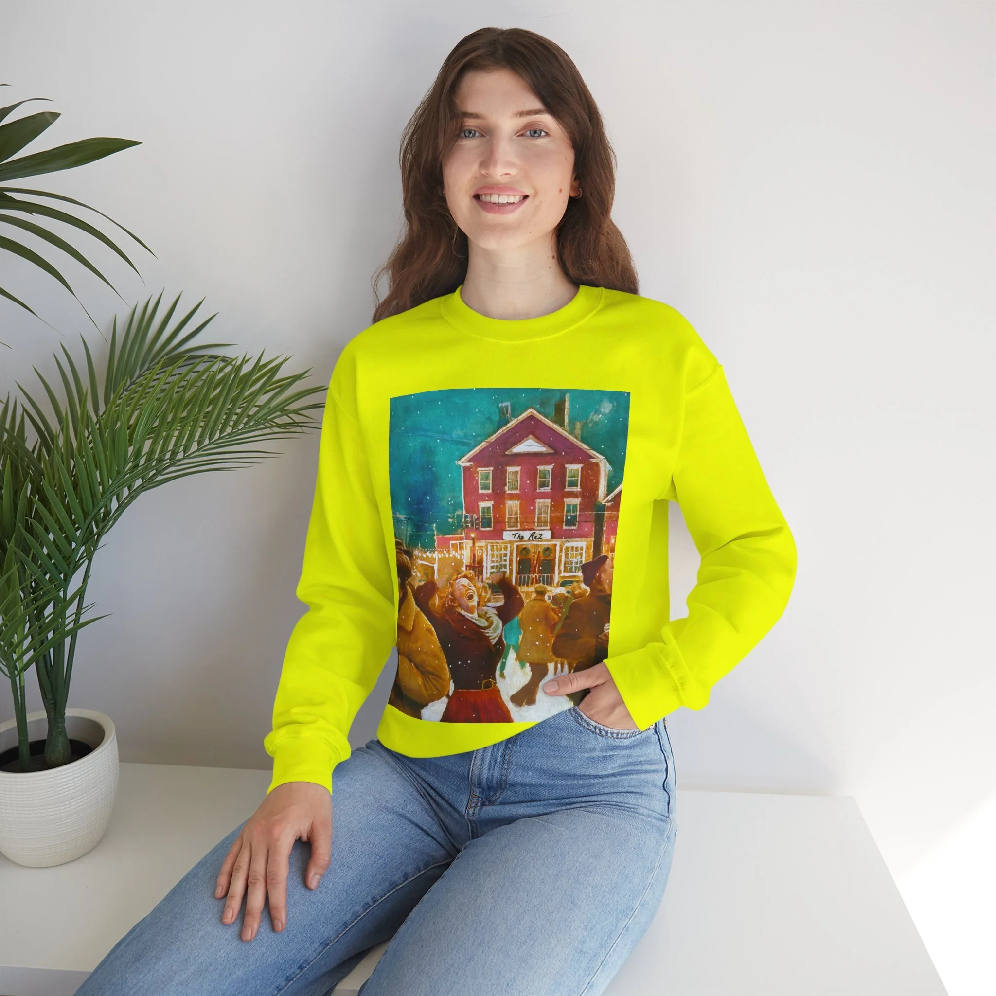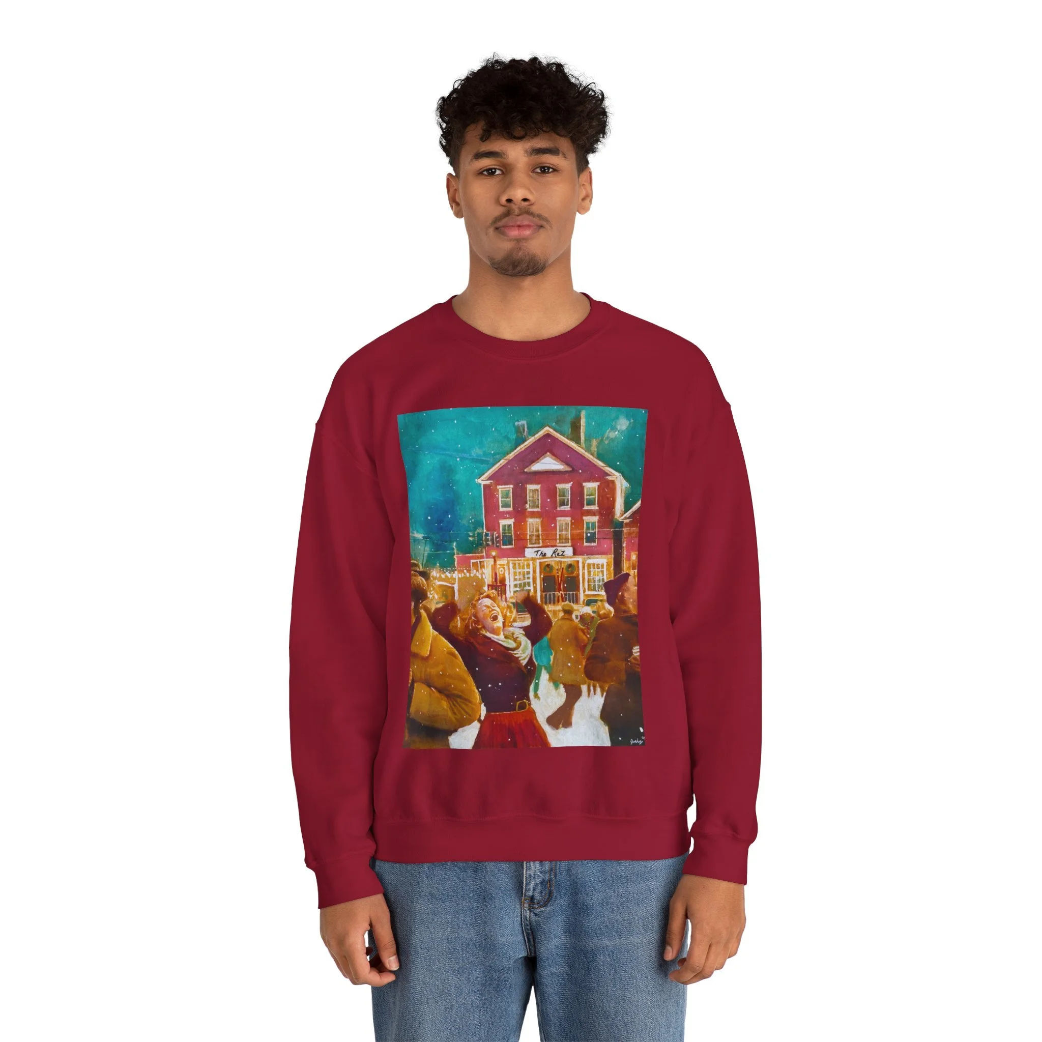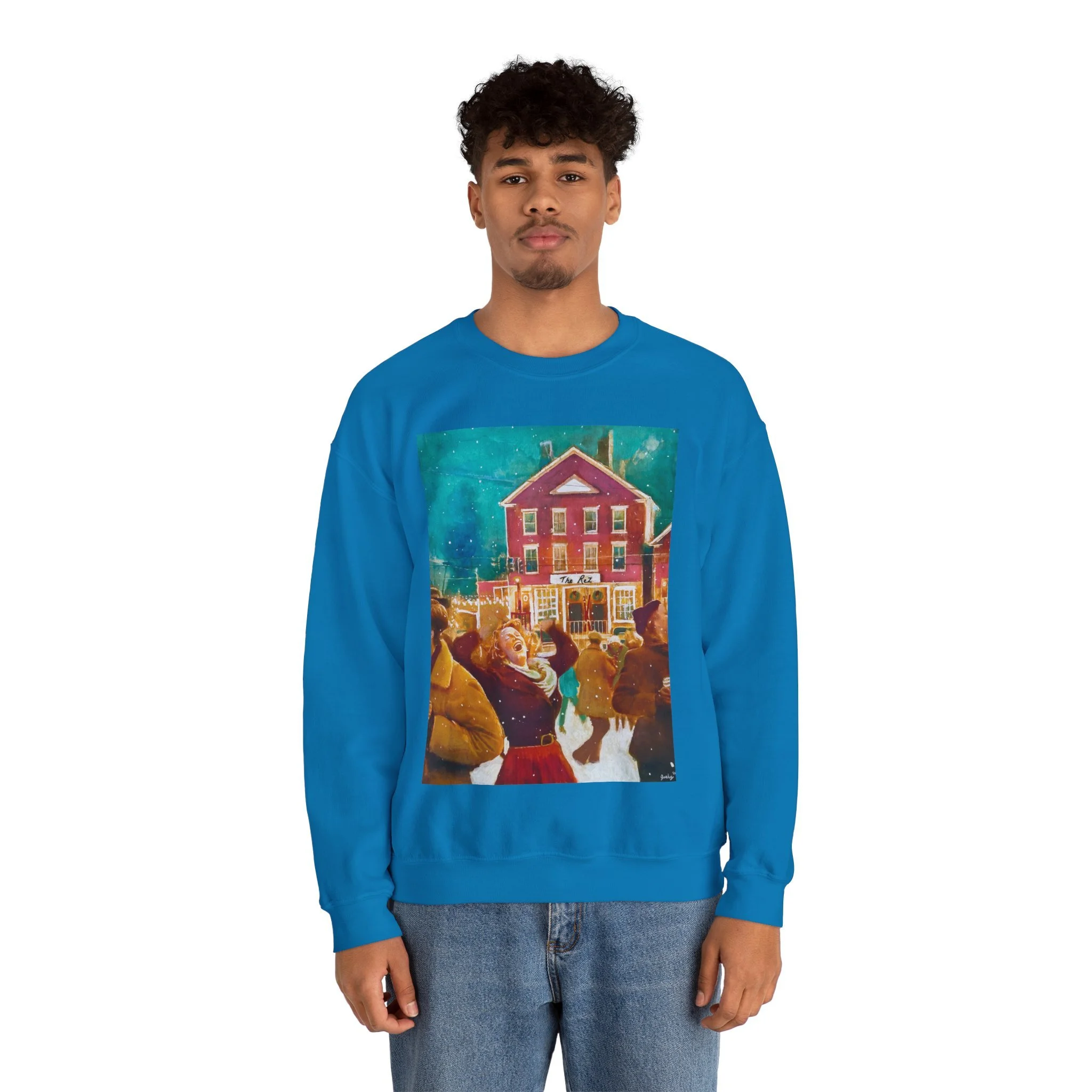 The Rez Festive Winter Scene Crewneck Sweatshirt - The Reservoir Waterbury Vermont Art Pullover
