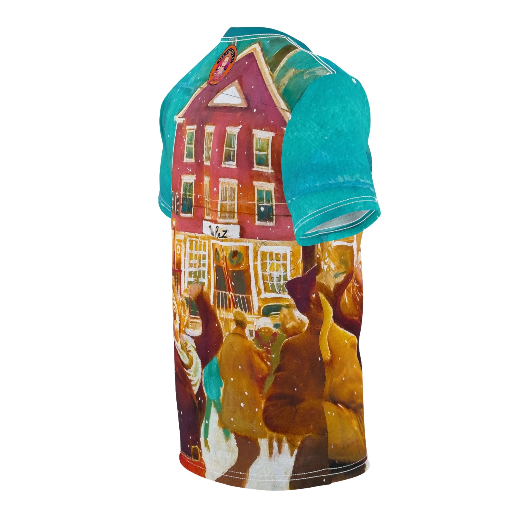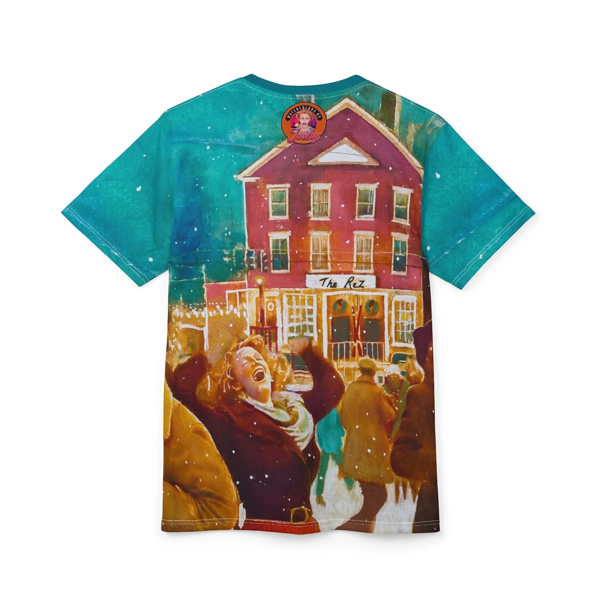 This tee features Joshy’s watercolor painting of The Rez restaurant and taproom in Waterbury, Vermont, capturing its iconic presence on a snowy day. With deep teal skies, a vintage-inspired atmosphere, and revelers enjoying the winter streets, this design celebrates the heart of a beloved neighborhood institution. Established in 2009, The Rez has been a cornerstone of Waterbury’s craft beer scene, offering fresh, creative, and locally inspired fare.