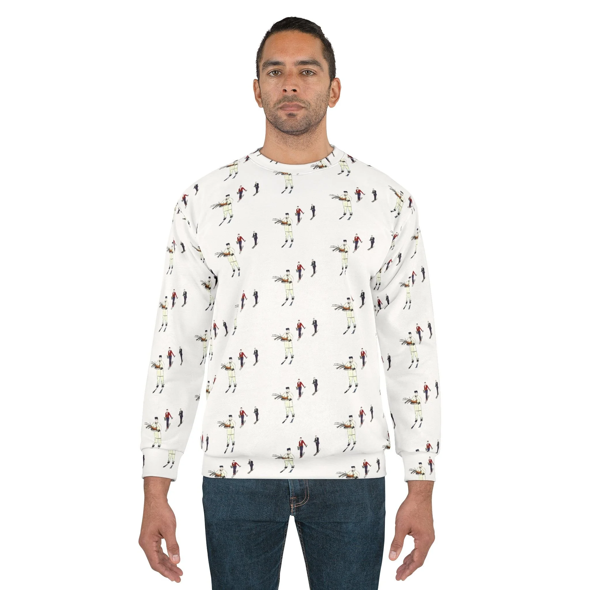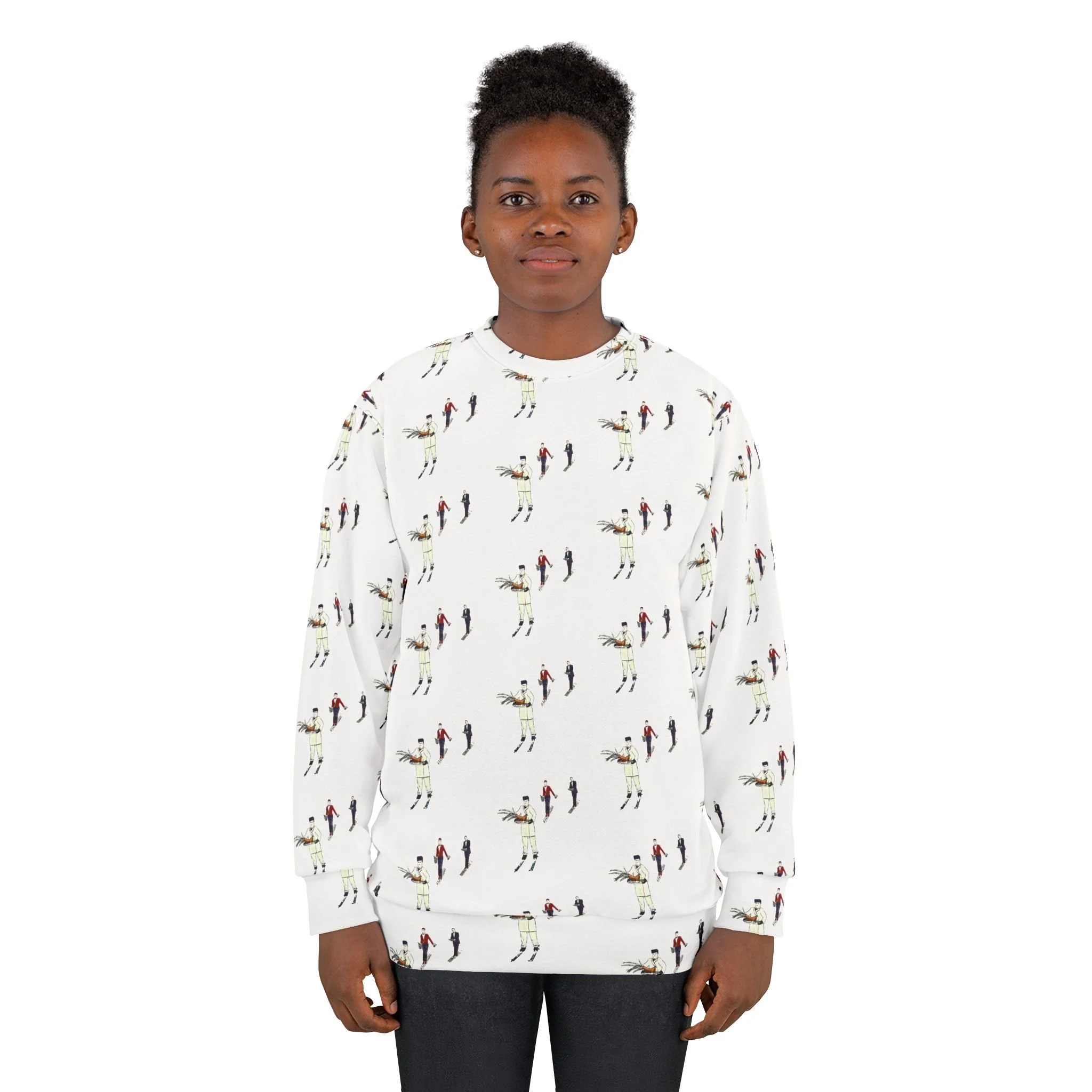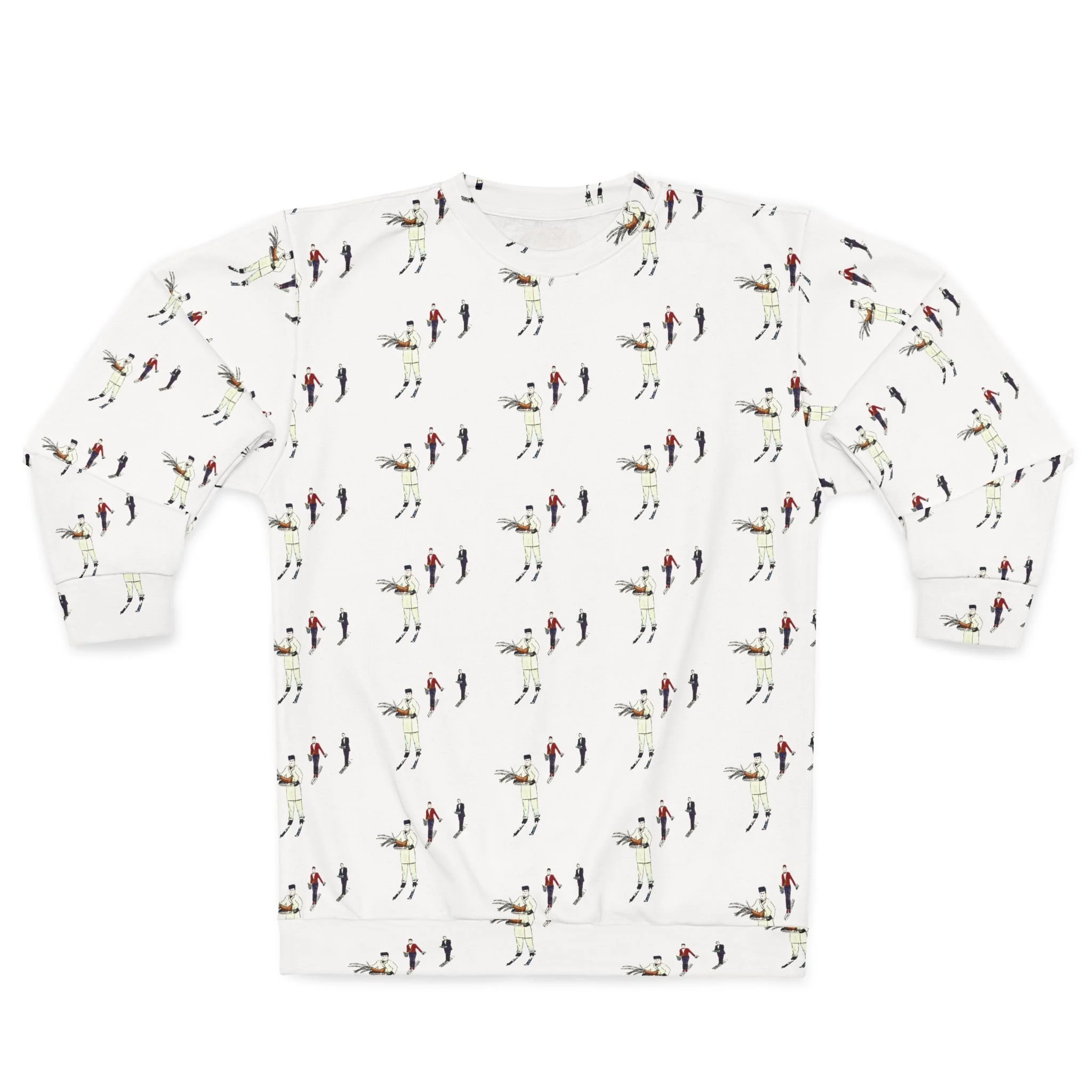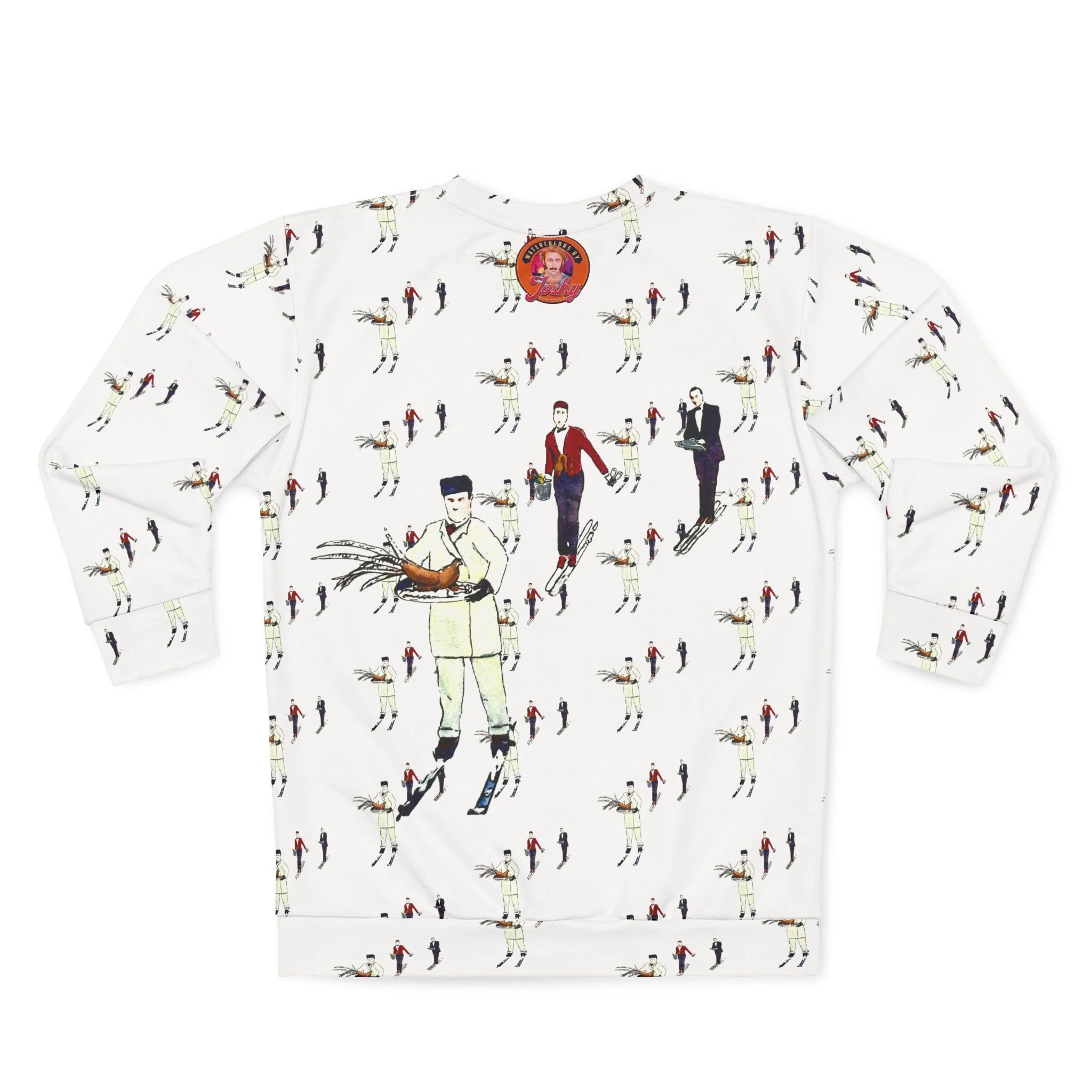 Watercolor Skiing Waiters Pattern Unisex Sweatshirt - Stowe Vermont Luxury Skiers Artisan Pullover